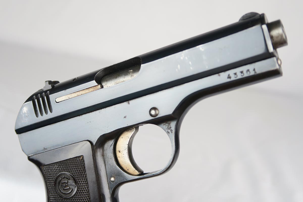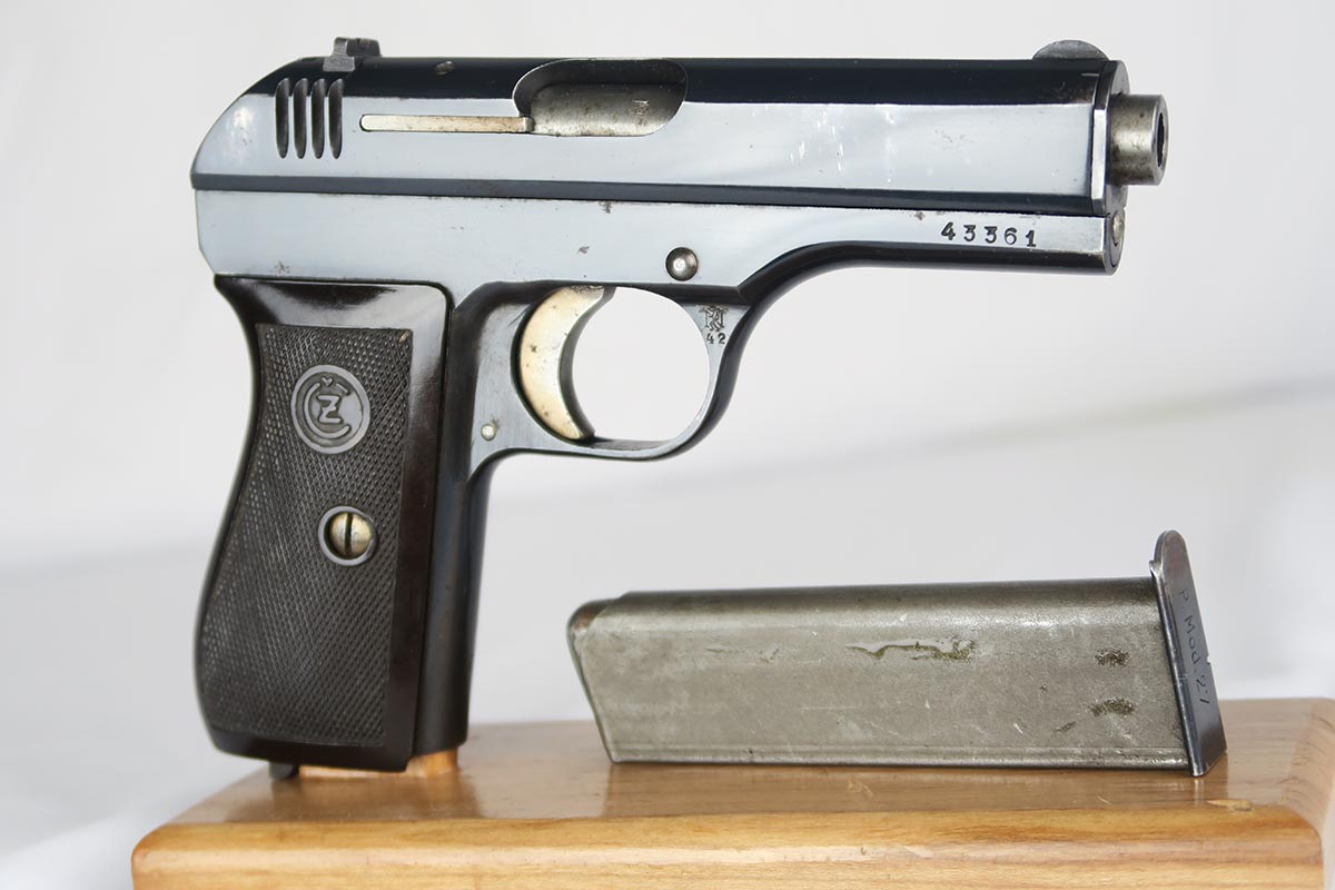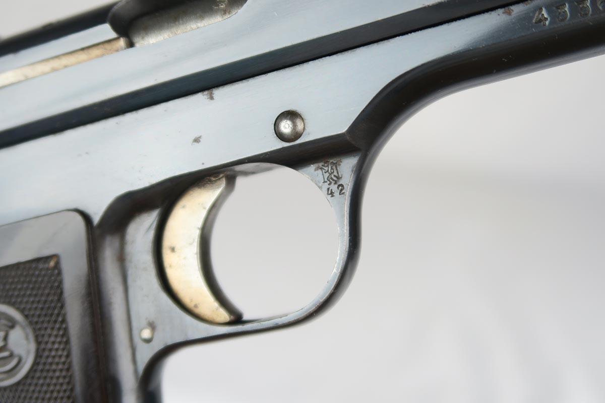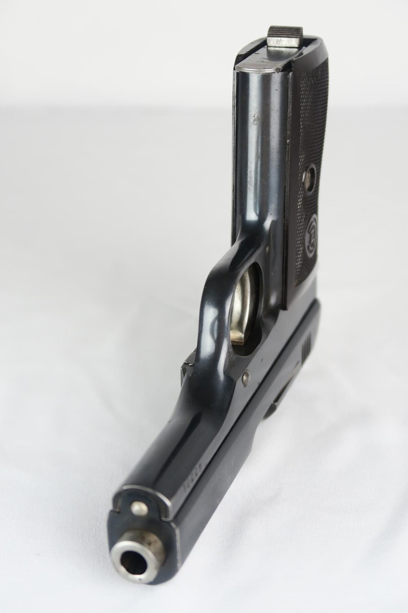 2/14/18 – This is an excellent Police CZ-27 with Eagle/K proof on trigger guard from 1942. There were only ~5500 of this variation produced, with high-polish blue and ’42 date plus Czech lion on right side trigger guard. The finish is original and rates at 97% with minor edge wear on left side slide and two small patches of finish loss on right side slide. Original grip is in very good condition but does have a minor chip. Minty bore. Magazine marked P. MOD. 27 on base plate.