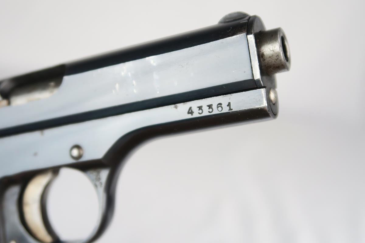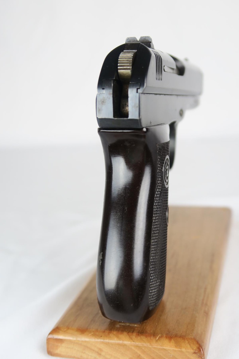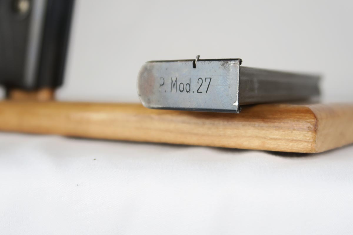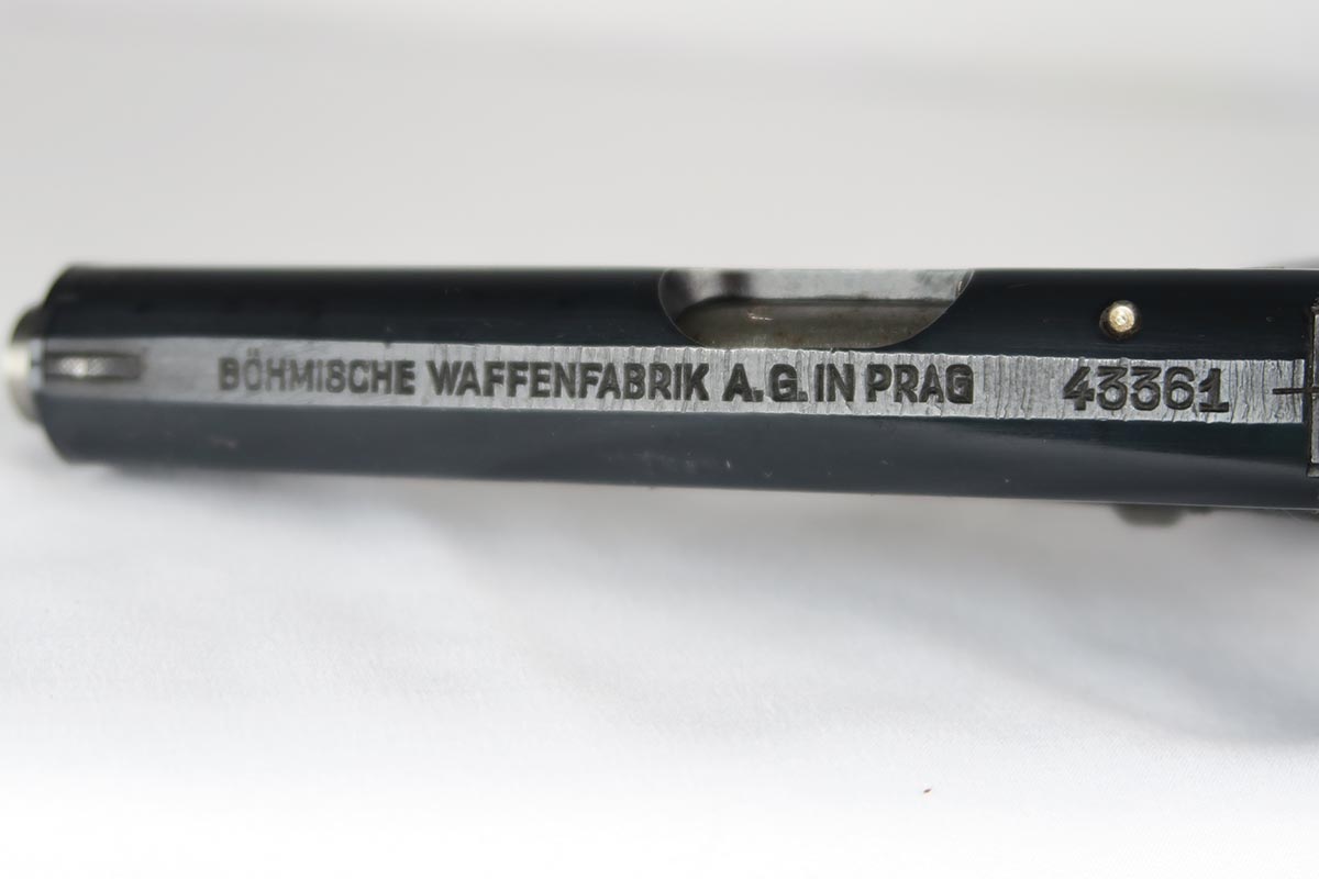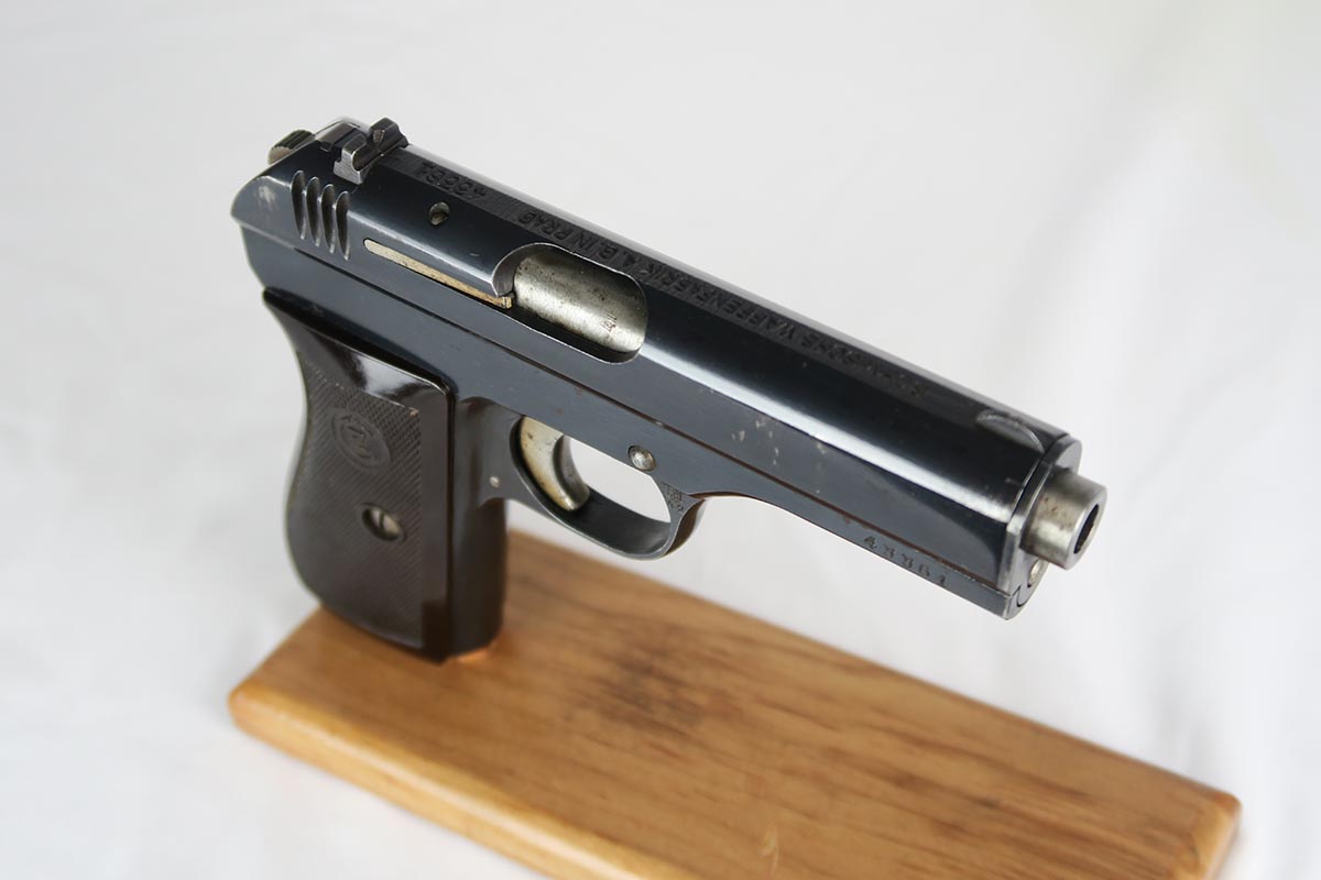 2/14/18 – This is an excellent Police CZ-27 with Eagle/K proof on trigger guard from 1942. There were only ~5500 of this variation produced, with high-polish blue and ’42 date plus Czech lion on right side trigger guard. The finish is original and rates at 97% with minor edge wear on left side slide and two small patches of finish loss on right side slide. Original grip is in very good condition but does have a minor chip. Minty bore. Magazine marked P. MOD. 27 on base plate.