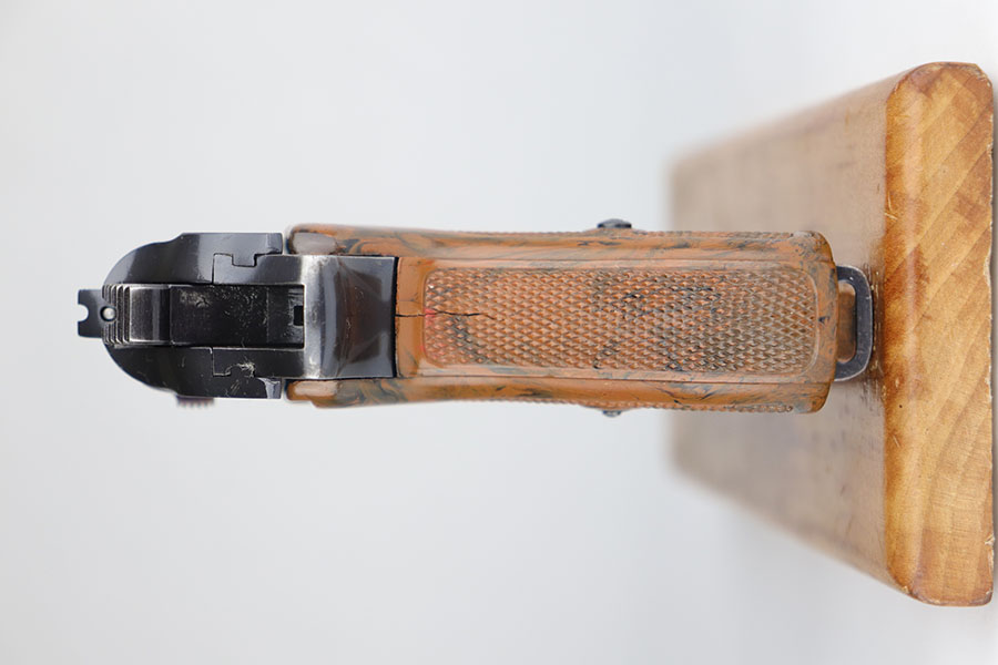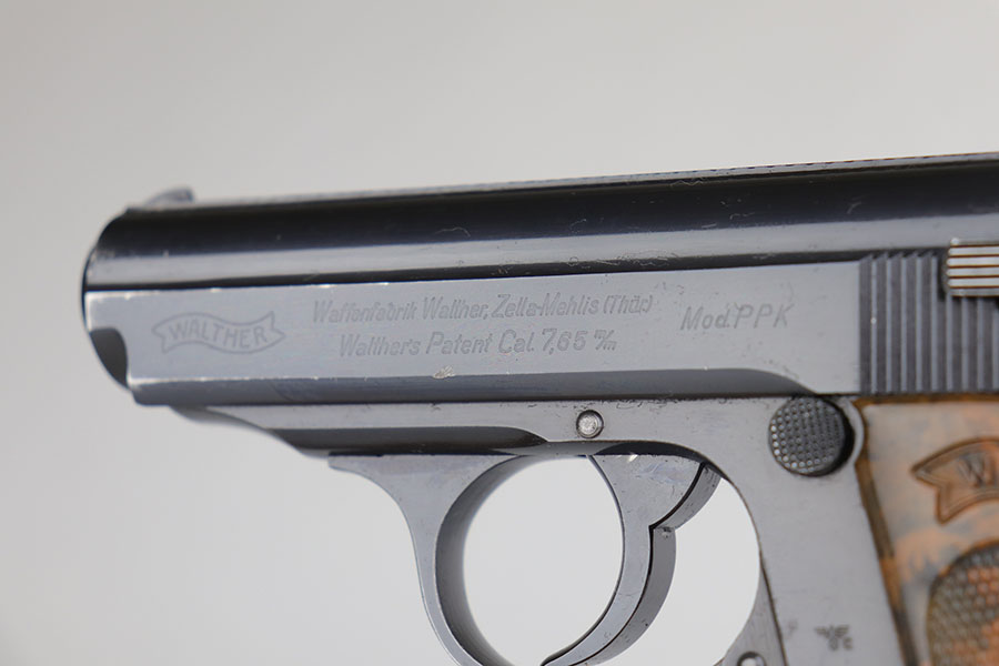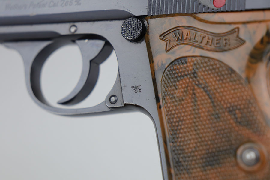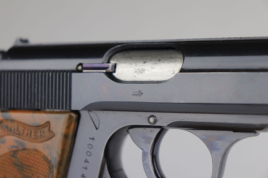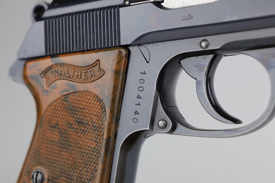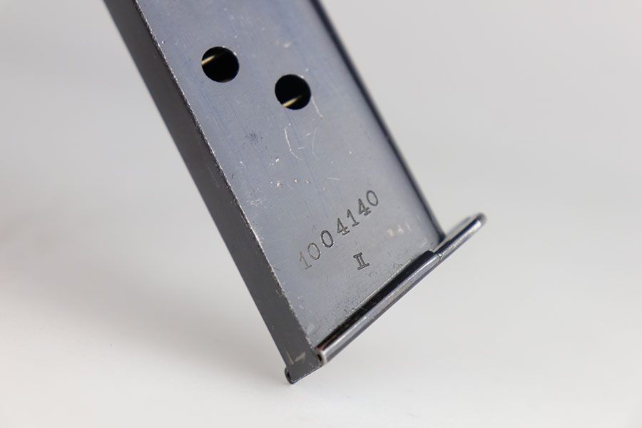 6/26/20 – This is a rare find – a police Walther PPK with million series serial and matching numbered magazine. There were only about 7,000 PPKs produced with million series numbering before they restarted in the 100,000s with a K suffix, and only a small fraction of those are issued to the police. It’s also pretty rare to find a police Walther PPK with Crown/N proofs. This one has about 97% of the high-polish blue remaining, with minor edge wear on the left side of the slide, and a bit of finish loss on the trigger guard. The magazine is numbered and matching to the gun, with the work done at the police arsenal. Pistol has a mint bore and a nice grip, aside from the common stress crack in the spine.