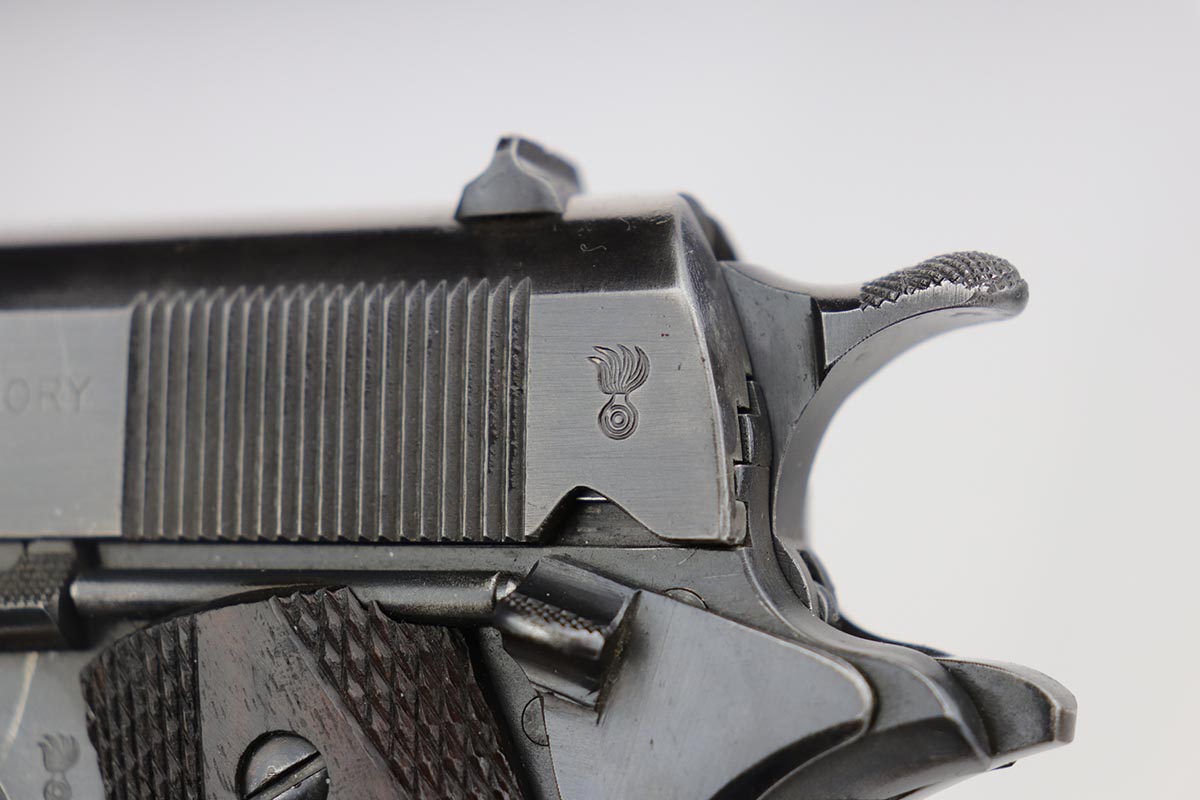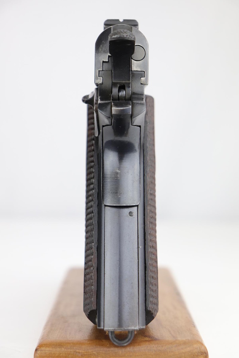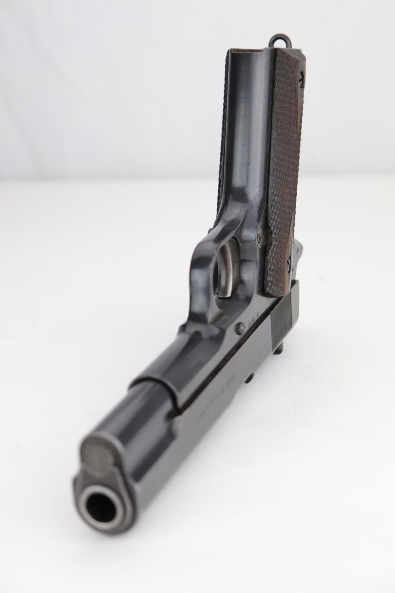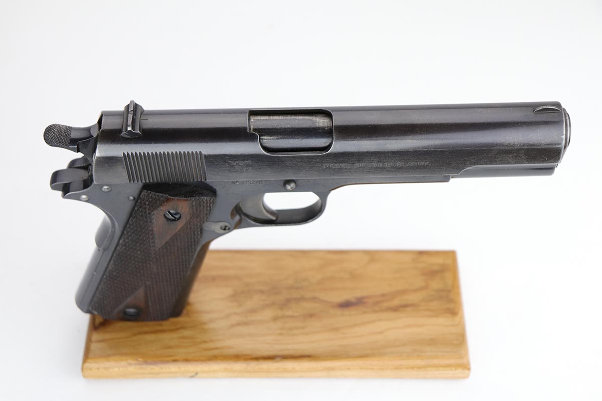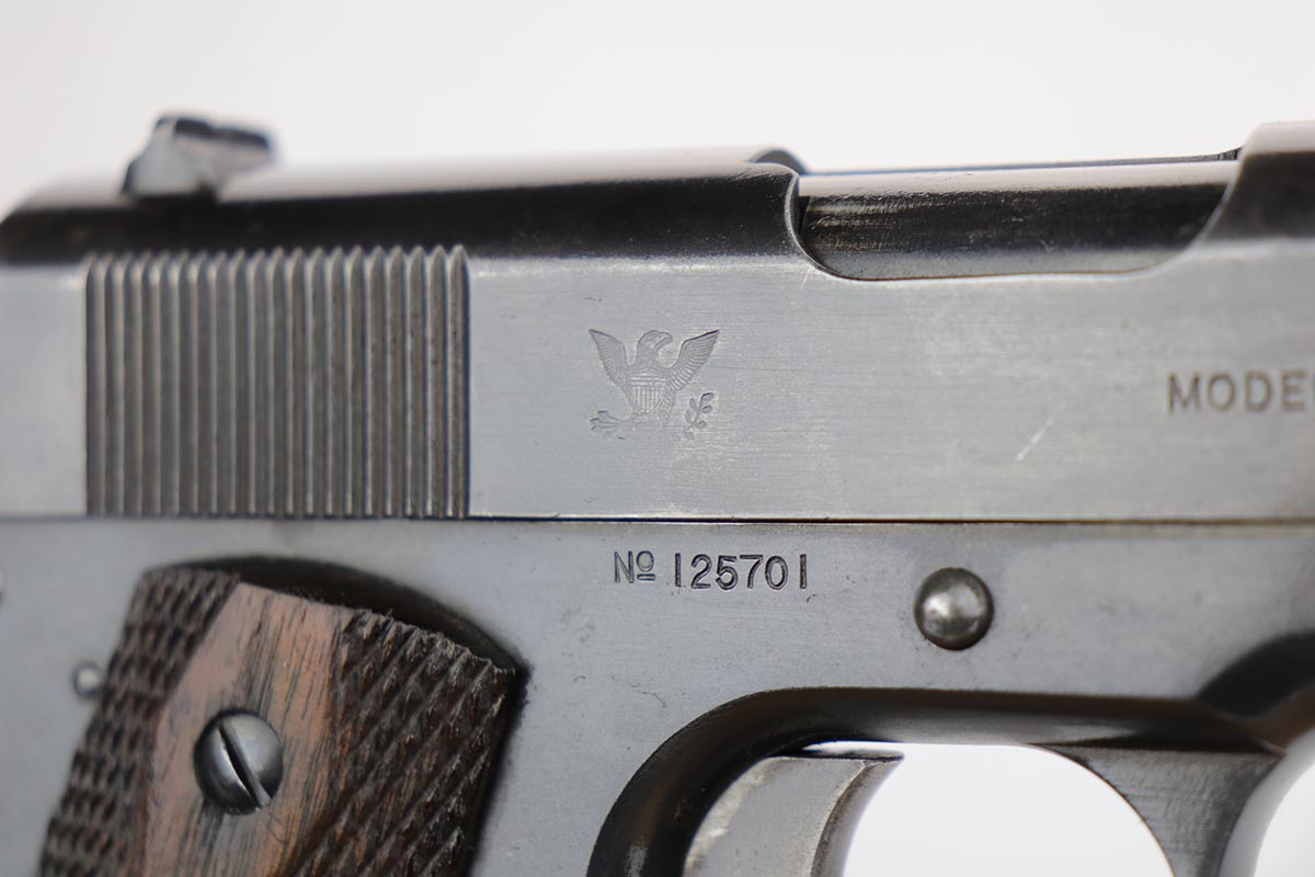 12/13/19 – This is an absolutely fantastic example of the hard-to-find Springfield Armory M1911. Made in 1915, this pistol features 95-96% original blue with just minor hints of thinning on the slide, and a bit of pinpricking on the left side of the frame and right side of the slide. But you almost never see these in such beautiful condition, and this may be the nicest we’ve offered. There were only ~30,000 of these produced from 1914-16. It has a Springfield barrel (S and P marked) with a minty bore. Two-tone magazine with lanyard loop.