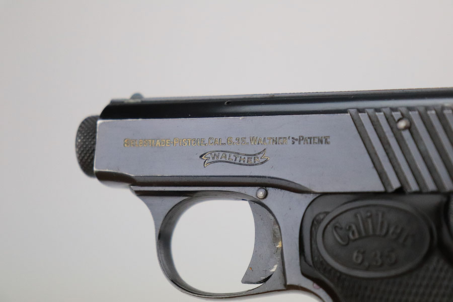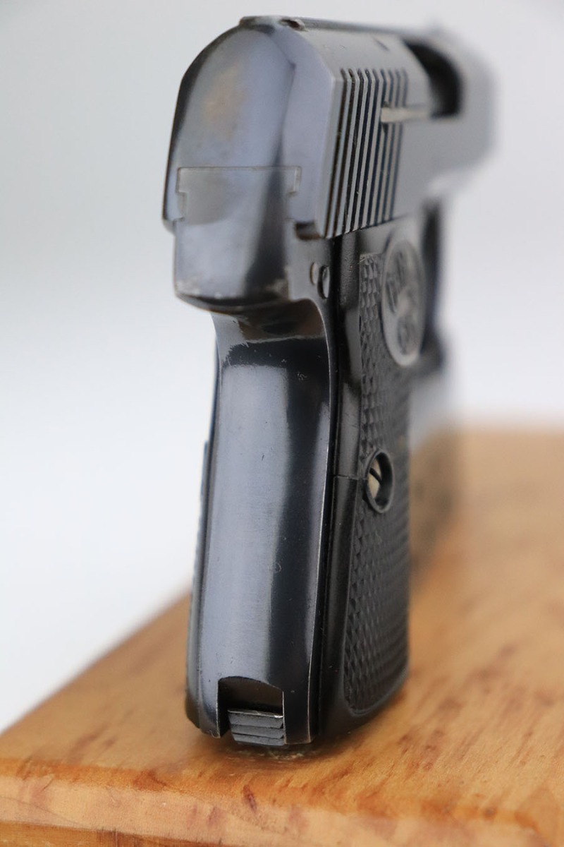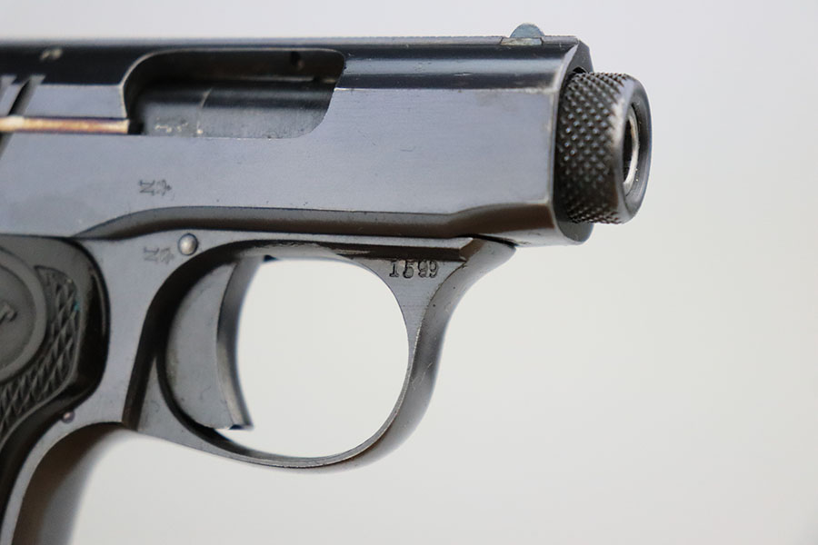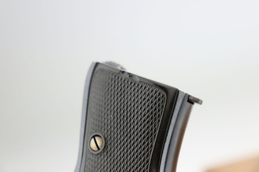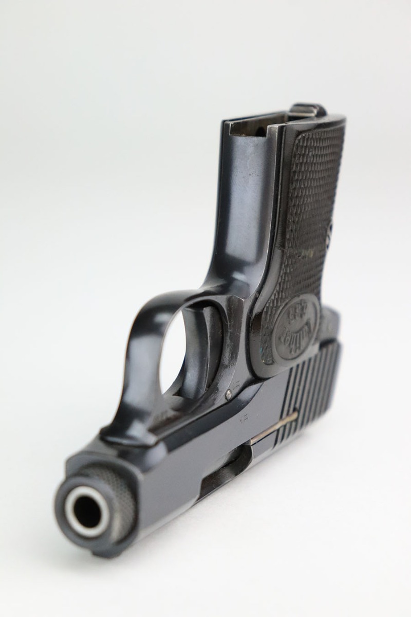 10/12/22 – This is an excellent example of a scarce Walther Model 2. There were only 19,000 Model 2 pistols produced, and this is one of the nicer ones you’ll see. It has about 97% of the original blue remaining with just some minor wear/patina on the back of the slide/frame, and a little bit of discoloration on the right side of the slide. The bore has strong rifling but unfortunately has some pitting throughout. Original grips but the left panel has a small chip at the bottom, and the right panel is cracked in half but repaired with glue.