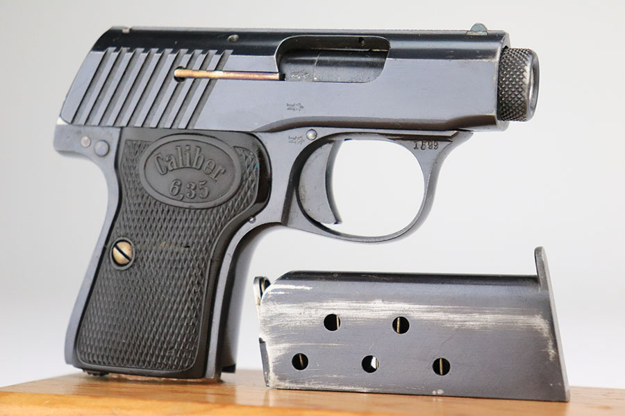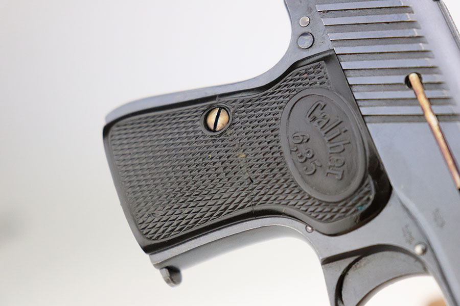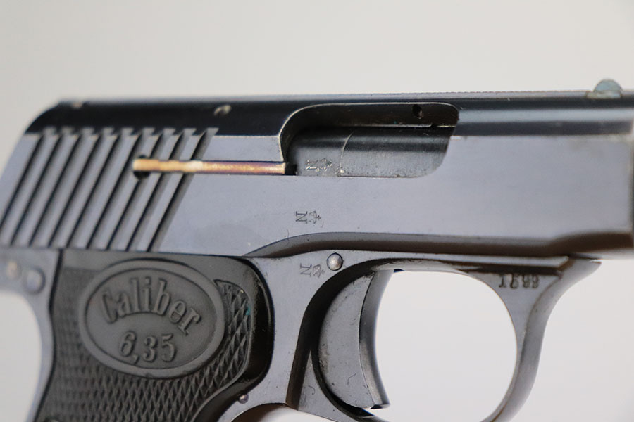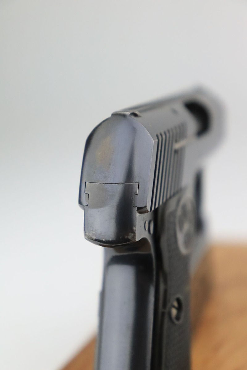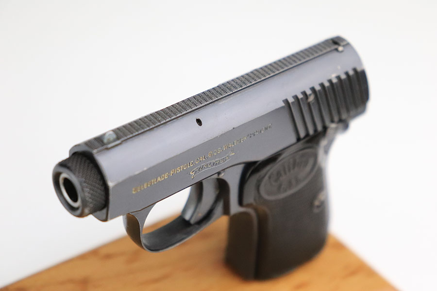10/12/22 – This is an excellent example of a scarce Walther Model 2. There were only 19,000 Model 2 pistols produced, and this is one of the nicer ones you’ll see. It has about 97% of the original blue remaining with just some minor wear/patina on the back of the slide/frame, and a little bit of discoloration on the right side of the slide. The bore has strong rifling but unfortunately has some pitting throughout. Original grips but the left panel has a small chip at the bottom, and the right panel is cracked in half but repaired with glue.