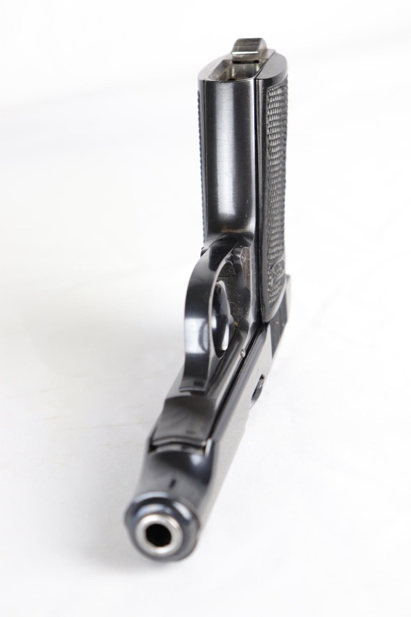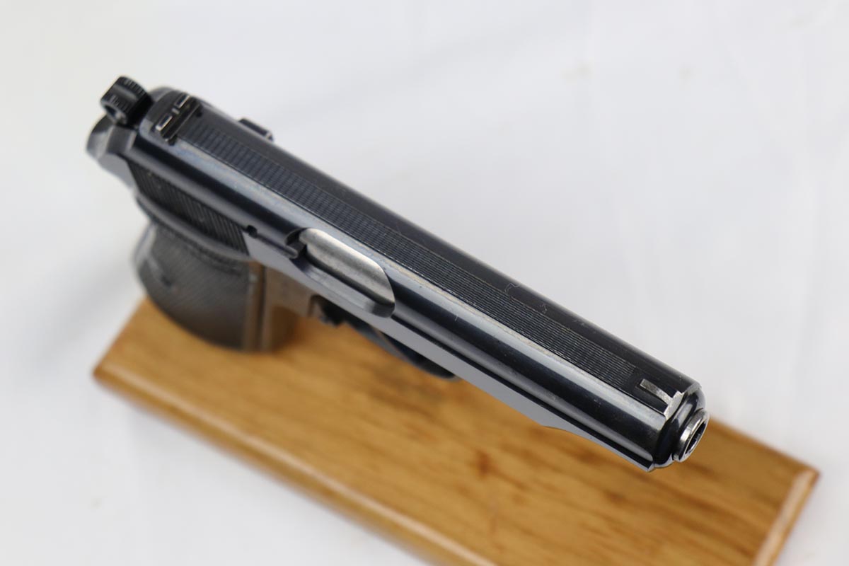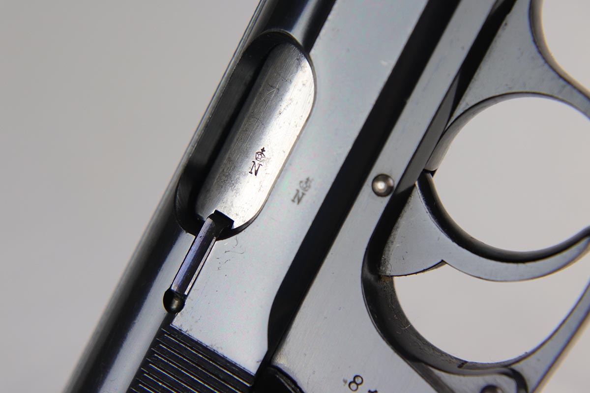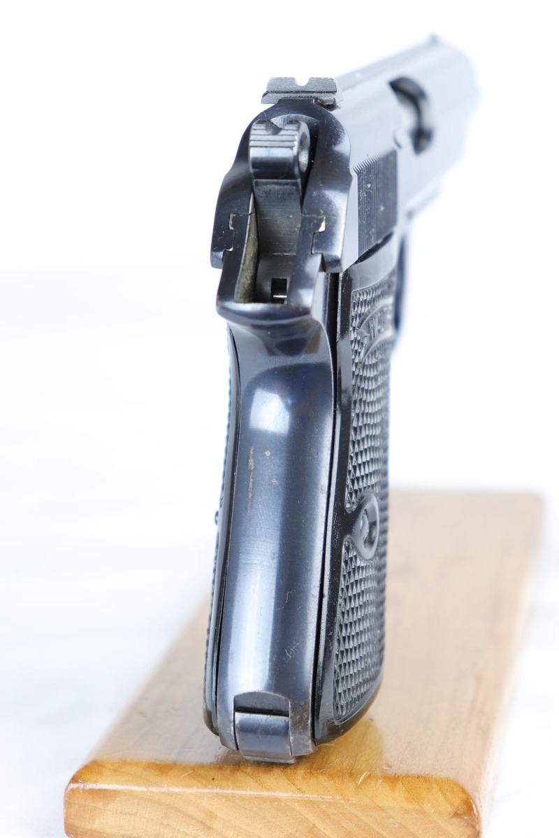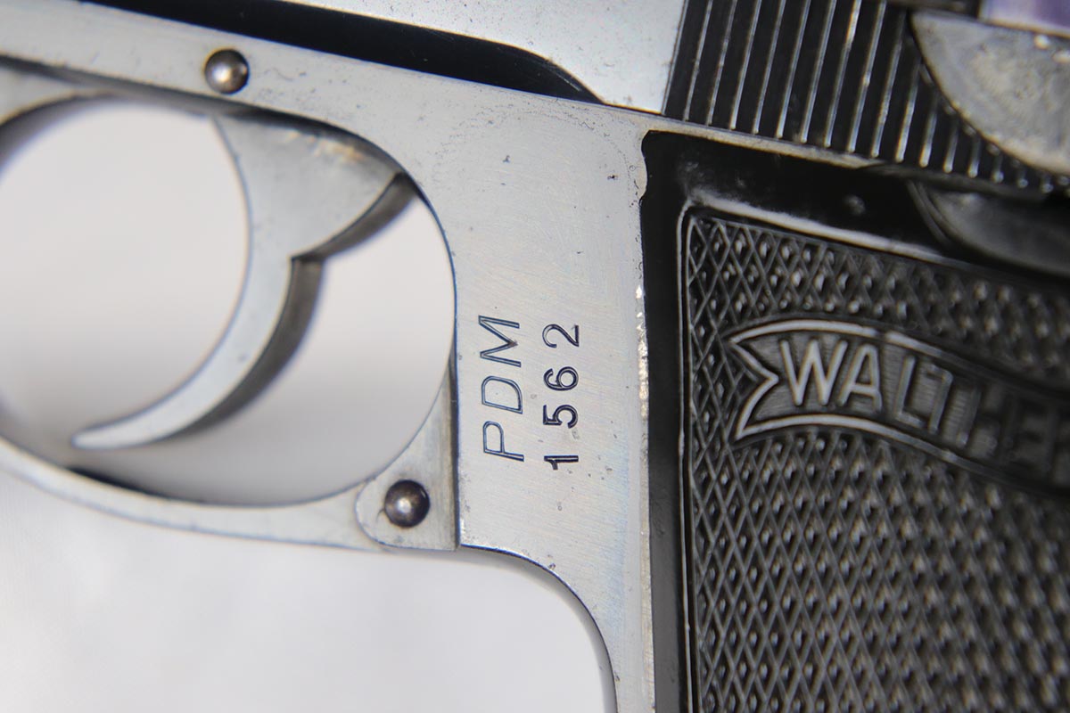5/21/18 – This is a rare PDM Walther PP, manufactured around 1935.  The pistol is all correct and original, and the bluing rates at about 97% with wear on both sides of the slide, near the muzzle.  In 1935, Himmler ordered about 1800 PDM marked PP’s as head of all German Internal Security.  PDM stands for Police Department of Munich, and the order was unique for the following reasons.  These pistols came with a bottom release magazine, while all other 7.65mm PP’s had a push button mag release.  The proper PDM magazine will have no notch for the push button release, which the magazine in this listing shows.  These pistols also have a strengthened ‘fluted’ barrel, visible on the muzzle end of the barrel, which a standard PP slide would not fit.  This pistol falls in the correct serial range.  Excellent bore.