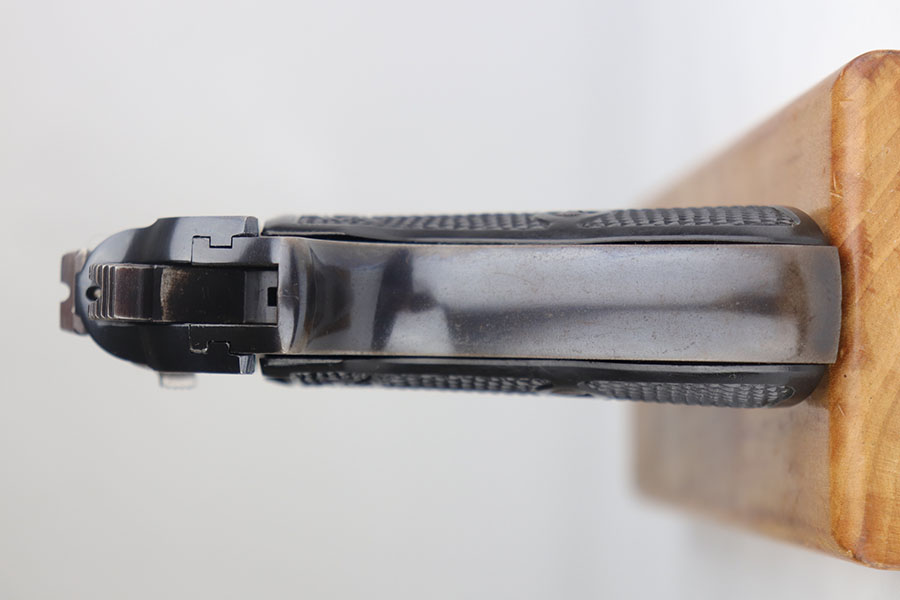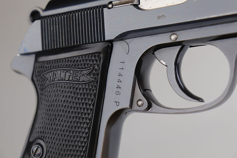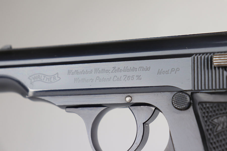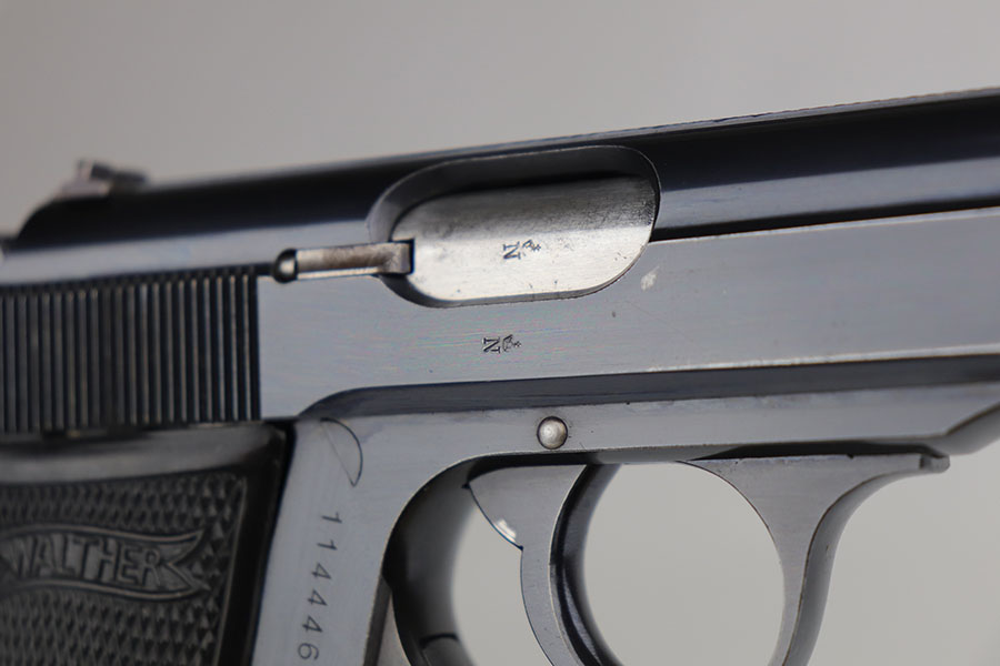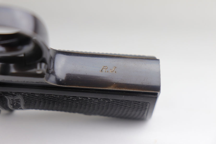 7/21/20 – This is a scarce Walther PP with RJ marking on front strap to denote issue to the Reich Justice Ministry. There were fewer than 5,000 of this variation produced, and this one has about 95% of the original, high-polish blue remaining. Gorgeous profile with just a bit of muzzle wear on each side, but there is some thinning on the back strap, and notable patina on both straps. Mint bore. Excellent grips and banner only magazine.