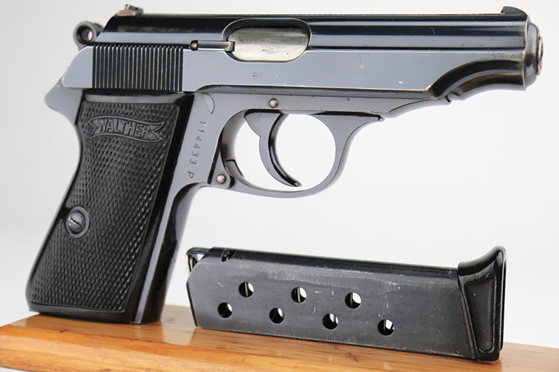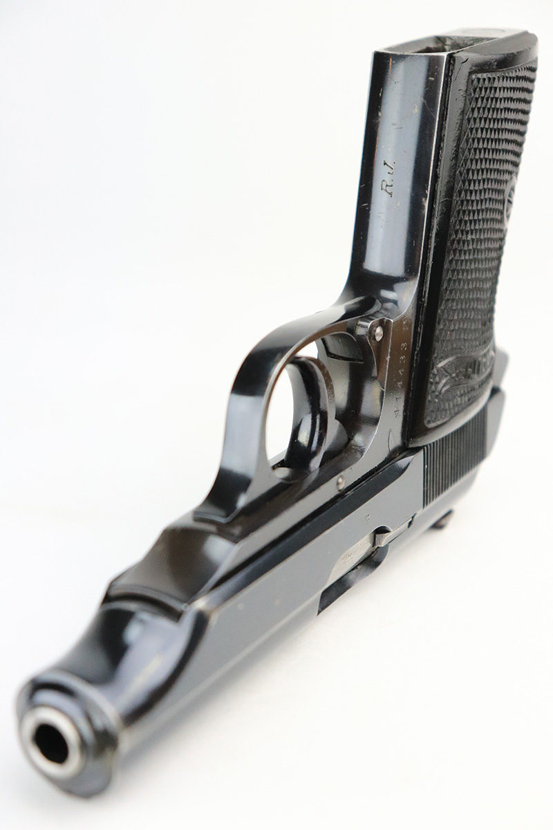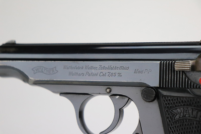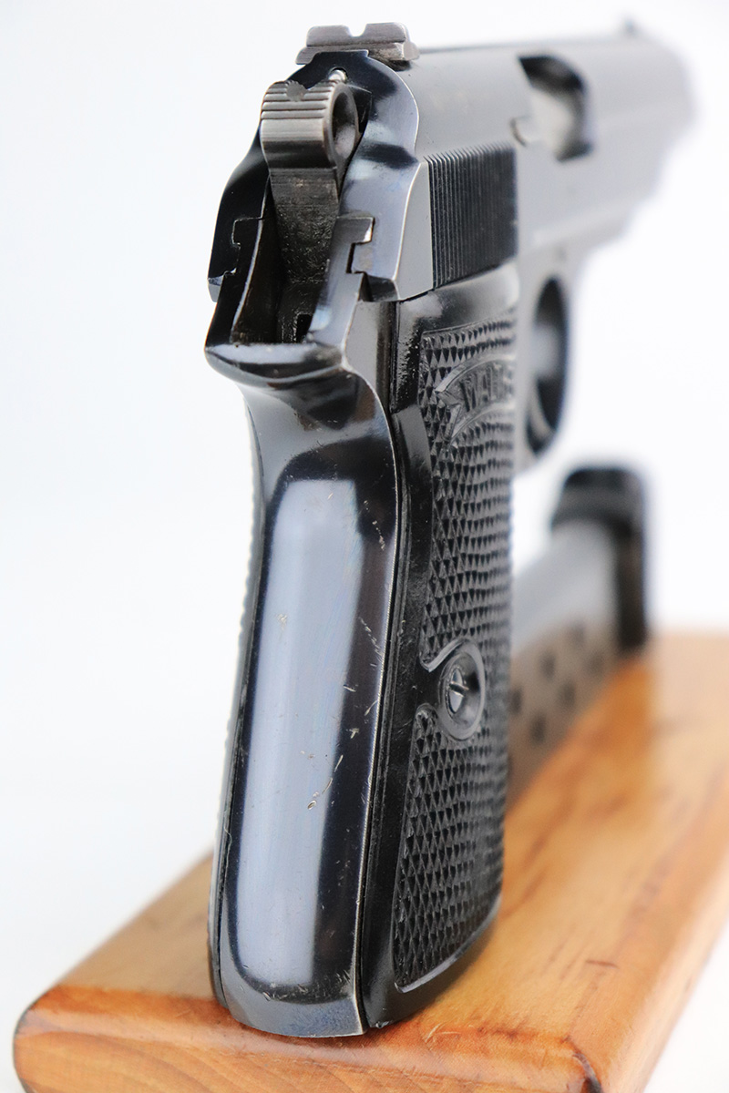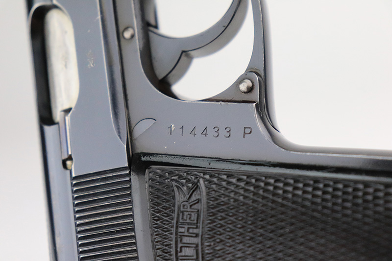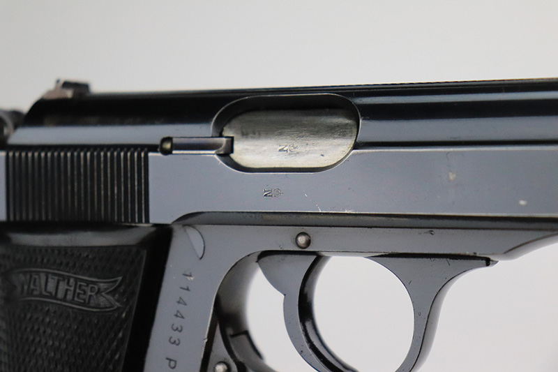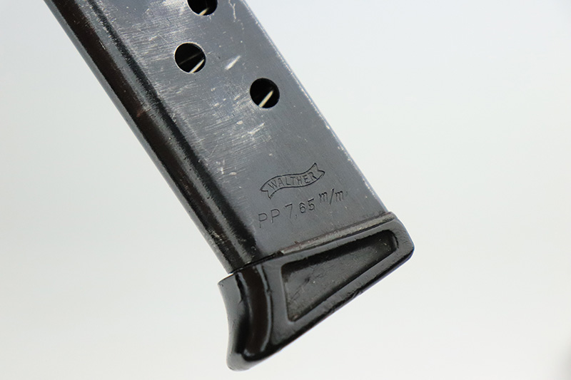 9/27/22 – This is an excellent example of a scarce Walther PP with RJ marking on front strap to denote issue to the Reich Justice Ministry. There were fewer than 5,000 of this variation produced, and this one has about 95% of the original, high-polish blue remaining. Most of the wear is around the muzzle, but there is also very minor wear around the high edges of the slide, and an area of light spotty wear at the back right of the slide. A few very light scratches along the right side of the slide. Some tiny dings and scratches on both grip straps. Comes with excellent period-correct black bakelite grips and a wartime finger extension magazine. Minty bore.