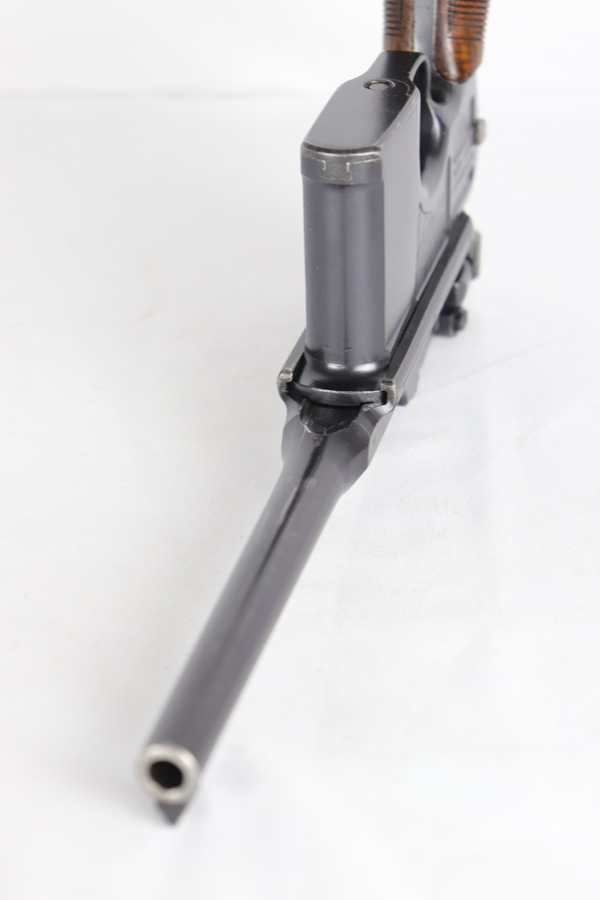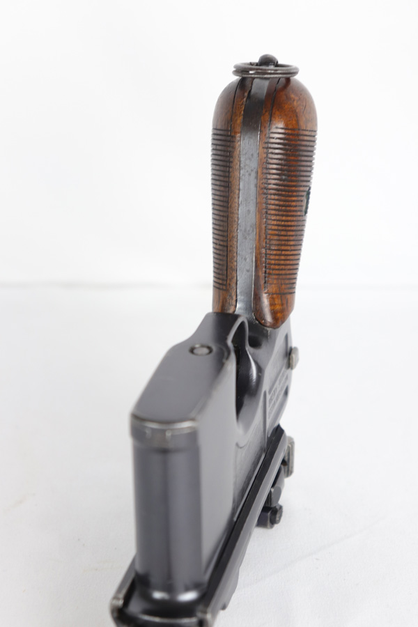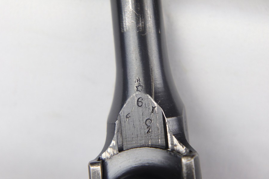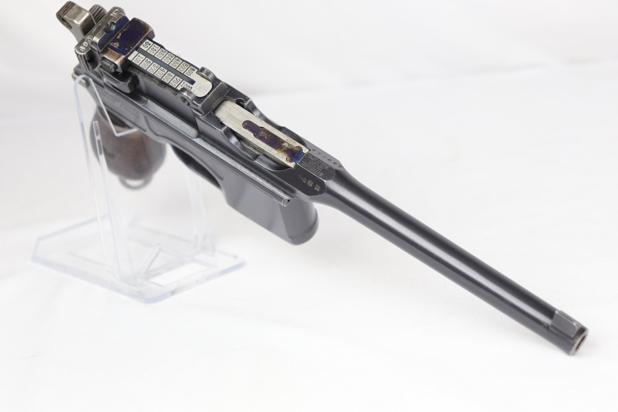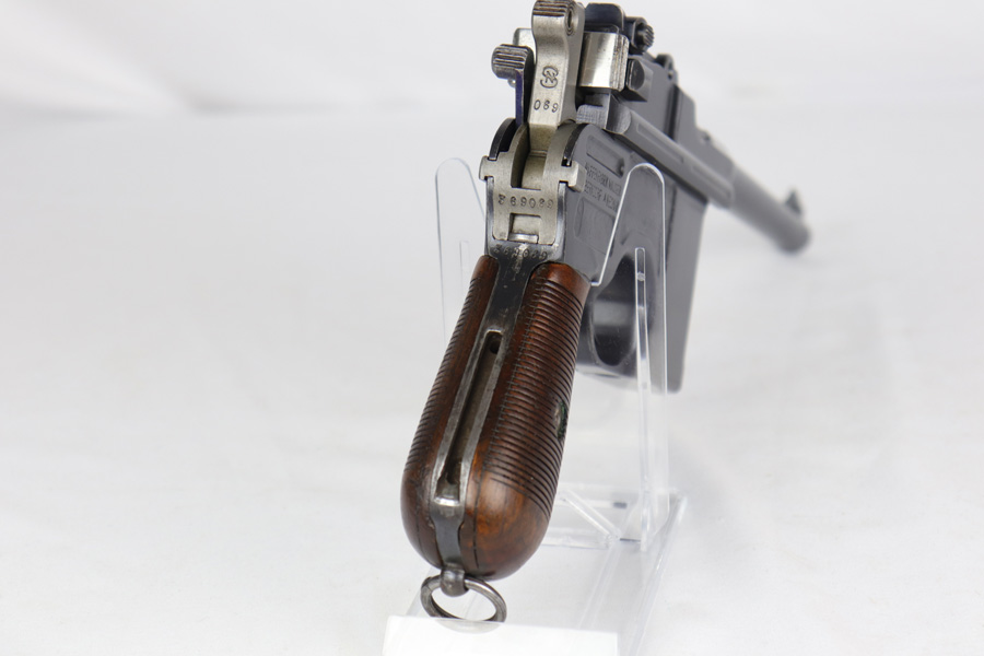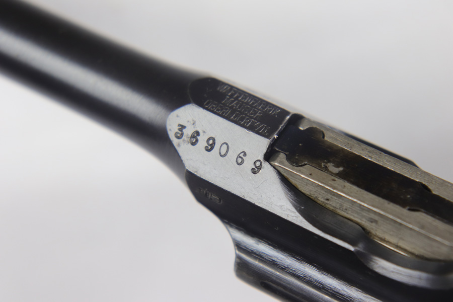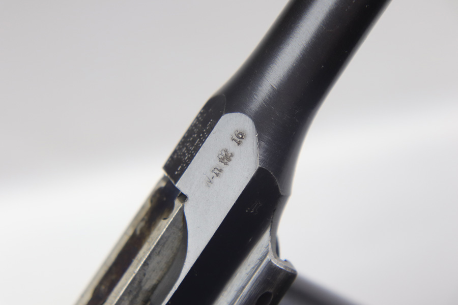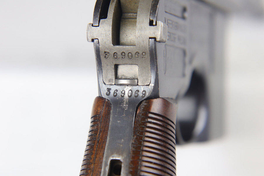 11/2/18 – This is a fantastic and desirable example of an all original, correct and matching Mauser C96 Broomhandle rig with matching numbered stock. This gun is particularly desirable as the right side receiver and the stock share the same Austro-Hungarian acceptance marking, “W-n 16”. The original bluing of the pistol rates at 95-96% with basic high edge wear but most of the finish loss found under the barrel from rubbing inside the stock. The grips are numbered to the gun and in excellent condition. Some small parts still show brilliant fire blue. The stock is imperial proofed and in great condition, with no cracks or chips. Pistol bore is very shiny with strong rifling, with little sign of extended use.