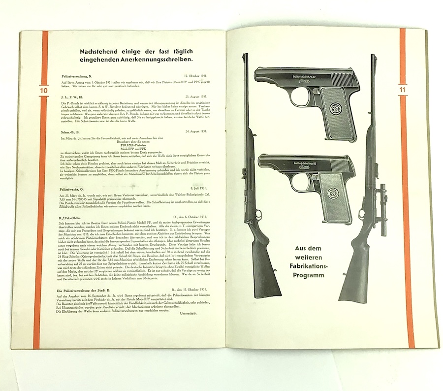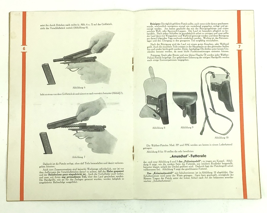 6/17/21 – Original first series red/yellow Walther PP / PPK pistol manual. The front of the manual reads “Die Neuen/Walther/PP u. PPK Polizei-Pistolen”. The manual itself has approximately 12 pages that shows the assembly and disassembly, exploded parts view and accessories. Printed in German. There is a fold in the middle as the manuals were meant to be be folded to fit one box. This was a Walther method on all versions of manuals until about 1935. Scarce piece.