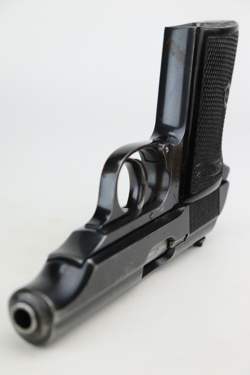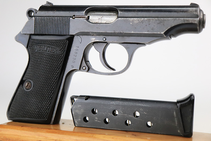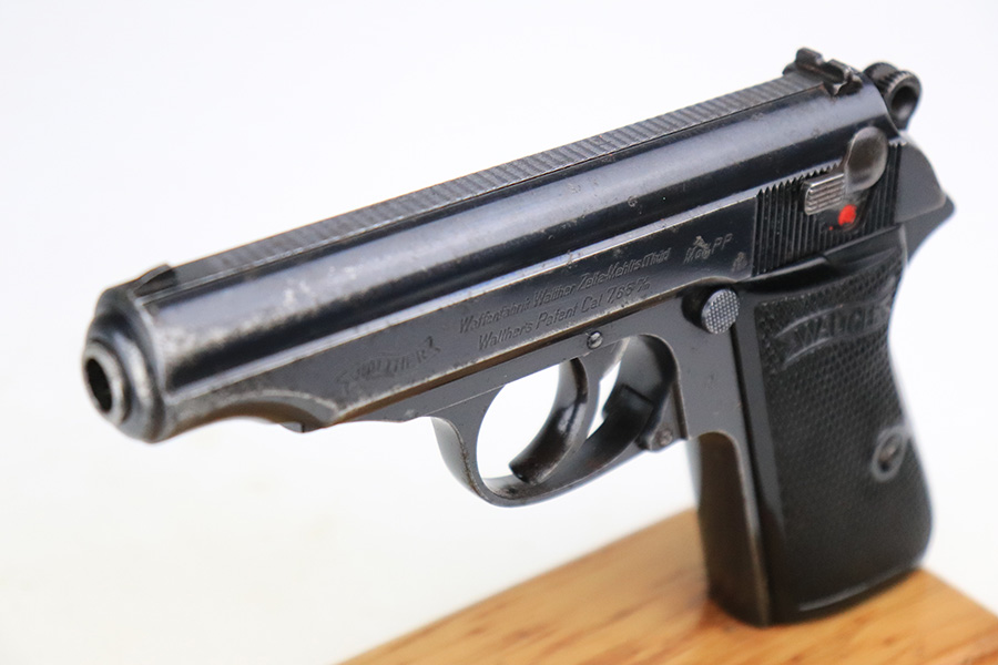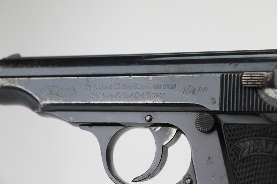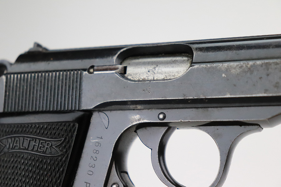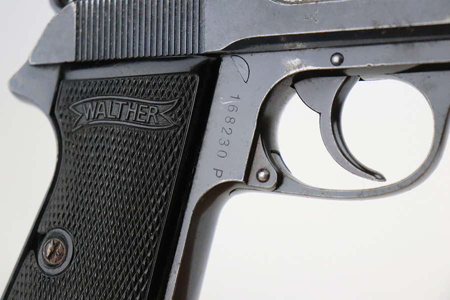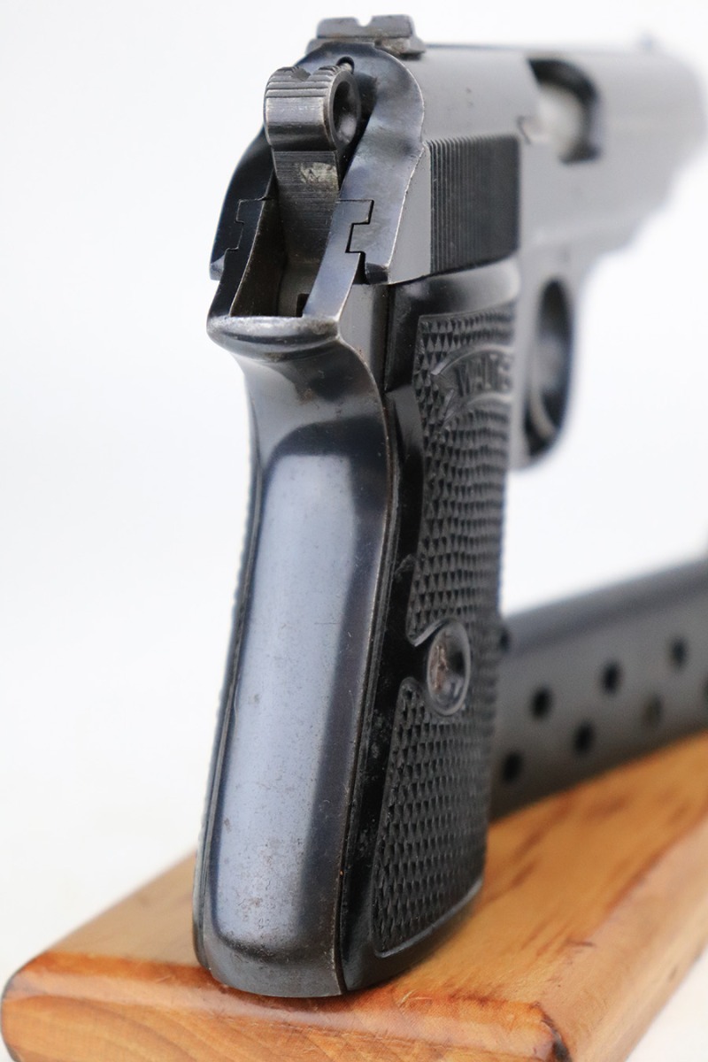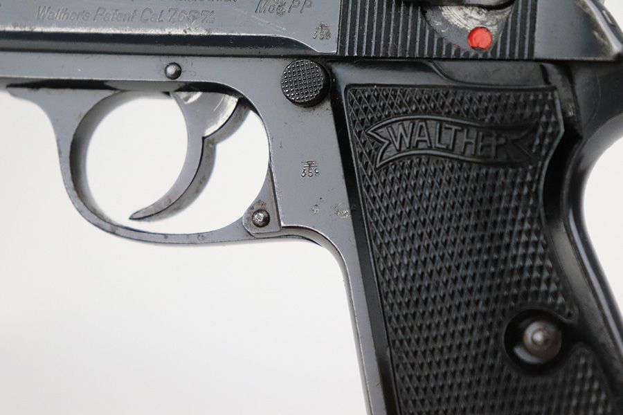 7/26/22 – This is a nice example of a scarce first-variation Walther PP issued to the Nazi military in 1940. It is all matching and has the proper early “Eagle 359” military acceptance proofs on the slide and frame instead of the more common “Waffen 359” proofs. They only made about 1,000 guns with this configuration. It has retained somewhere between 85-90% of its original high polish finish. There is spotty wear throughout, mostly around the muzzle and high edges of the slide. While there isn’t a ton of actual finish loss, there is spotty oxidation throughout and some areas of pin-pricking. Comes with very nice black bakelite grips and a wartime finger extension magazine. Excellent bore with strong rifling.