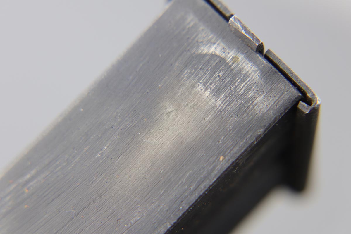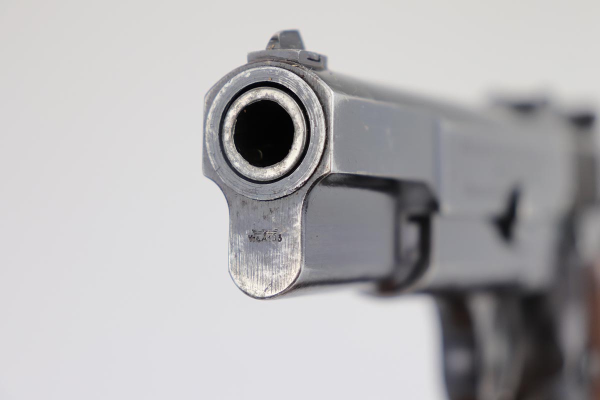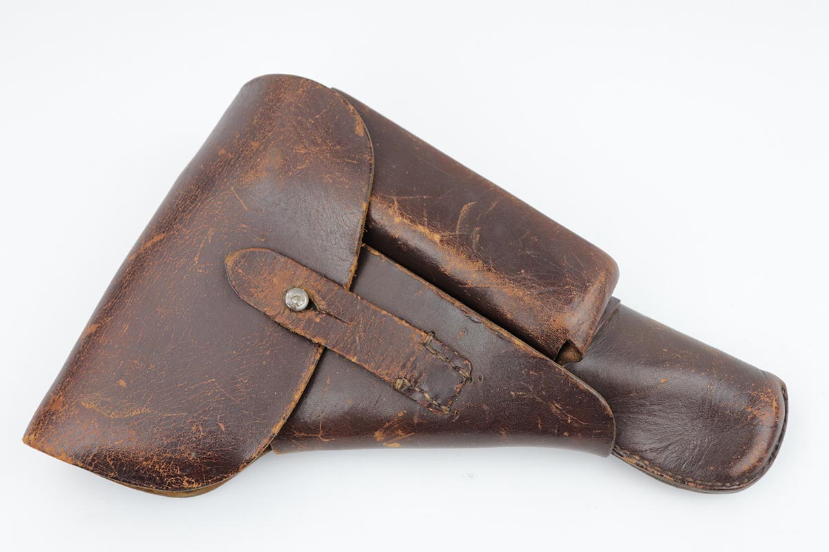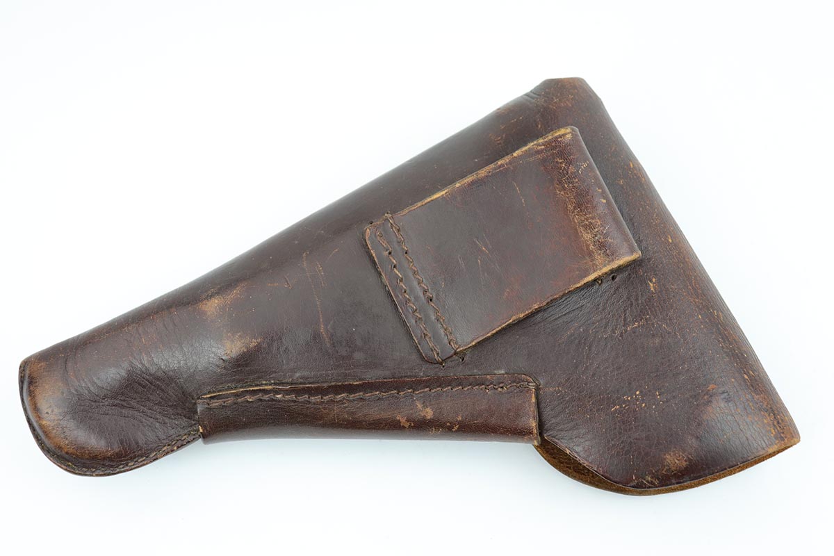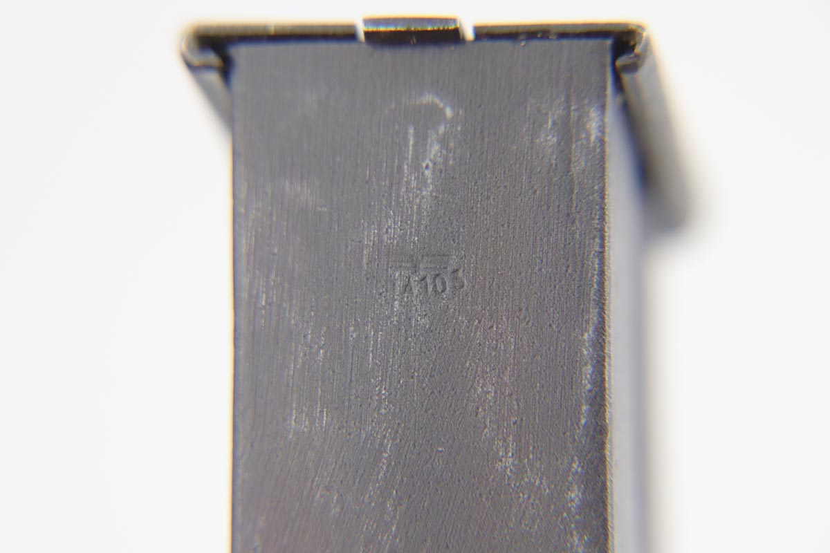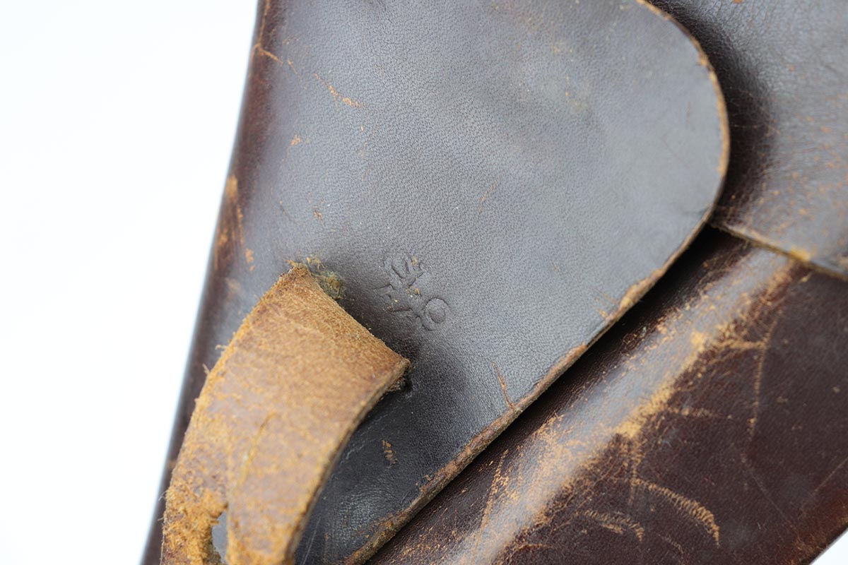 2/25/20 – This is a somewhat scarce but desirable tangent sight FN Browning Hi Power rig that was issued to the German Army. The pistol has earlier WaA103 proofs on slide and frame, as well as both magazines. The profile view is excellent but there is notable thinning on the straps. Excellent grips, as well. Bore has strong rifling but some frost throughout. Rig is completed by an original ‘clg’ holster with 1944 date and sharp, internal waffenamt.