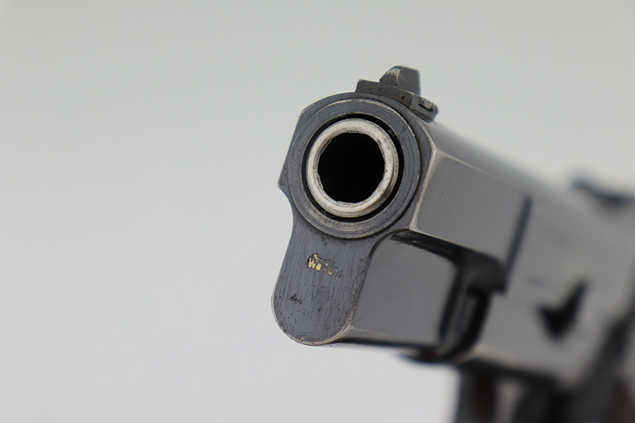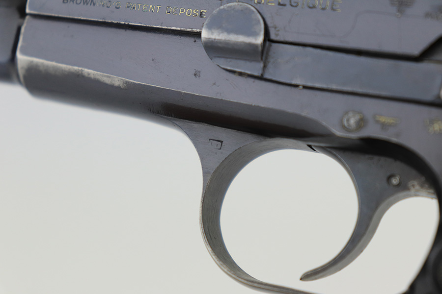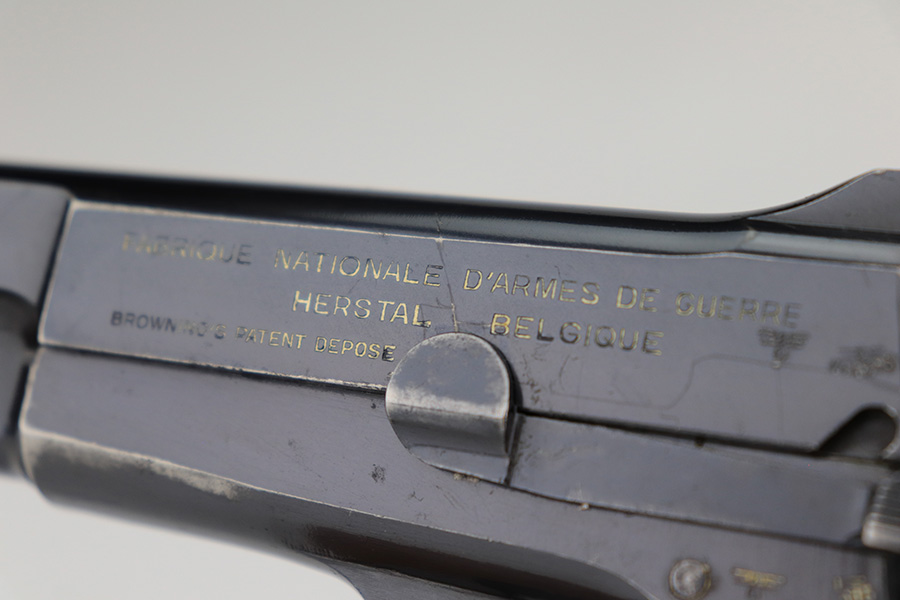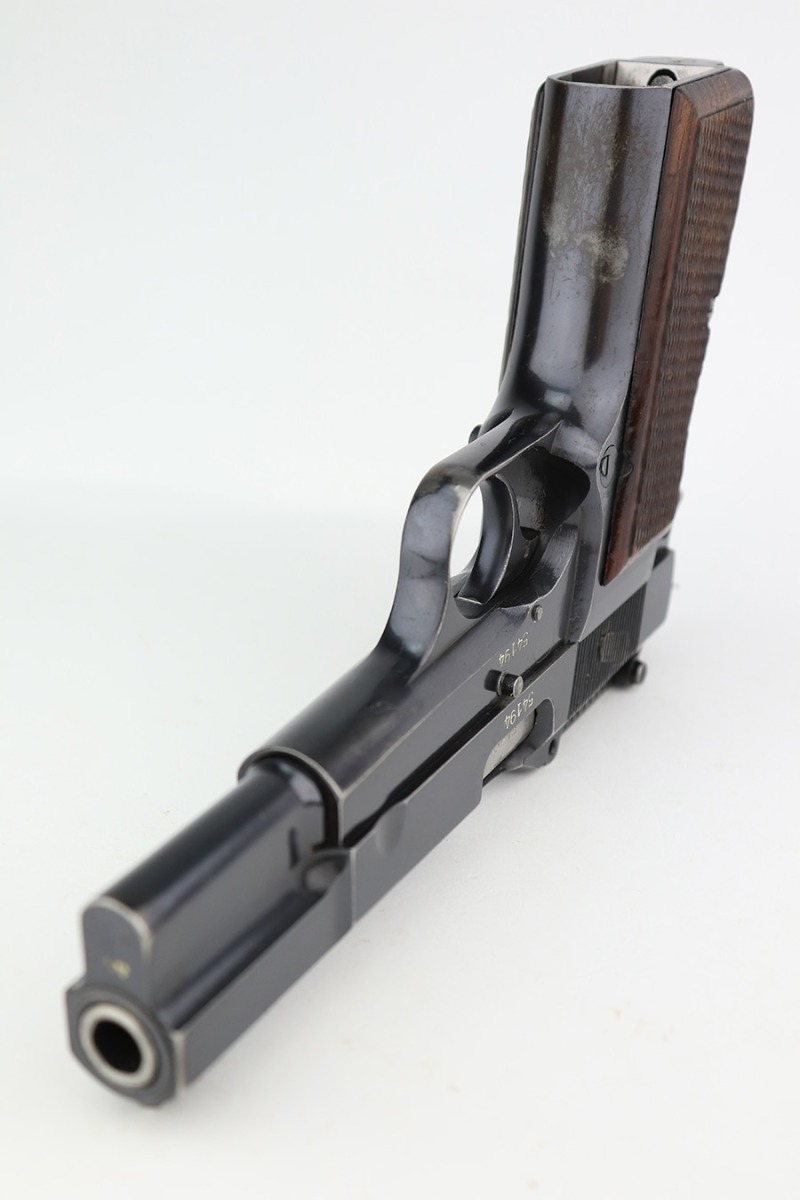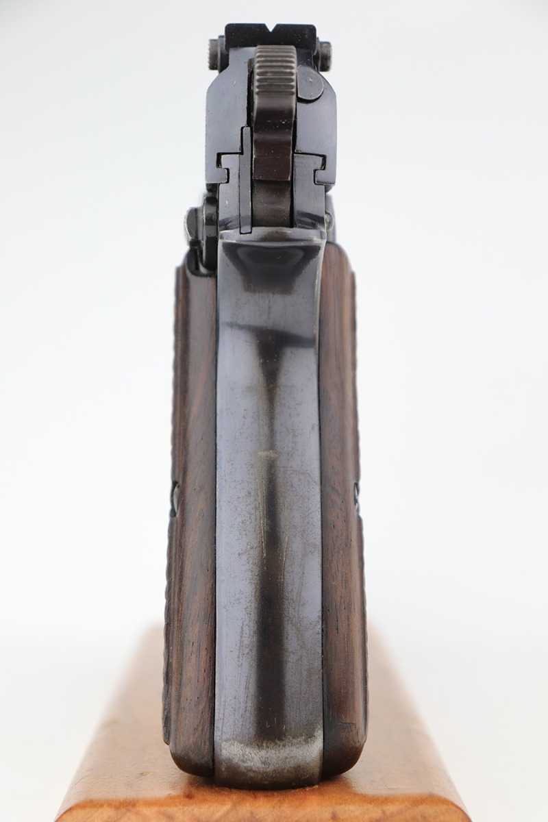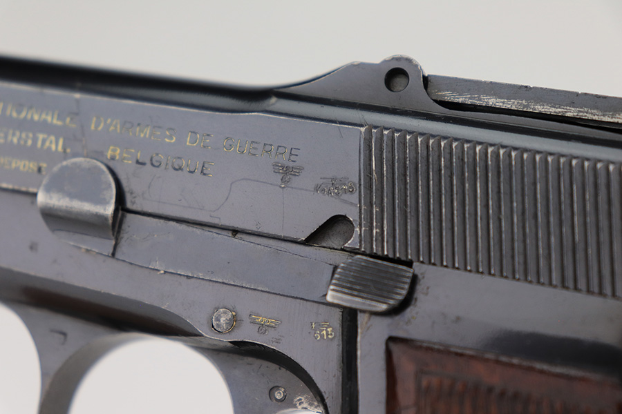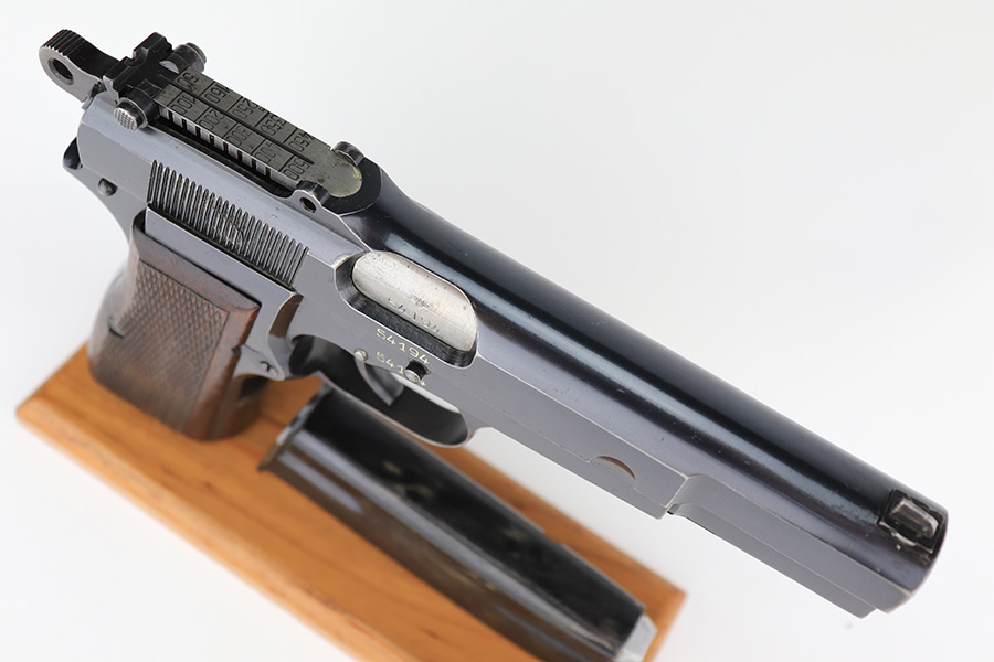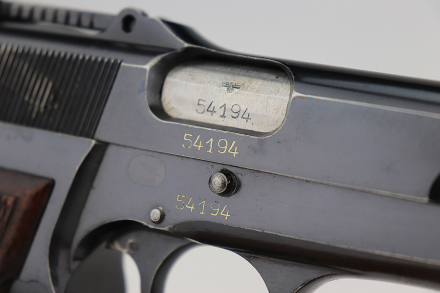 1/20/23 – This is a scarce and early Nazi FN Browning High Power with rear tangent sight and WaA613 acceptance proofs on slide and frame. Only ~12,000 of this variation were produced, compared to ~28k with WaA103 proofs, and hundreds of thousands with WaA140. The original bluing rates at 85+% with a very nice profile but the vast majority of wear on the grip straps. Strong, shiny bore. Proper early grips with the red painted backs. Wartime magazine but it does not have a waffenamt on it.