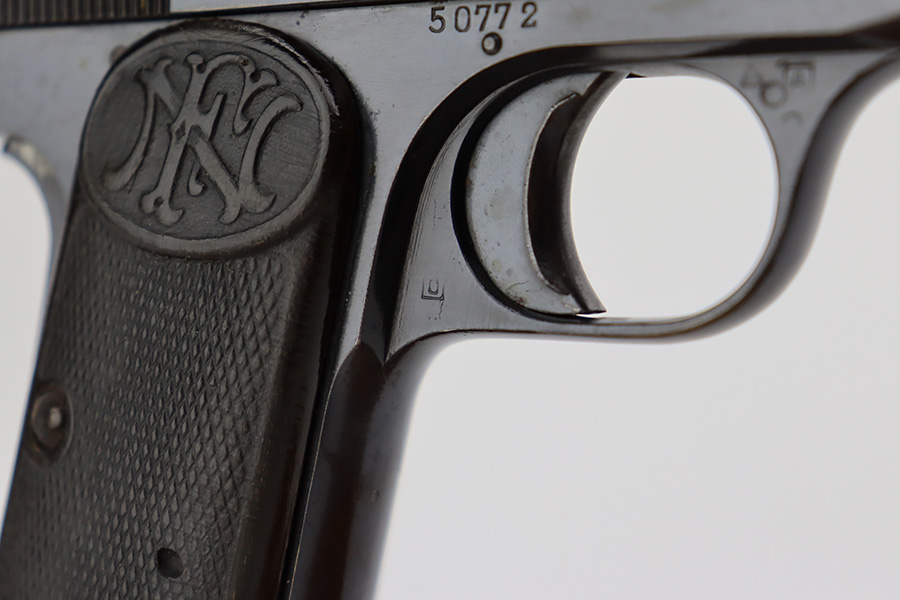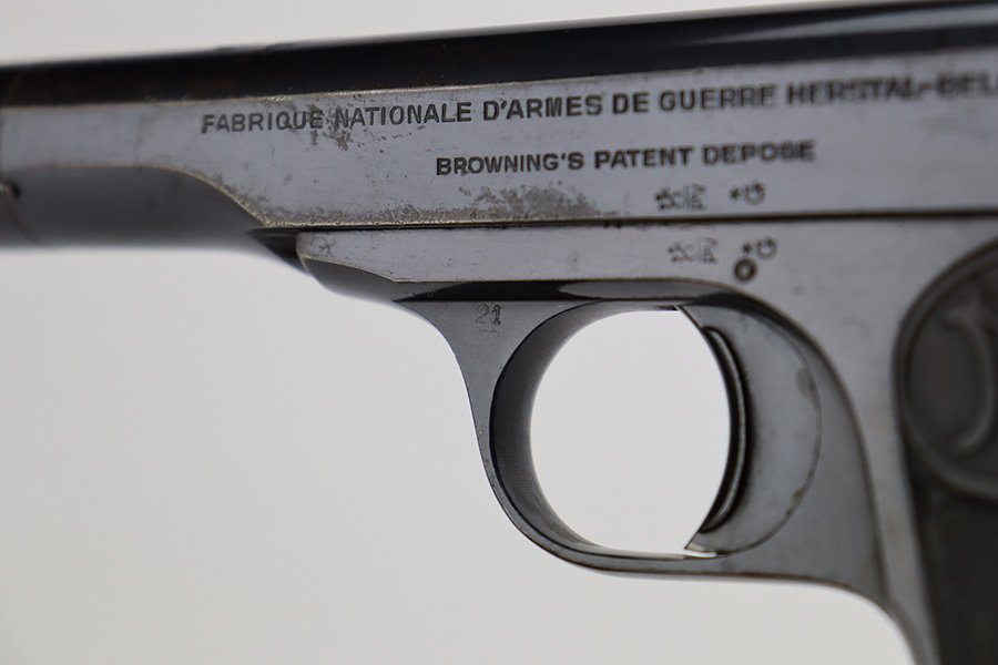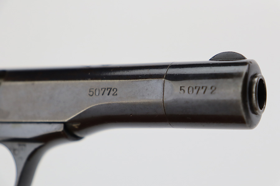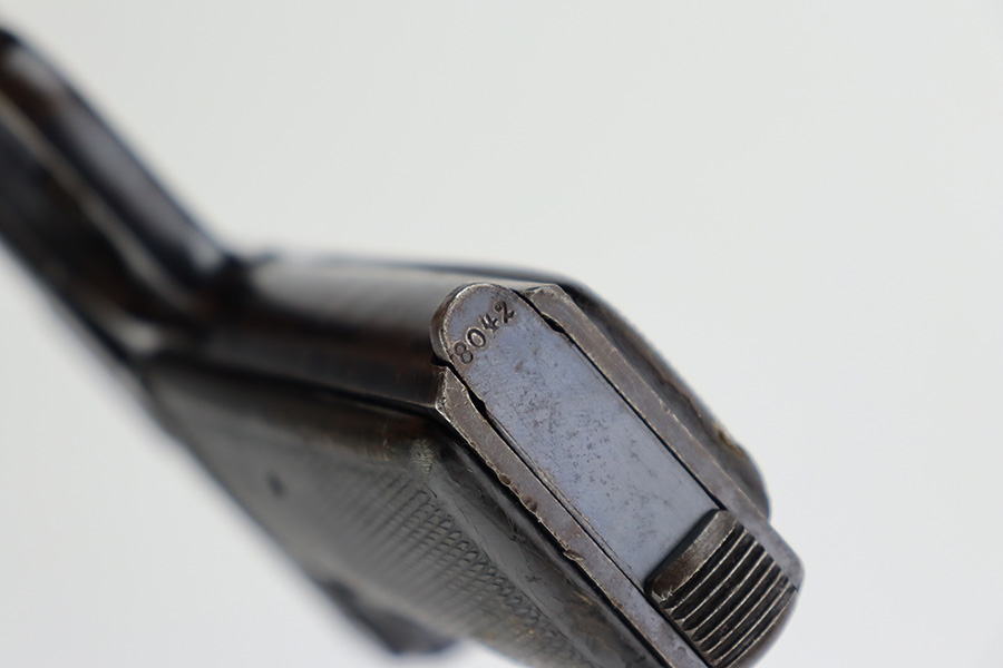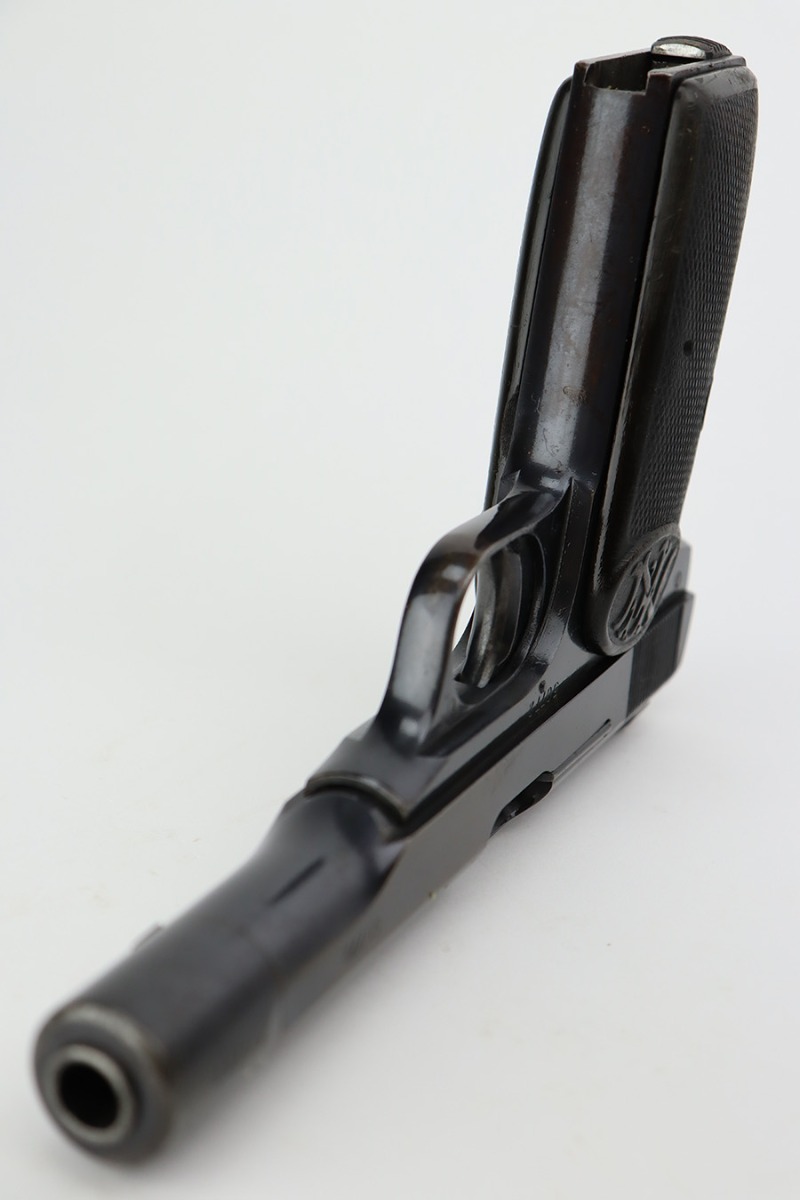 7/31/23 – Between 1926 and May of 1940, nearly 60,000 FN Browning M1922 pistols were shipped to the Netherlands and designated Pistool M25 No.2 by the Koninklijke Landmacht. These pistols feature a large Crown/W proof on the slide for Queen Wilhelmina. While 60,000 would suggest a somewhat common pistol, the survival rate on these is relatively low as we only receive one or two per year. This one is all matching and has the proper Dutch “Crown W” proof on the tang. It has retained about 90% of its original finish. The majority of the wear is around the muzzle, on some of the high edges, and in an area on the right side of the slide. While there isn’t much actual finish loss, there is spotty brown patina and oxidation throughout. Small areas of minor pitting on the right side of the slide and on the front strap. Fitted with period-correct horn grips – small bore hole on the right side. Comes with one period-correct numbered Dutch-contract magazine, but it does not match. The lanyard loop on the frame has been removed. The bore has great rifling, but there is some fouling in the grooves.
