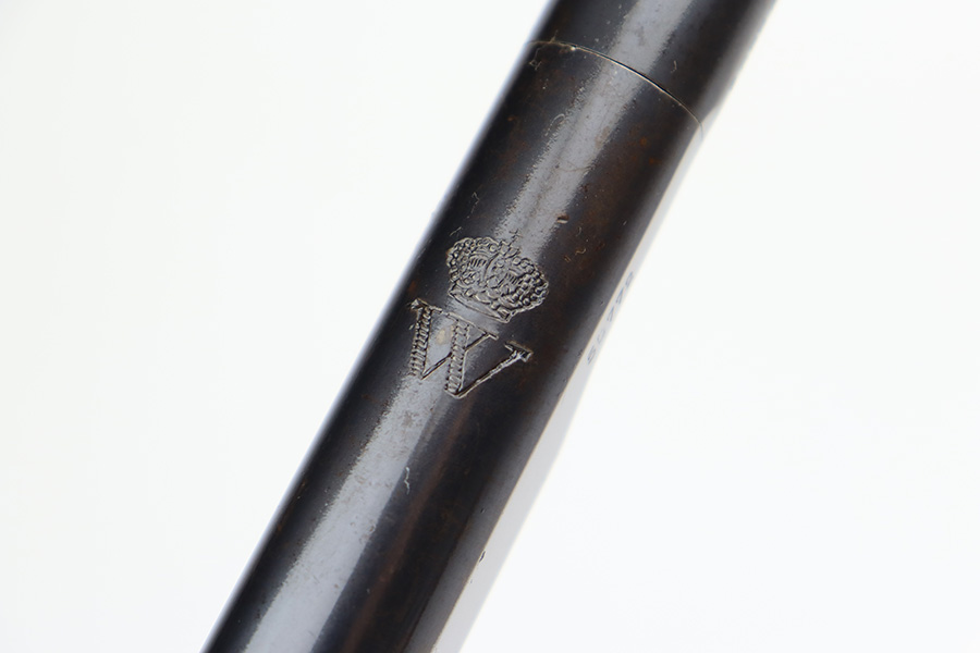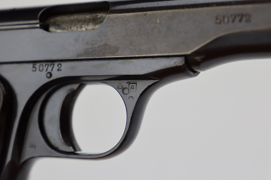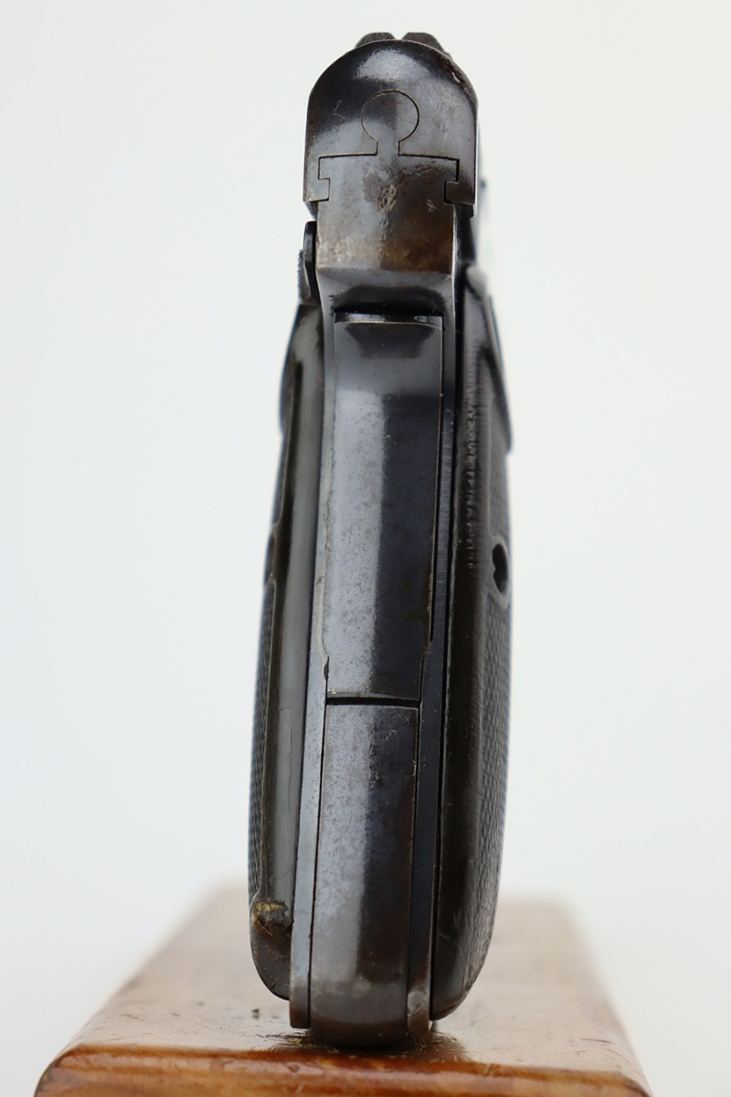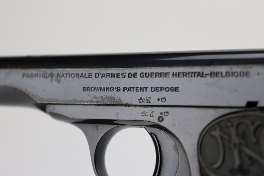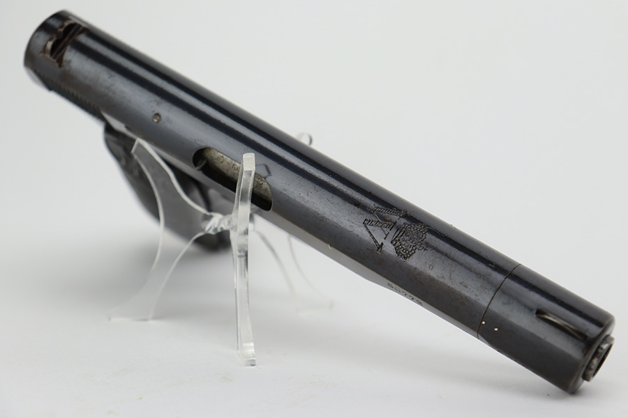 7/31/23 – Between 1926 and May of 1940, nearly 60,000 FN Browning M1922 pistols were shipped to the Netherlands and designated Pistool M25 No.2 by the Koninklijke Landmacht. These pistols feature a large Crown/W proof on the slide for Queen Wilhelmina. While 60,000 would suggest a somewhat common pistol, the survival rate on these is relatively low as we only receive one or two per year. This one is all matching and has the proper Dutch “Crown W” proof on the tang. It has retained about 90% of its original finish. The majority of the wear is around the muzzle, on some of the high edges, and in an area on the right side of the slide. While there isn’t much actual finish loss, there is spotty brown patina and oxidation throughout. Small areas of minor pitting on the right side of the slide and on the front strap. Fitted with period-correct horn grips – small bore hole on the right side. Comes with one period-correct numbered Dutch-contract magazine, but it does not match. The lanyard loop on the frame has been removed. The bore has great rifling, but there is some fouling in the grooves.
