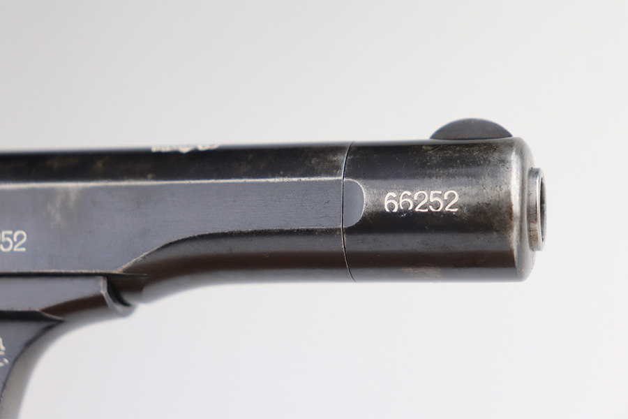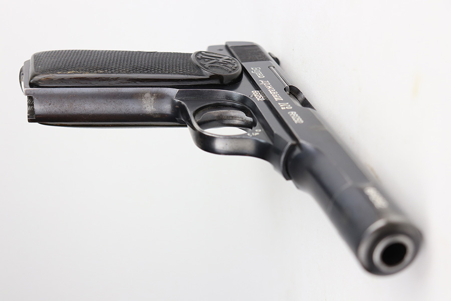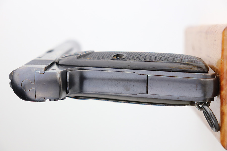 5/5/21 – Between 1923 and May of 1940, nearly 67,000 FN Browning M1922 pistols were shipped to Yugoslavia as the newly formed Kingdom of Serbs, Croats and Slovenes had requested a military sidearm in 9mm with 8rd magazine capacity and 114mm barrel. While 67,000 would suggest a somewhat common pistol, the survival rate on these is relatively low as we only receive one or two per year. This one is all original and in good condition with standard wear around the muzzle, and a little more on the front strap and trigger guard. The magazine is original and correct. Strong, shiny bore. Very nice grips with only minor discoloration but no cracks or chips.