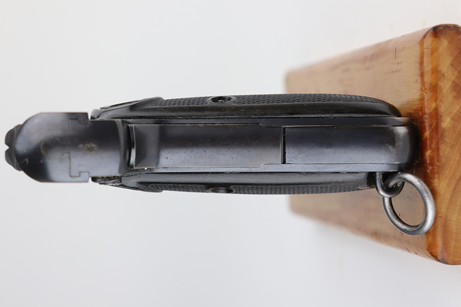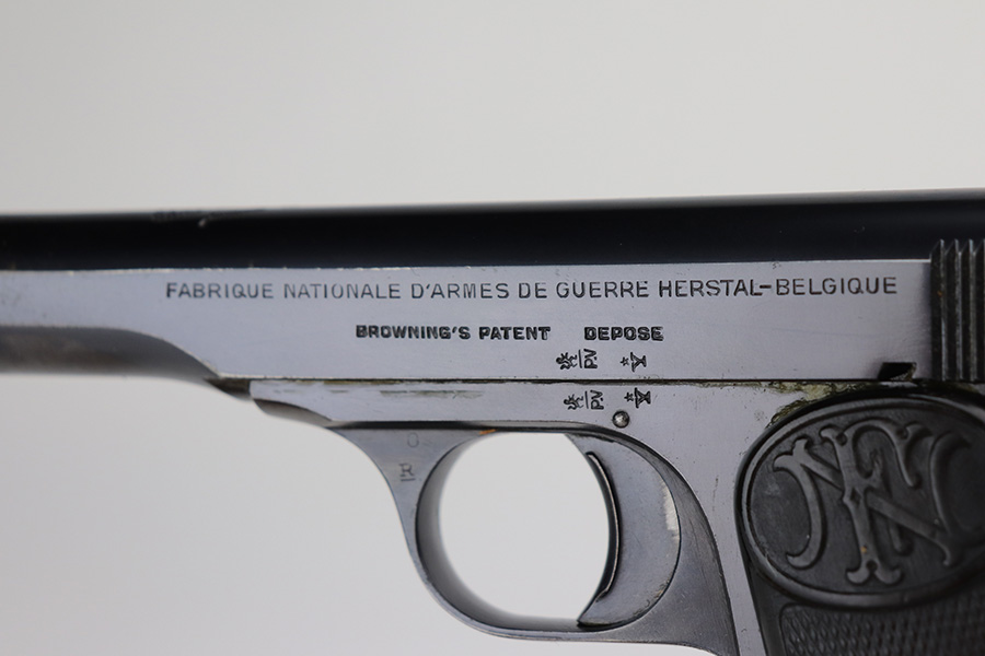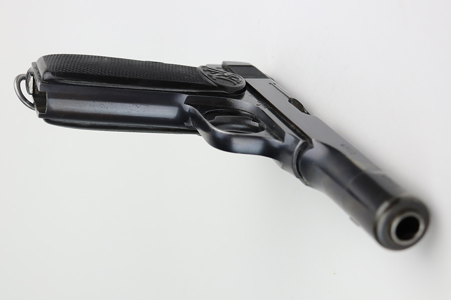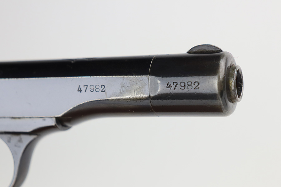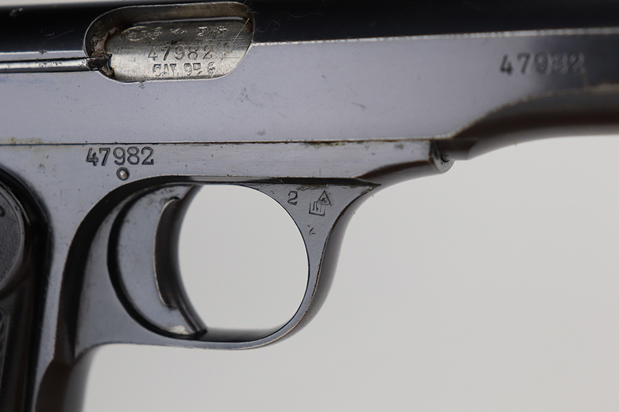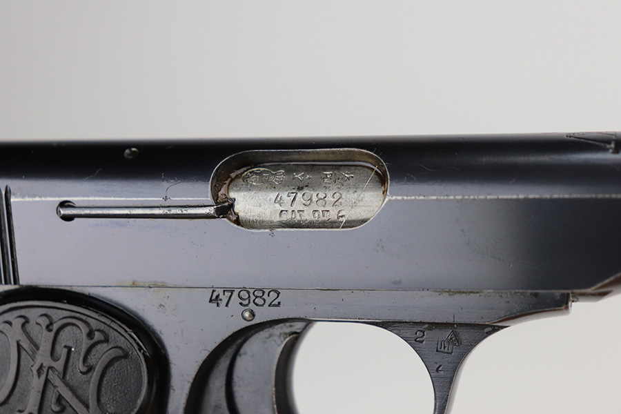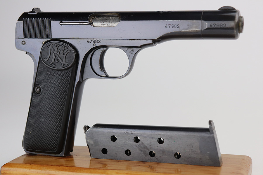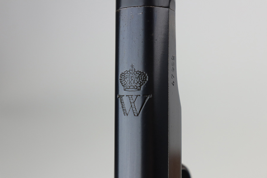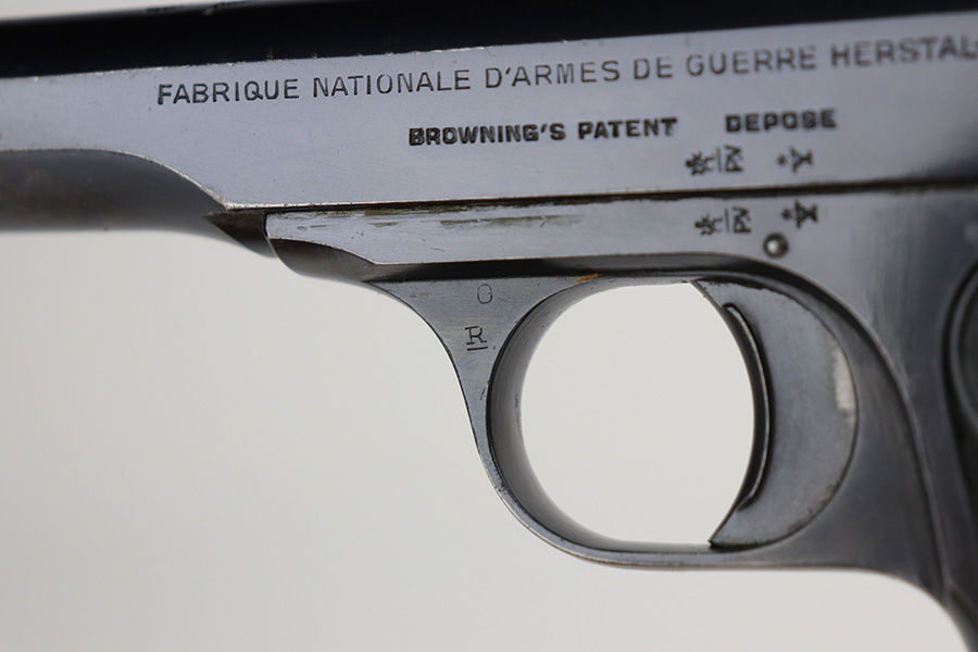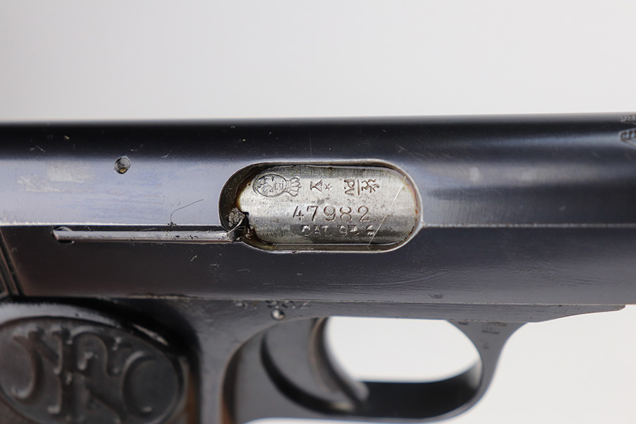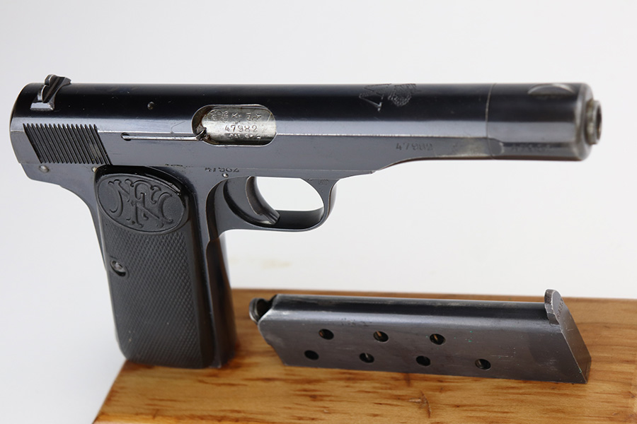 8/16/21 – Between 1926 and May of 1940, nearly 60,000 FN Browning M1922 pistols were shipped to the Netherlands and designated Pistool M25 No.2 by the Koninklijke Landmacht. These pistols feature a large Crown/W proof on the slide for Queen Wilhelmina. While 60,000 would suggest a somewhat common pistol, the survival rate on these is relatively low as we only receive one or two per year. Frame is also Crown/W inspector marked. This one is all original and in very good condition with standard wear around the muzzle, and a little more on the right side of the slide and bottom of back strap. The magazine is correct and serialized but the number is not matching to this pistol. Terrific bore. Very nice grips with no cracks or chips. NOTE: This one is filled with oil/Cosmoline so will need a more thorough cleaning.
