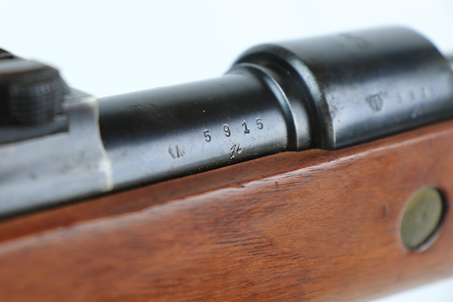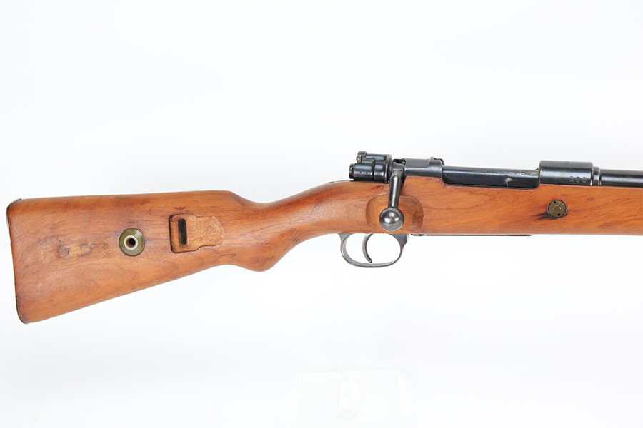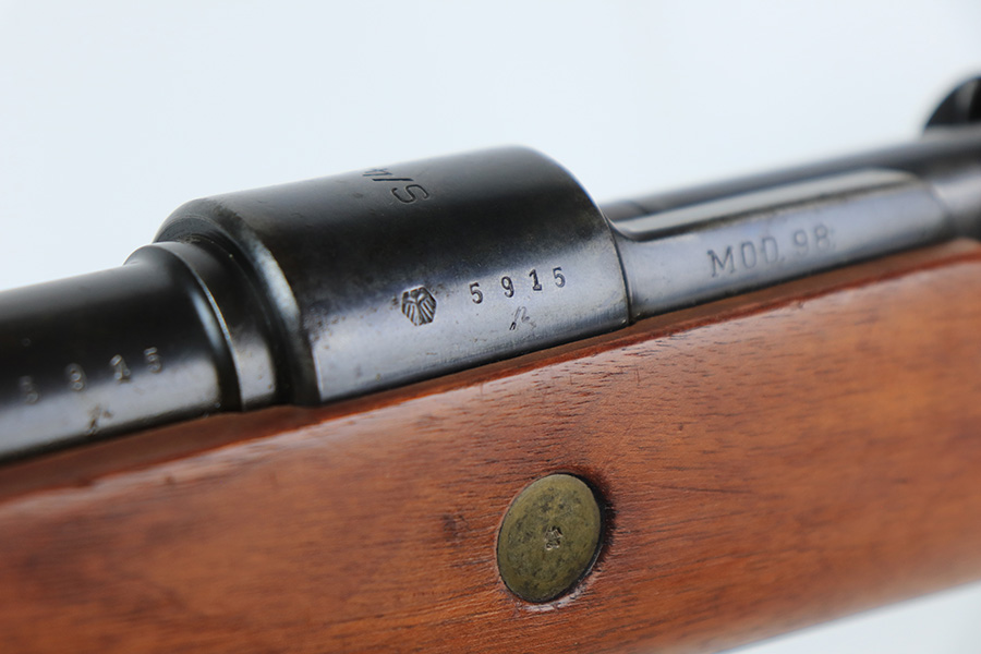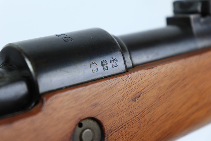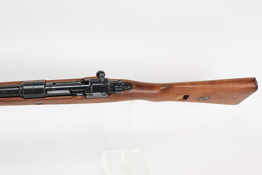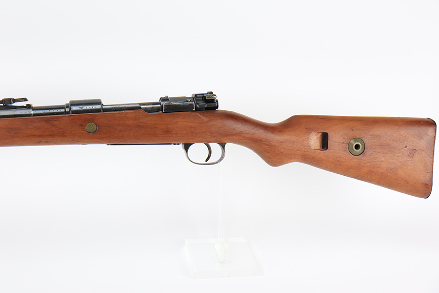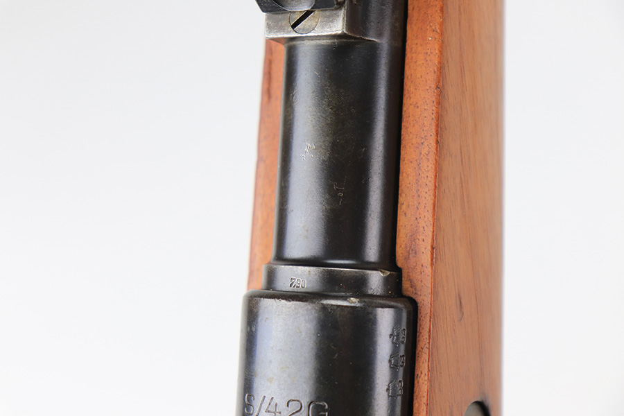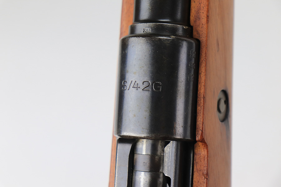 3/22/22 – This is a scarce G Date Mauser K98 rifle from 1935 with S/42G coded receiver. The rifle is matching and original throughout, all the way down to the screws. Matching serial numbers on the stock, buttplate, bands, rear sight, full trigger assembly, follower, full bolt assembly, receiver, barrel, etc. Very good, original bluing on the receiver and barrel, with most of the finish wear on the bands and trigger group. The stock does have a clearly visible armorer’s repair, and has been sanded. Our guess is the sanding was done by a previous collector as they specifically avoided sanding the areas with inspection markings and serial numbers. It’s rough and untouched in those areas, but smooth due to the sanding otherwise. Bore has strong rifling but some frost throughout.