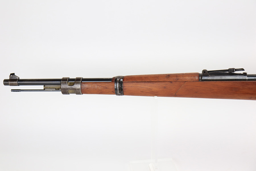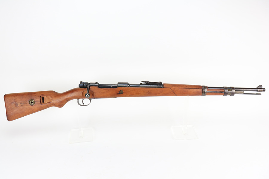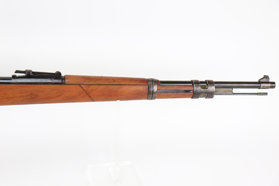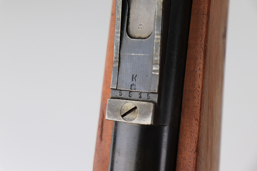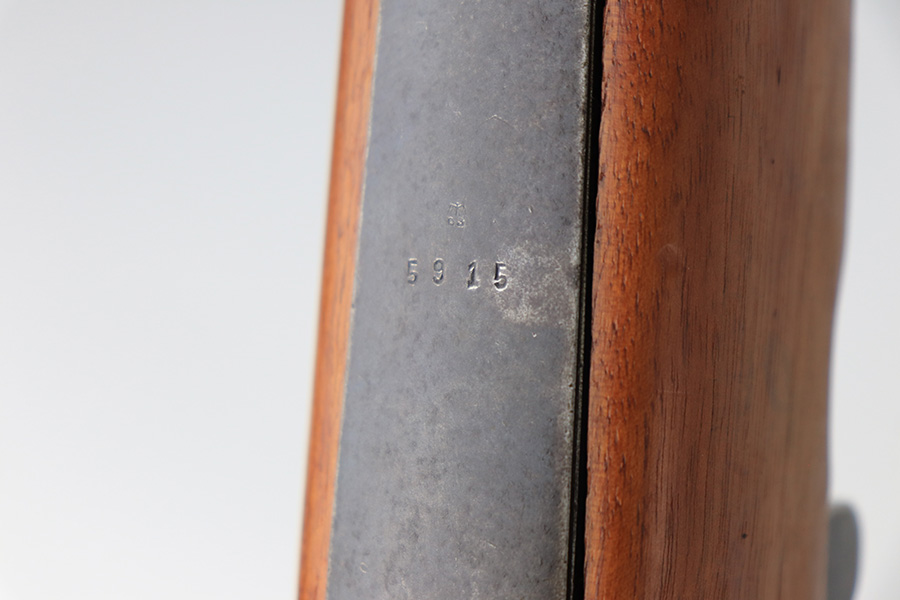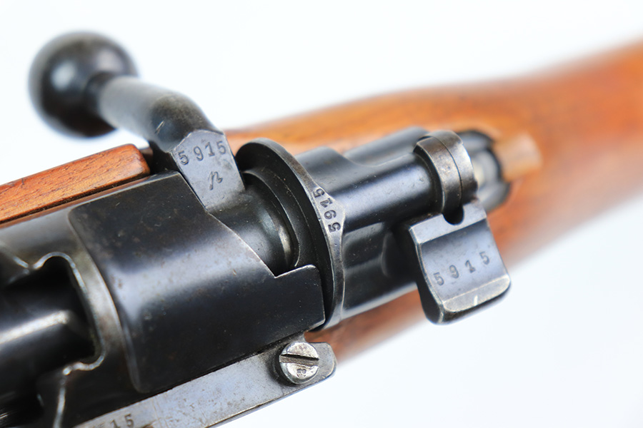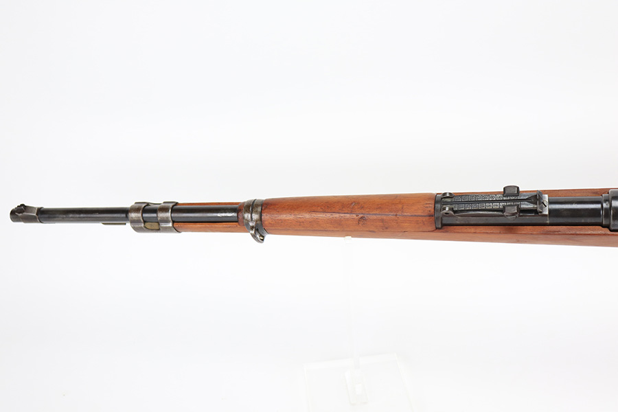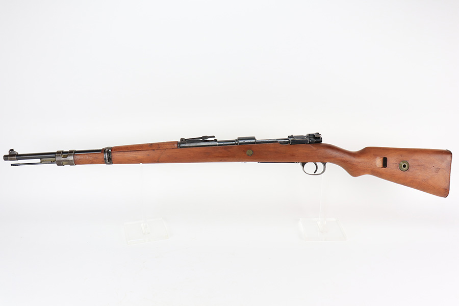 3/22/22 – This is a scarce G Date Mauser K98 rifle from 1935 with S/42G coded receiver. The rifle is matching and original throughout, all the way down to the screws. Matching serial numbers on the stock, buttplate, bands, rear sight, full trigger assembly, follower, full bolt assembly, receiver, barrel, etc. Very good, original bluing on the receiver and barrel, with most of the finish wear on the bands and trigger group. The stock does have a clearly visible armorer’s repair, and has been sanded. Our guess is the sanding was done by a previous collector as they specifically avoided sanding the areas with inspection markings and serial numbers. It’s rough and untouched in those areas, but smooth due to the sanding otherwise. Bore has strong rifling but some frost throughout.