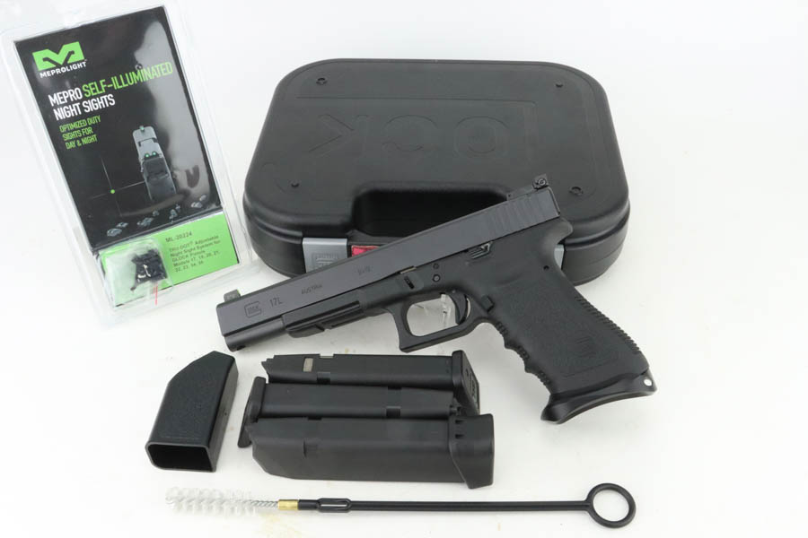 06/27/2024 – For sale is an excellent boxed Glock 17L Gen 3 chambered in 9mm. The overall condition is like-new with the only slight wear is on the front of the barrel chamber from the slid reciprocating. The bore is very bright with great rifling. The pistol comes with 3 17 round magazines (one with an extended baseplate, a flared mag well, a Wilson Combat recoil buffer, TruGlo sights, and a spare trigger.