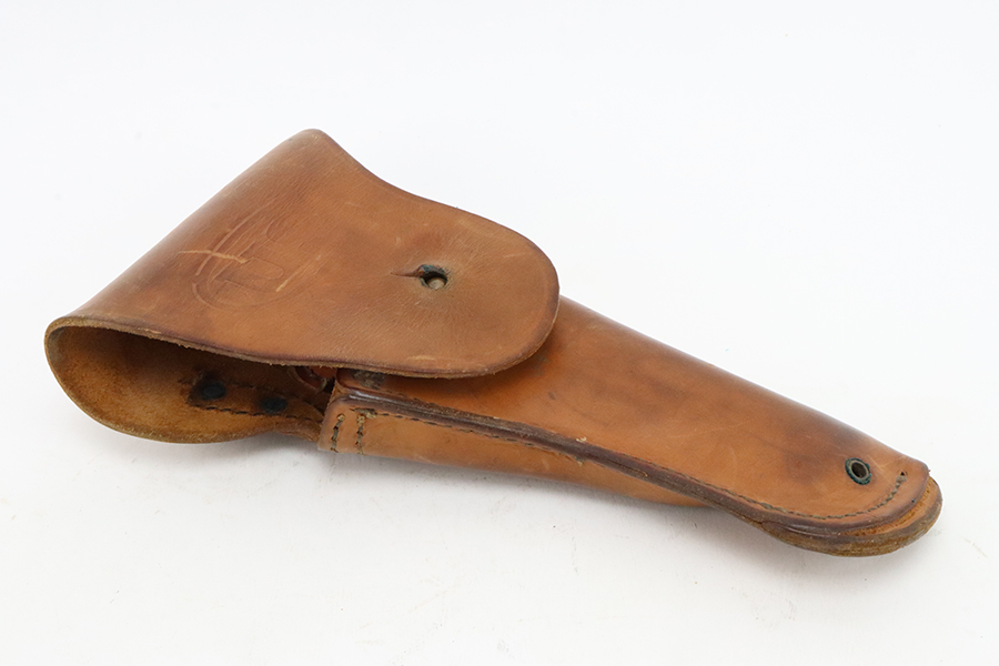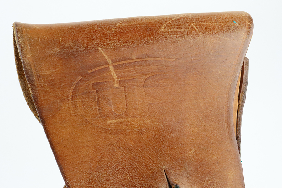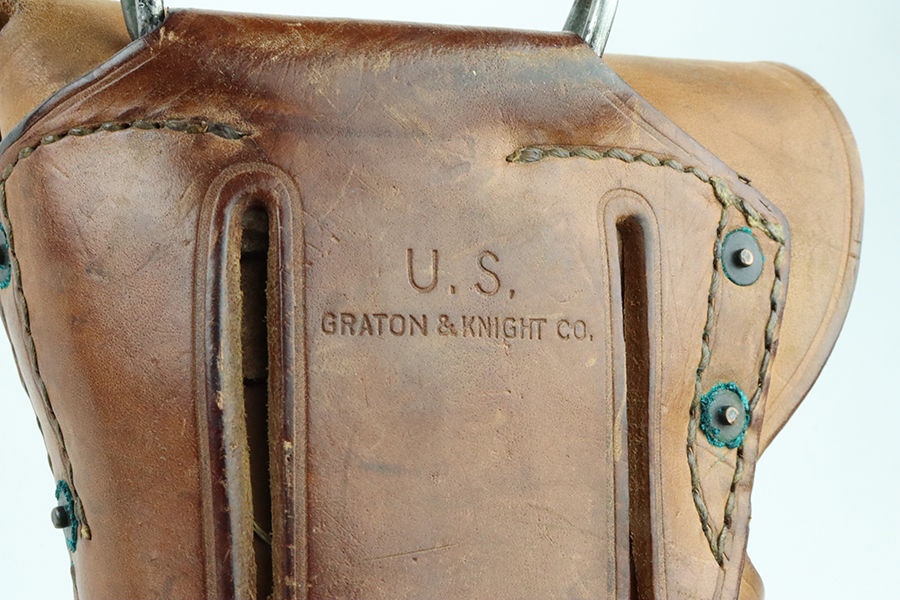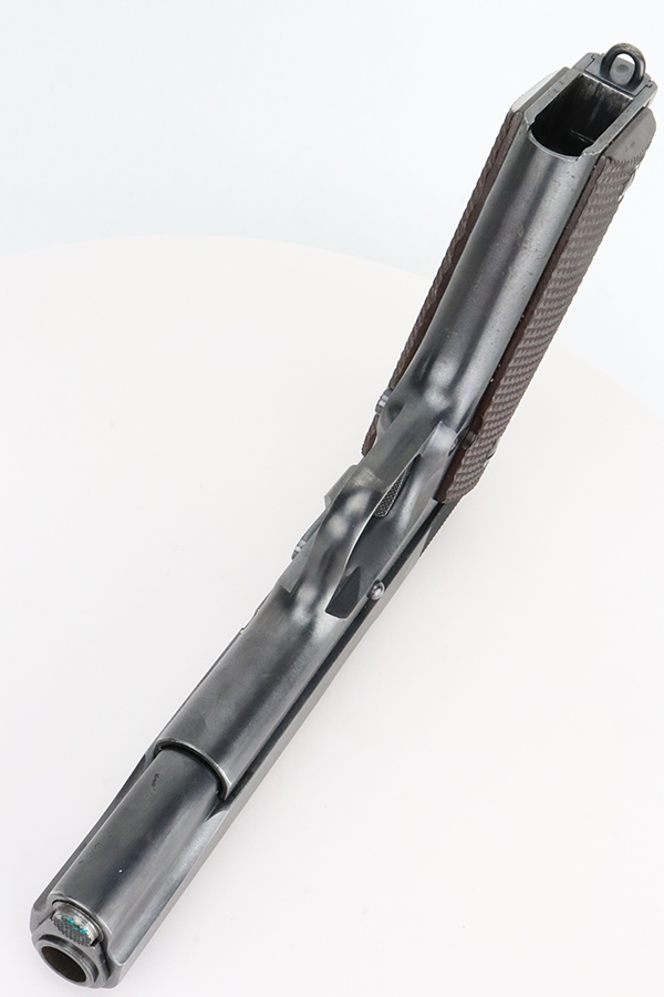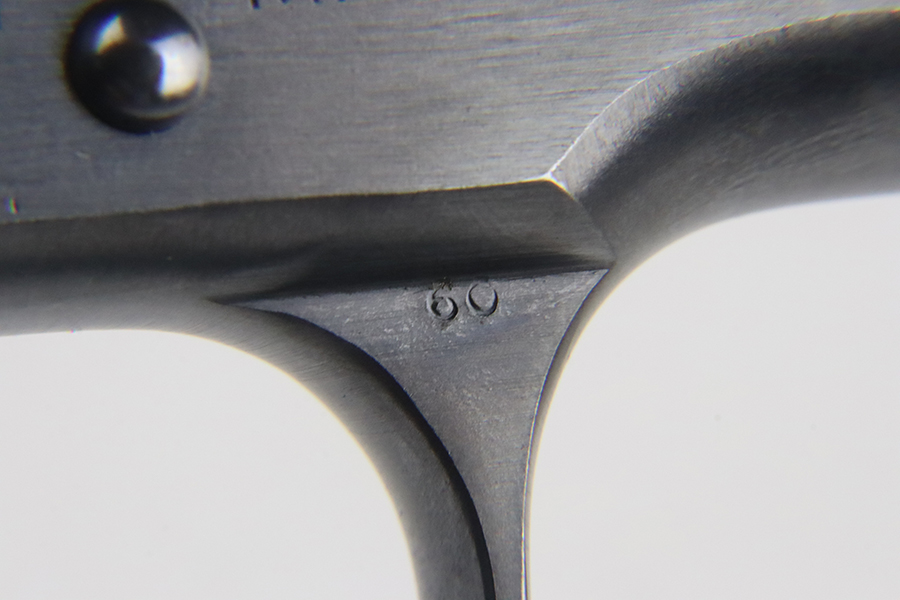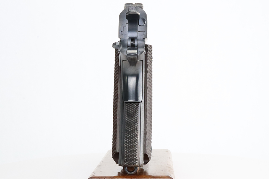 1/29/24 – This is one of the finest examples we’ve offered of a blued Colt 1911A1 from 1941. The pistol is matching and original with 98+% of the polished Colt blue remaining. Just a hint of holster wear on the front high edges of the frame and around the muzzle. Slide is serialized and matching to the frame. Proper Colt barrel with large ‘G’ marking. Fantastic profile view in general with vibrant blue. Excellent grips with sharp checkering. Barrel has minor hints of frost and signs of usage. Scovill mag. Comes with a minty Graton & Knight wartime holster.