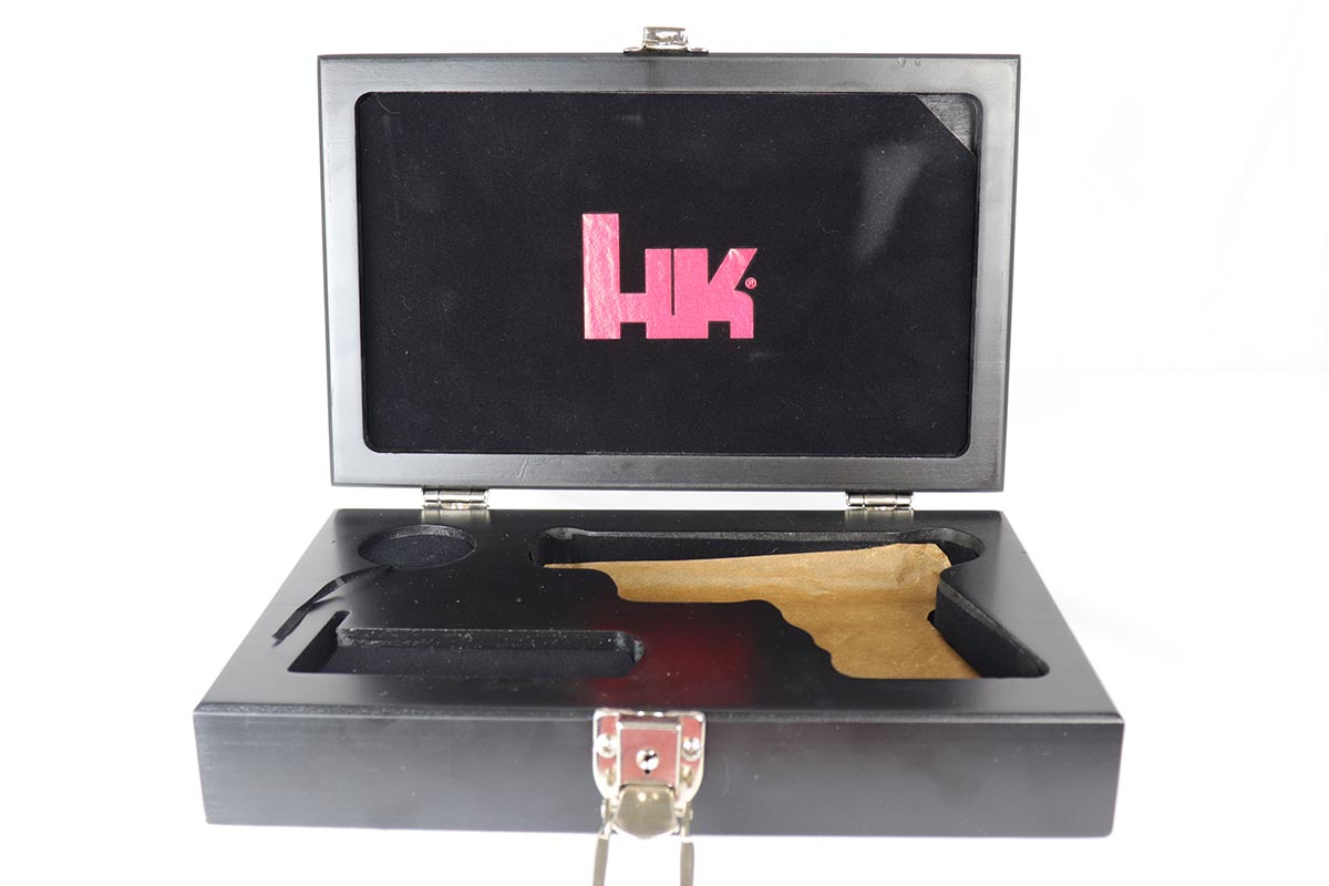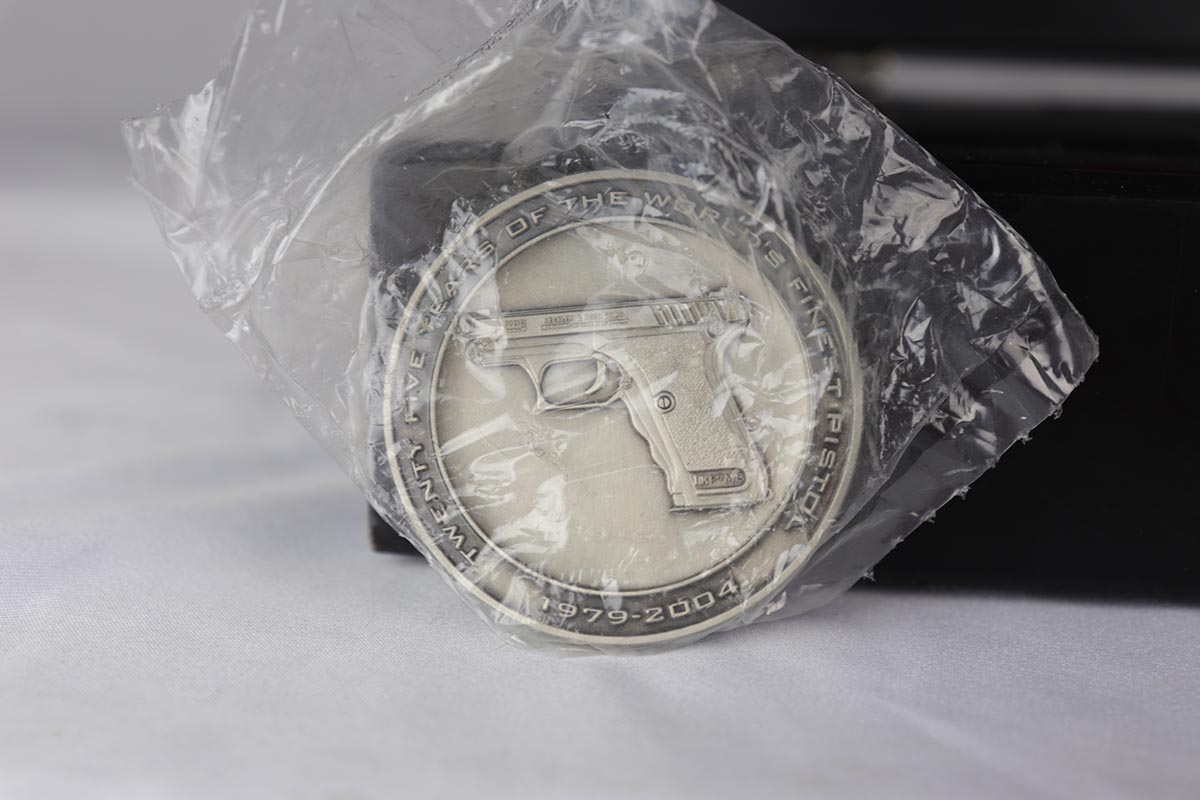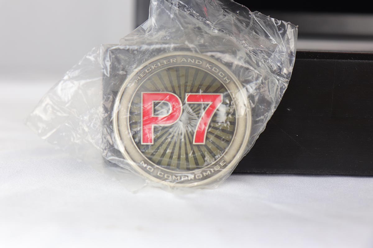 9/18/24 – This is a mint condition, nearly unfired Heckler & Koch P7M8, in presentation case with two magazines and P7 challenge coin.  500 of these pistols were made for the 25th Anniversary of the P7, and bear the signature of the original designer (Helmut Weldle) along the top of the slide.  Made in 2004 (AE date code), the pistol shows no finish loss and a perfect bore.  It comes in the original presentation case, which also show virtually zero handling wear.