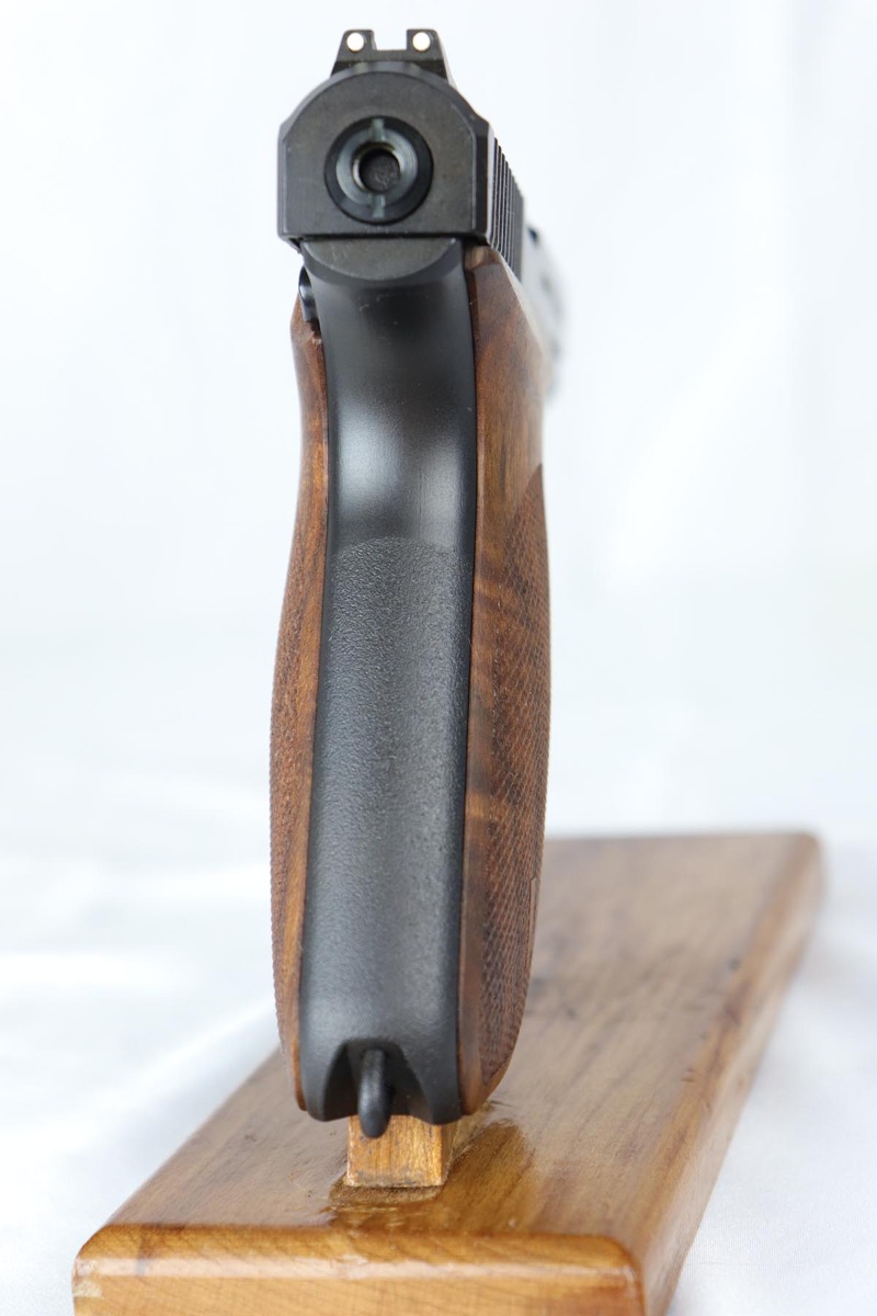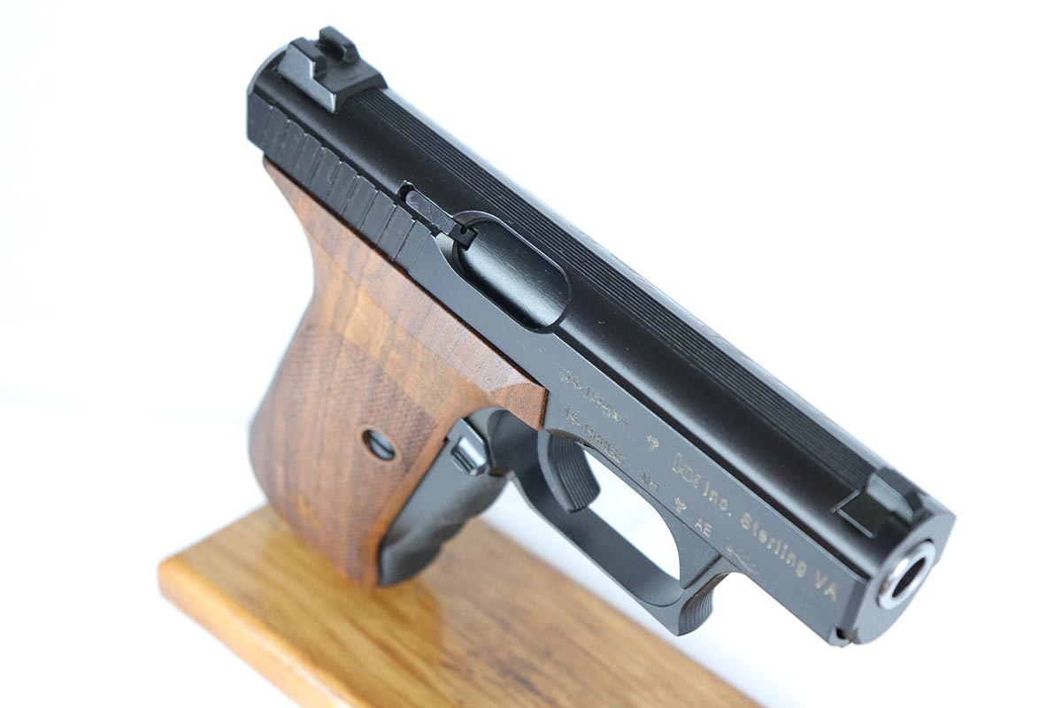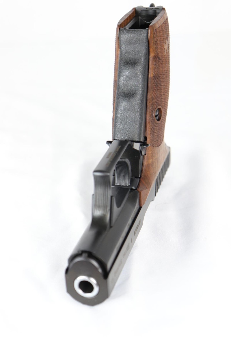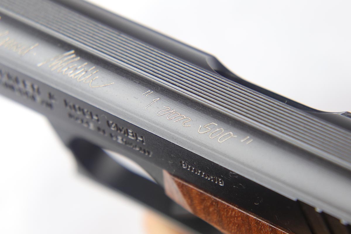 9/18/24 – This is a mint condition, nearly unfired Heckler & Koch P7M8, in presentation case with two magazines and P7 challenge coin.  500 of these pistols were made for the 25th Anniversary of the P7, and bear the signature of the original designer (Helmut Weldle) along the top of the slide.  Made in 2004 (AE date code), the pistol shows no finish loss and a perfect bore.  It comes in the original presentation case, which also show virtually zero handling wear.