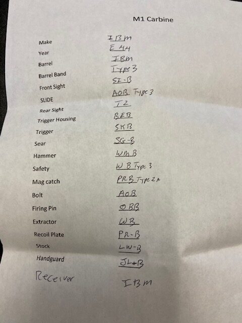 6/23/20 – This is an excellent and uncommon IBM M1 Carbine that was produced in either late 1943 or very early 1944. The last photo in this listing is a detailed parts sheet with the markings on each piece. The parkerized finish is excellent with hardly any wear to mention. Bore is mint and the gun has smooth mechanics. All parts are detailed in the spec sheet, but the bayonet lug would have been added post-factory. The stock is in fantastic condition with no defects and hardly any dings, and has a sharp cartouche. Magazine is ‘C-B’ marked.