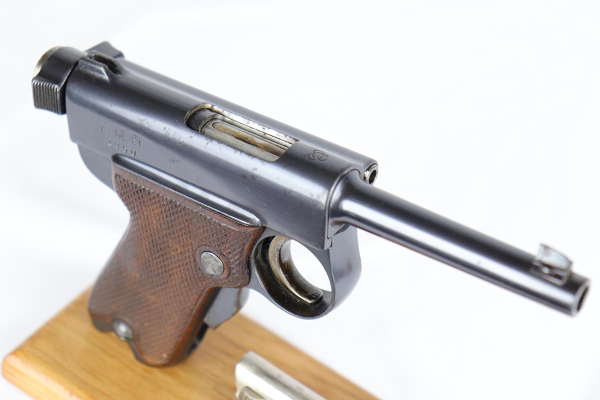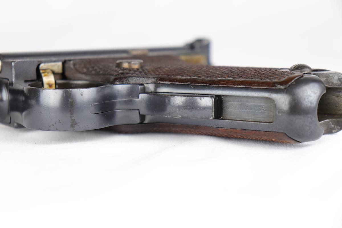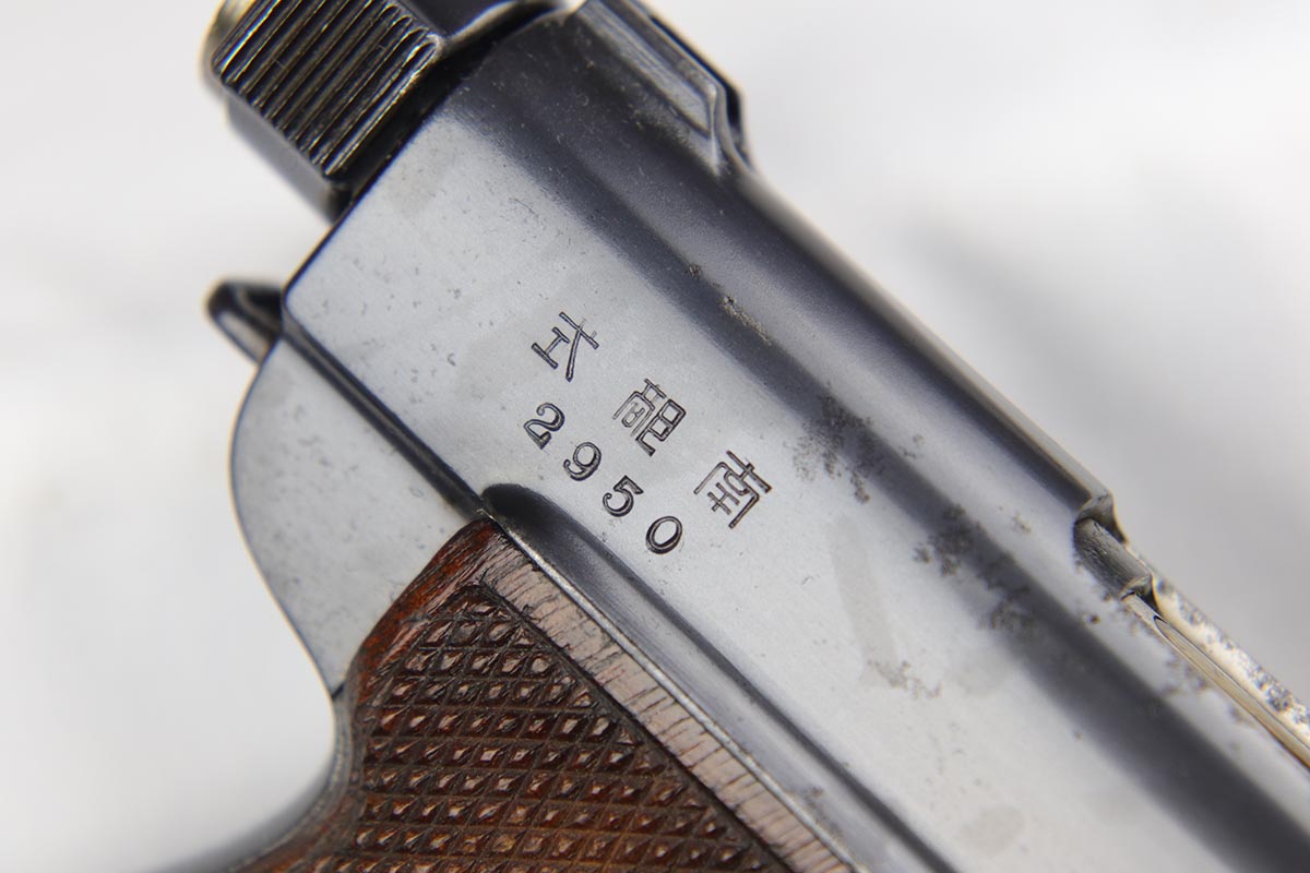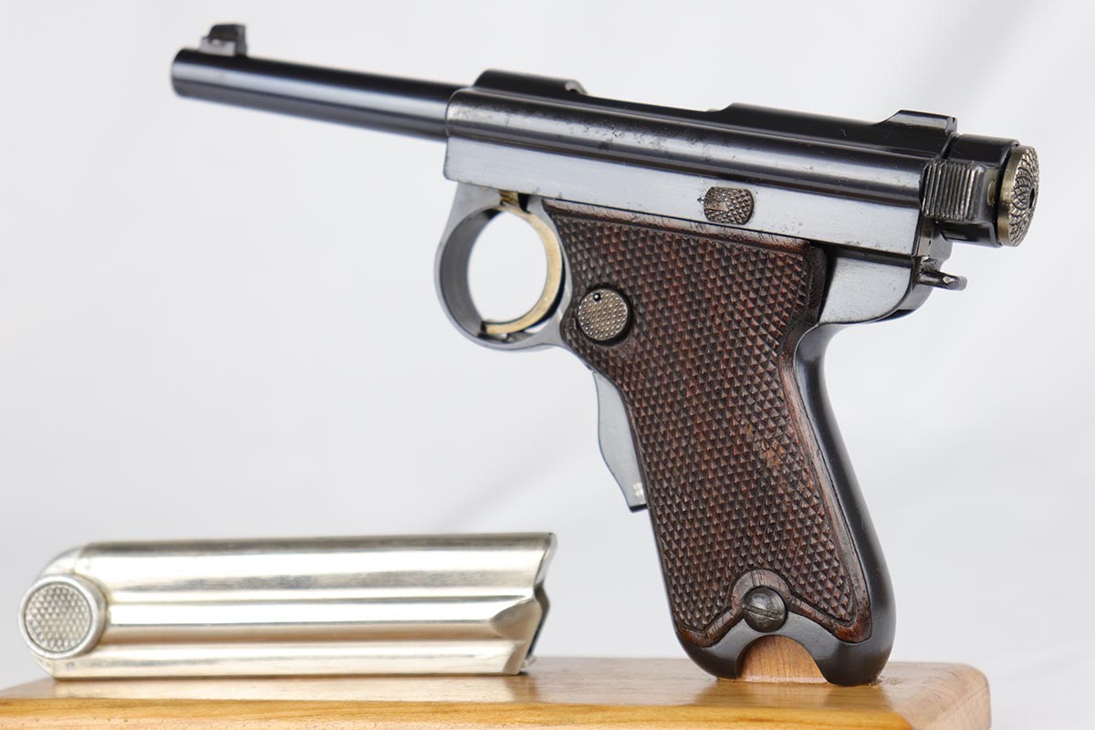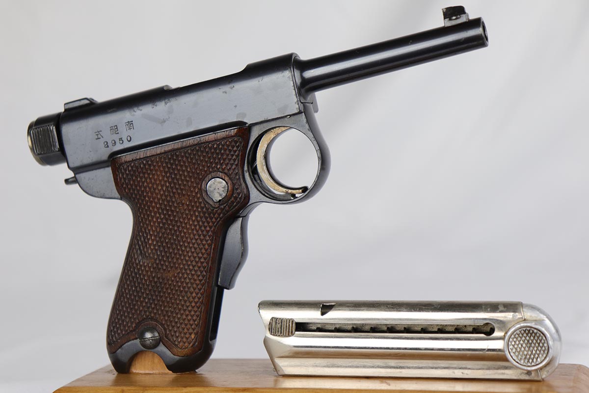 10/29/18 – This is a beautiful Baby Nambu, manufactured at the Tokyo Artillery Arsenal, with its original matching magazine and grips. The original finish rates at 97-98%, with almost no finish loss to mention, but it does have spots of patina in various areas of the frame and slide. There is also minor surface freckling along the left side rail. This pistol falls toward the middle of the serial range for Baby Nambu’s produced by Tokyo AA, of which there were 5,900 made. Other features include “Type Nambu” in Kanji on the right side of frame and checkered walnut grips. These pistols were popular among Japanese officers and acquired the unofficial name of ‘Officers Model Nambu’. These pistols were of the highest quality fit and finish, and are considered a collector’s prize. Excellent bore.