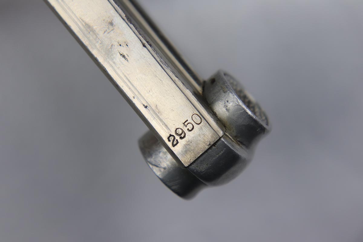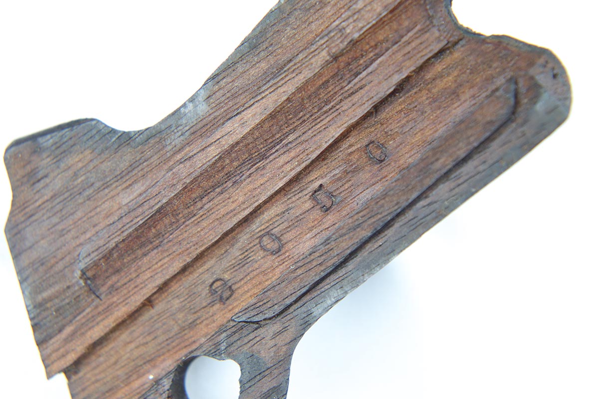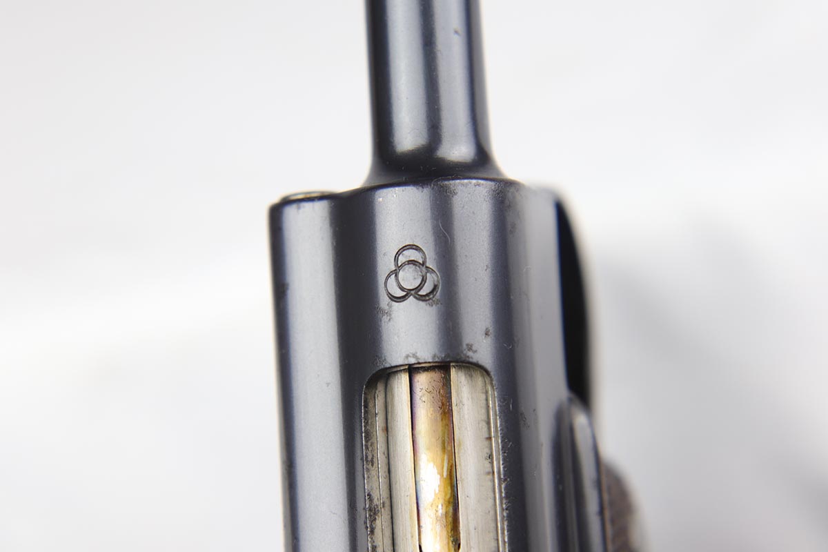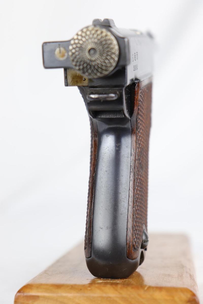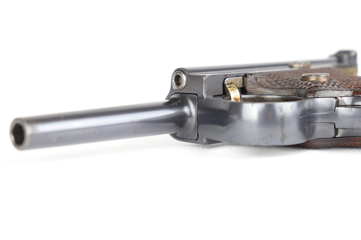 10/29/18 – This is a beautiful Baby Nambu, manufactured at the Tokyo Artillery Arsenal, with its original matching magazine and grips. The original finish rates at 97-98%, with almost no finish loss to mention, but it does have spots of patina in various areas of the frame and slide. There is also minor surface freckling along the left side rail. This pistol falls toward the middle of the serial range for Baby Nambu’s produced by Tokyo AA, of which there were 5,900 made. Other features include “Type Nambu” in Kanji on the right side of frame and checkered walnut grips. These pistols were popular among Japanese officers and acquired the unofficial name of ‘Officers Model Nambu’. These pistols were of the highest quality fit and finish, and are considered a collector’s prize. Excellent bore.