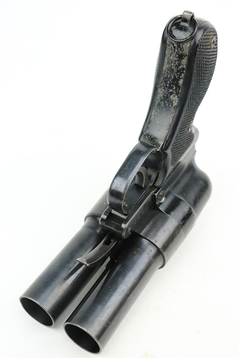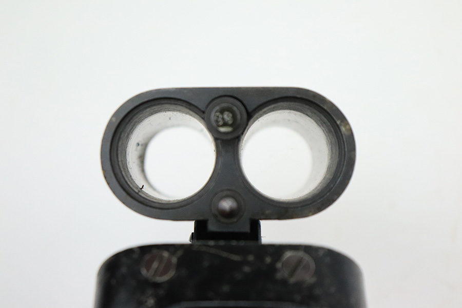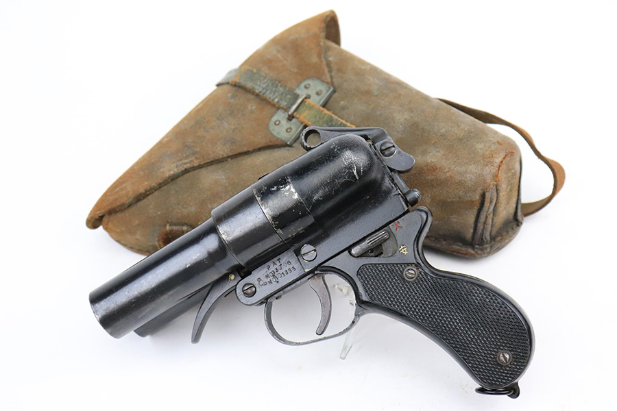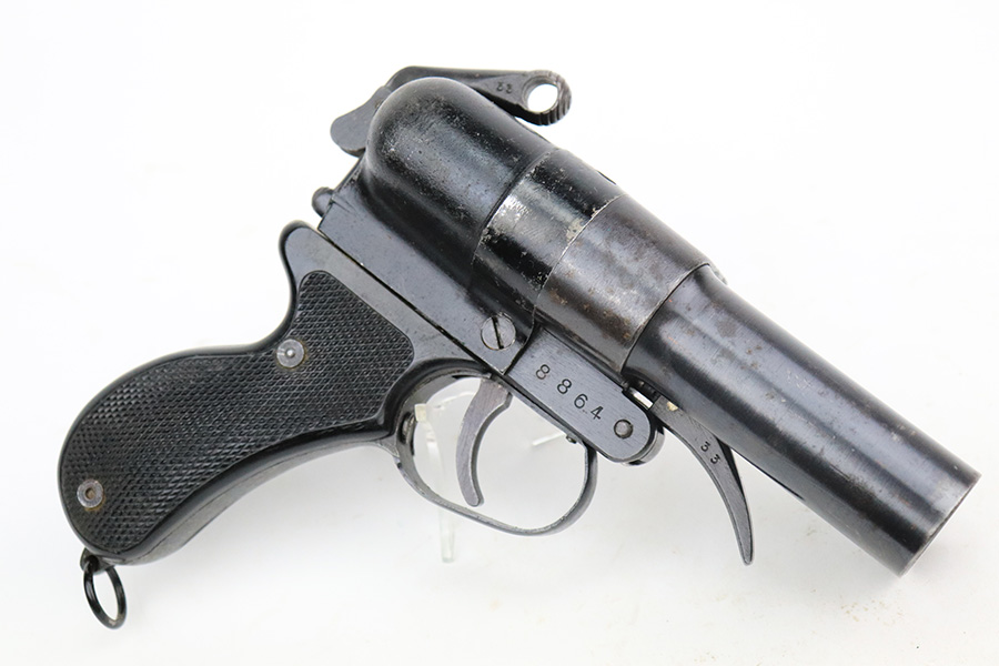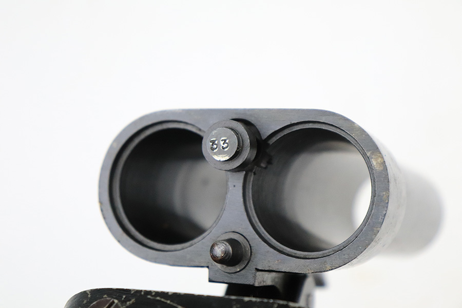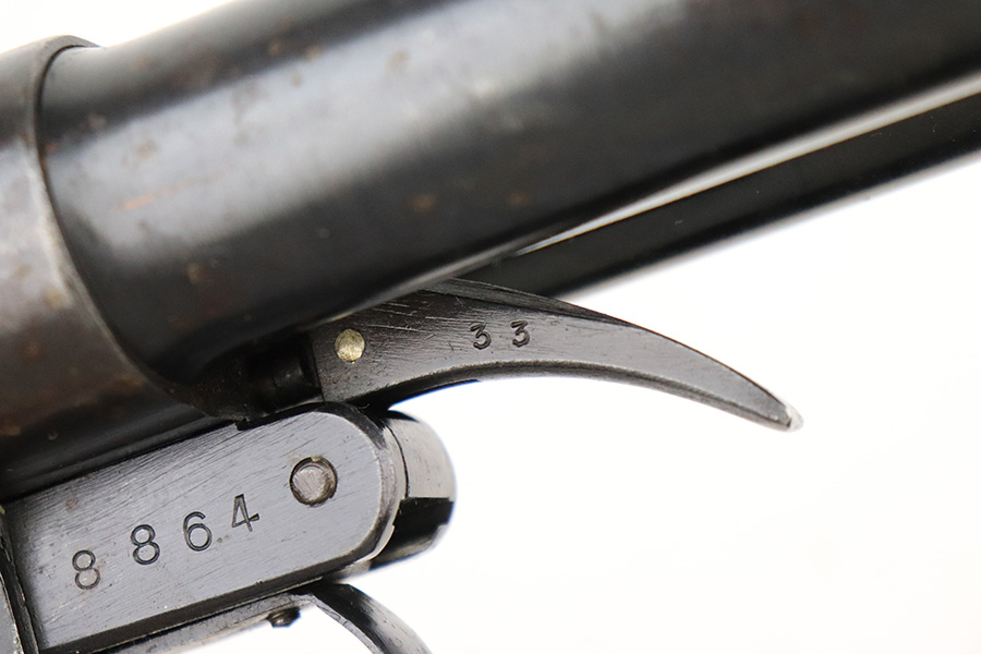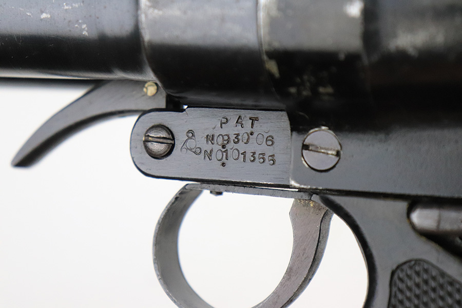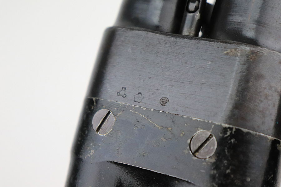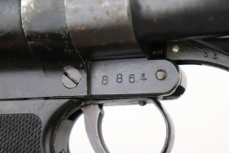 9/7/22 – This is a fairly scarce Japanese Type 90 two-barrel flare gun with original holster that went to the Japanese Air Force. It’s all original with maybe 75% of the finish remaining, with most of the wear/flaking on the grip frame. It’s a third variation example, one of only 3,000 produced, and at time of printing, only 13 examples had been reported for Derby & Brown’s book. The markings on the top feature the “sky” marking, which is believed to indicate Air Force issue. Both bores on this item are in excellent condition. The rig is complete with an original holster that does show age and wear but is generally intact and functional.