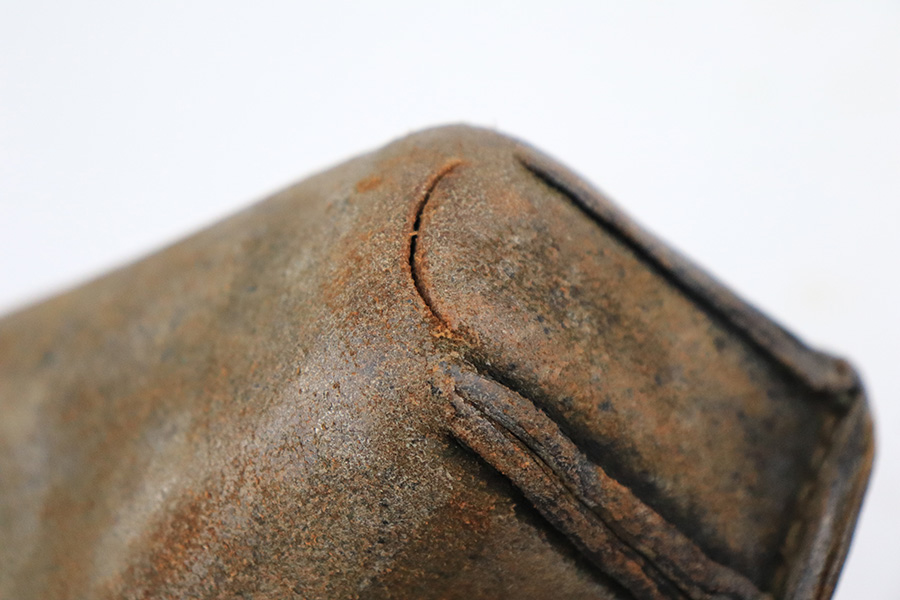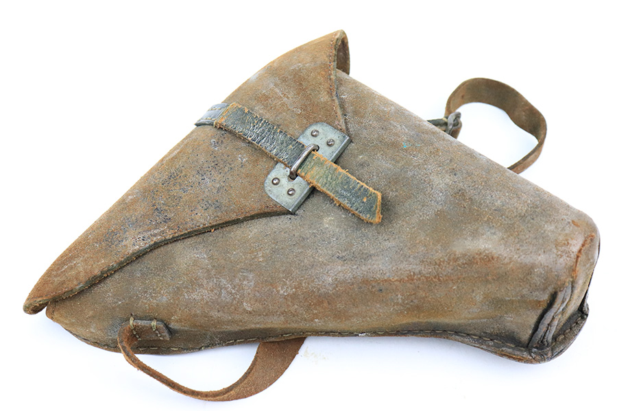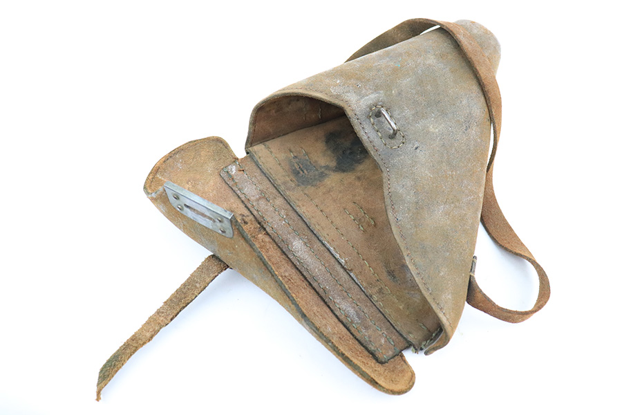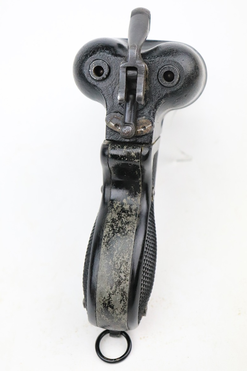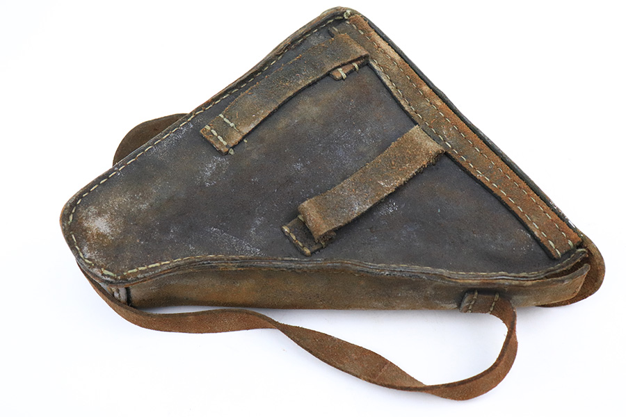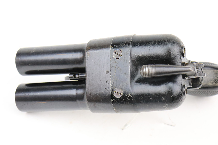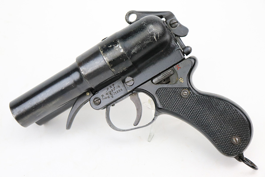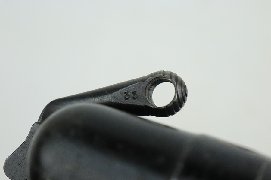 9/7/22 – This is a fairly scarce Japanese Type 90 two-barrel flare gun with original holster that went to the Japanese Air Force. It’s all original with maybe 75% of the finish remaining, with most of the wear/flaking on the grip frame. It’s a third variation example, one of only 3,000 produced, and at time of printing, only 13 examples had been reported for Derby & Brown’s book. The markings on the top feature the “sky” marking, which is believed to indicate Air Force issue. Both bores on this item are in excellent condition. The rig is complete with an original holster that does show age and wear but is generally intact and functional.