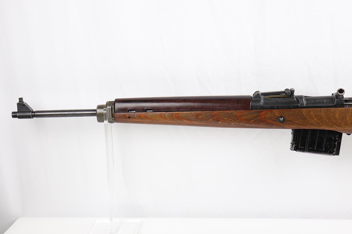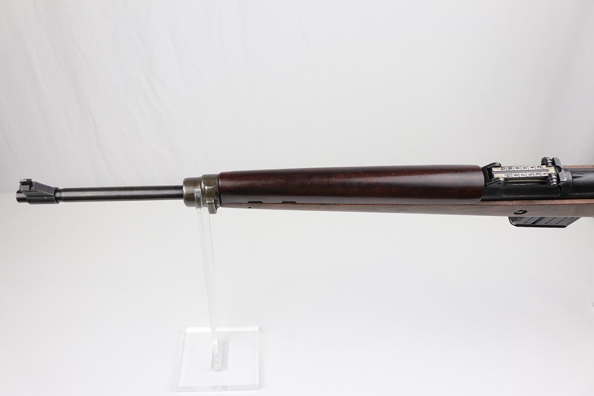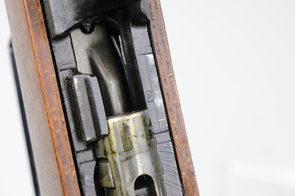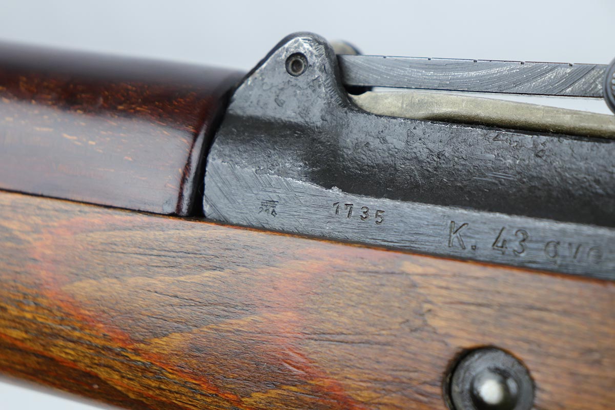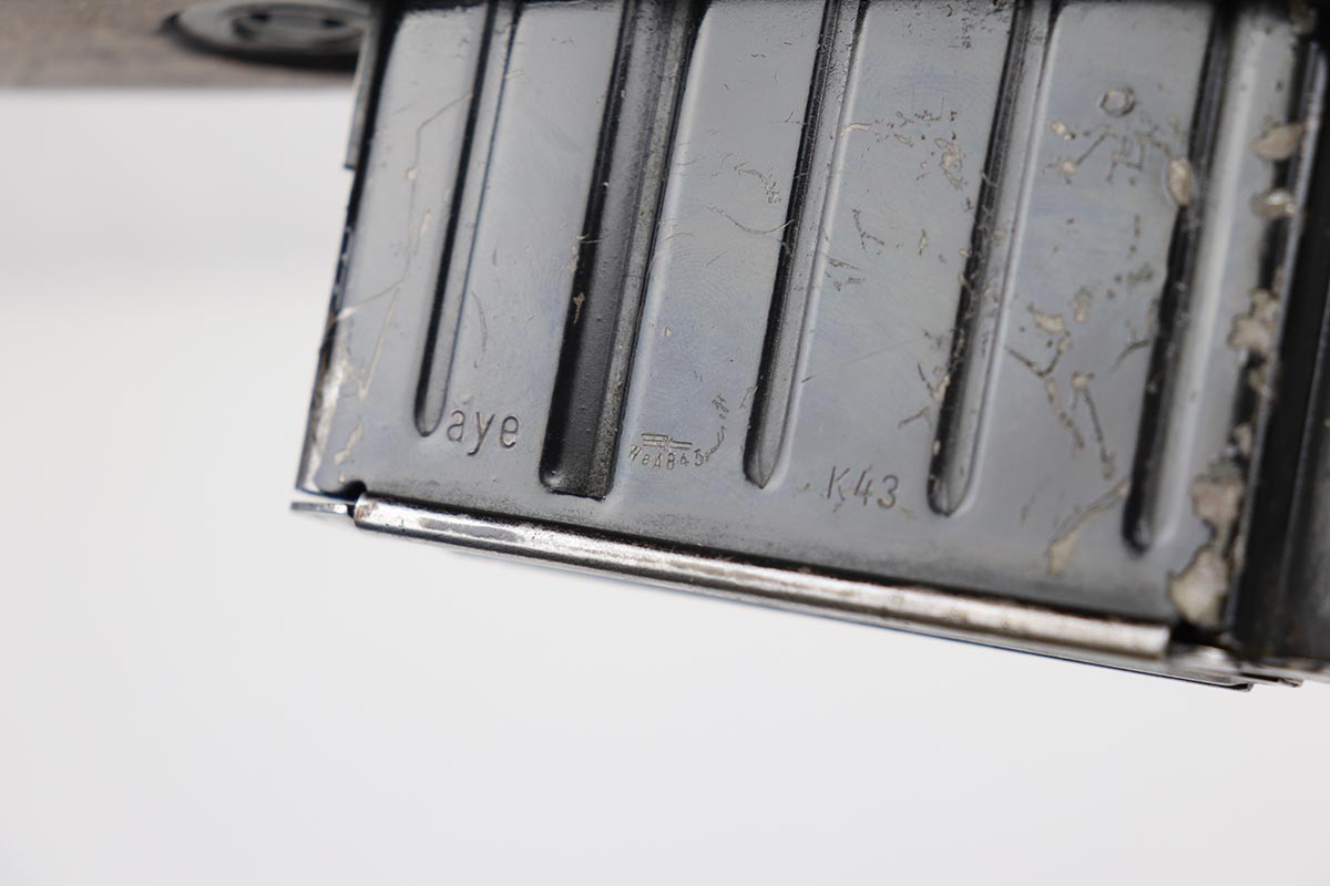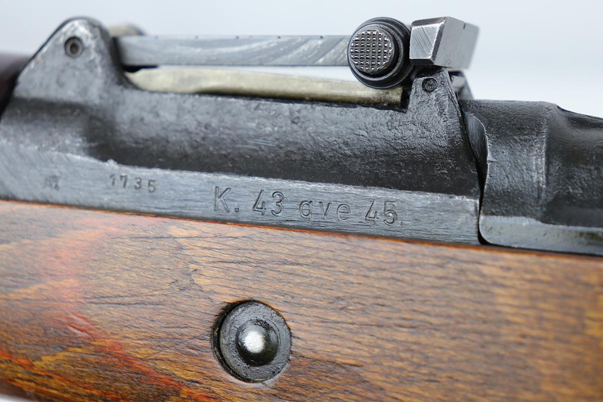 7/3/19 – This is the most uncommon variation of the German G43(K43) rifle, made in the final months of the war, around February-March of 1945. It was made at the Berliner Lubecker factory, which was assigned a ‘qve’ code in 1945 instead of the previous ‘bcd’ code. With a total of about 60,000 rifles made, this variation is one of the least encountered by the collectors and exhibits the late war rough machining and bluing. The gun is all original and matching, including the receiver, bolt and the buttstock. The stock has been lightly sanded, so the waffenamts are no longer visible and the first and last digit of the serial are no longer visible due to how they were applied around the edge. The serial number is a rare “no suffix” serial. The blue is nearly all present and is a typical late war thin blue. Later production style handguard, which is made of a dark red/brown phenolic resin that is like a plastic. There are no cracks in the stock or the hand guard. Bore has strong rifling but frost throughout. Magazine is ‘K43’ marked and ‘aye’ maker marked.