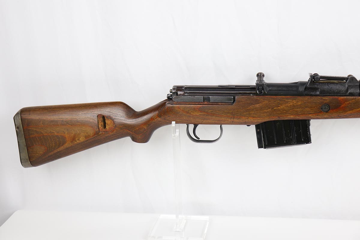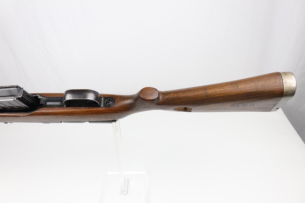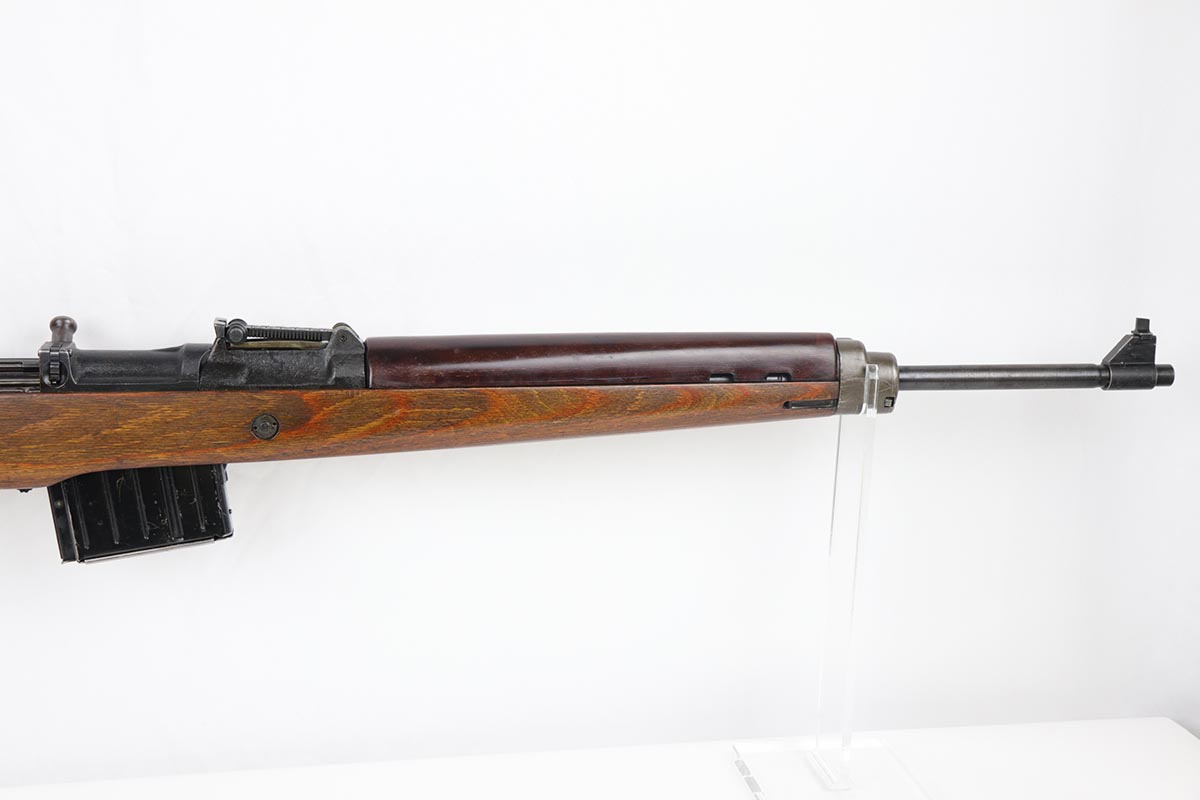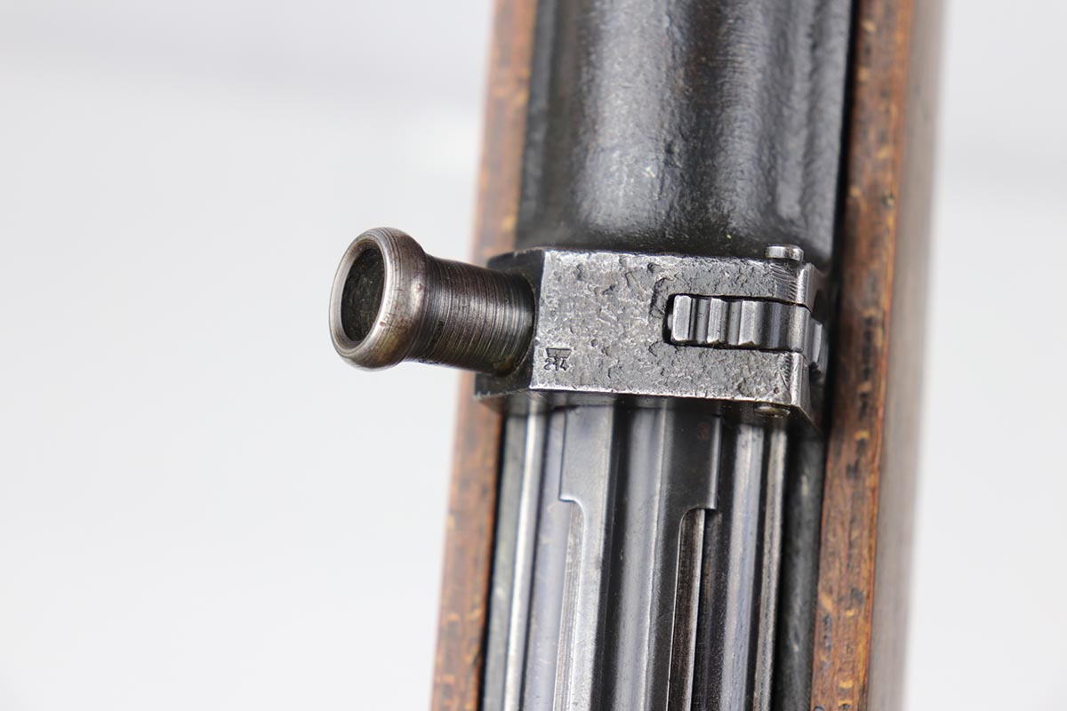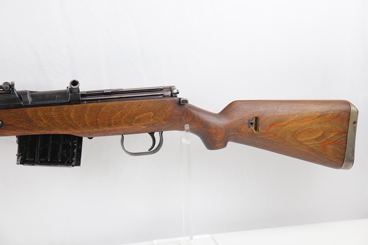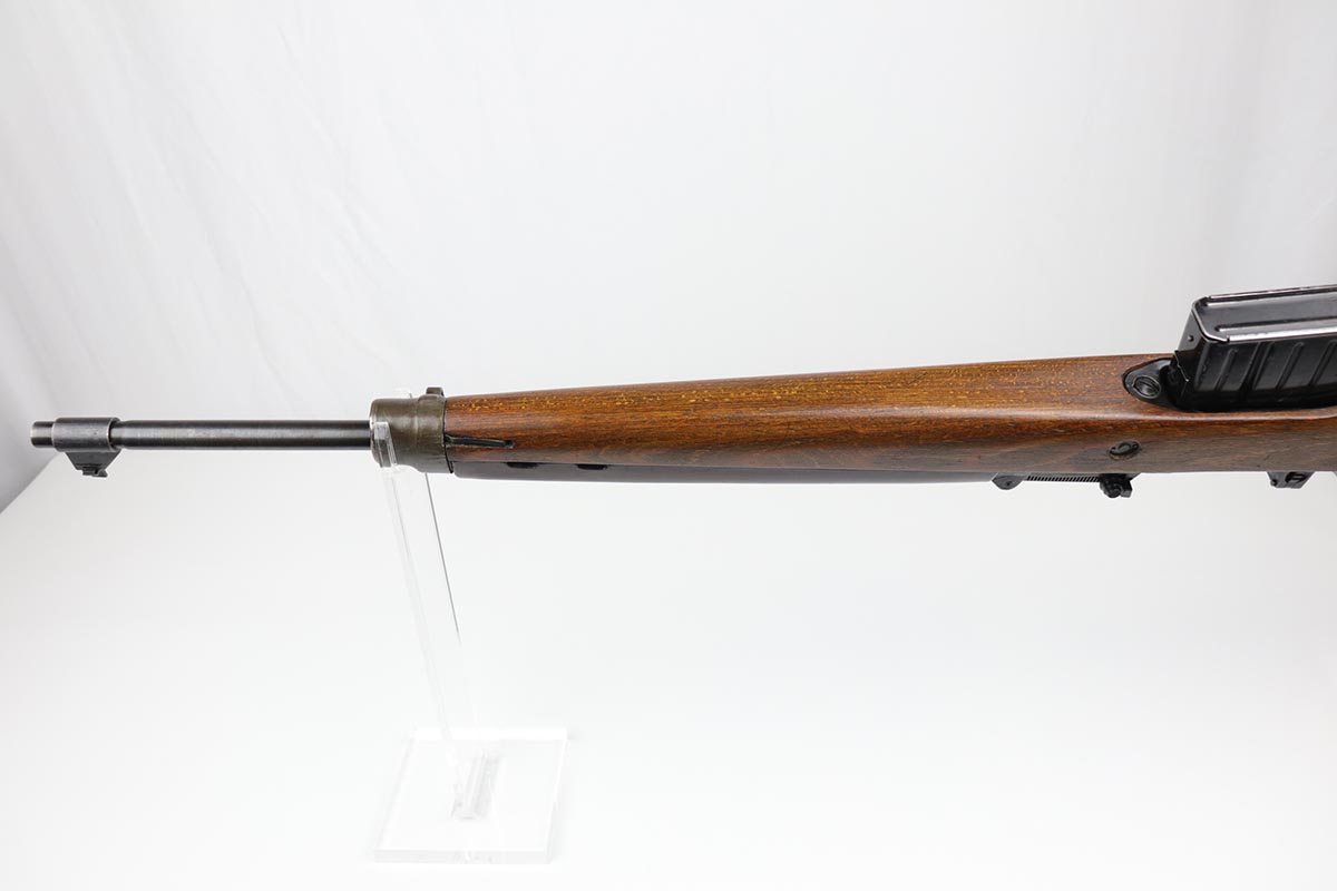 7/3/19 – This is the most uncommon variation of the German G43(K43) rifle, made in the final months of the war, around February-March of 1945. It was made at the Berliner Lubecker factory, which was assigned a ‘qve’ code in 1945 instead of the previous ‘bcd’ code. With a total of about 60,000 rifles made, this variation is one of the least encountered by the collectors and exhibits the late war rough machining and bluing. The gun is all original and matching, including the receiver, bolt and the buttstock. The stock has been lightly sanded, so the waffenamts are no longer visible and the first and last digit of the serial are no longer visible due to how they were applied around the edge. The serial number is a rare “no suffix” serial. The blue is nearly all present and is a typical late war thin blue. Later production style handguard, which is made of a dark red/brown phenolic resin that is like a plastic. There are no cracks in the stock or the hand guard. Bore has strong rifling but frost throughout. Magazine is ‘K43’ marked and ‘aye’ maker marked.