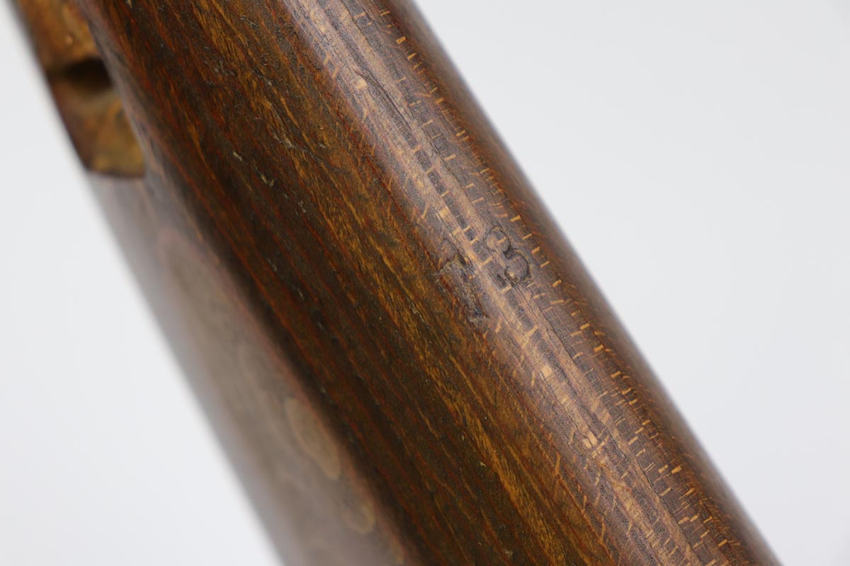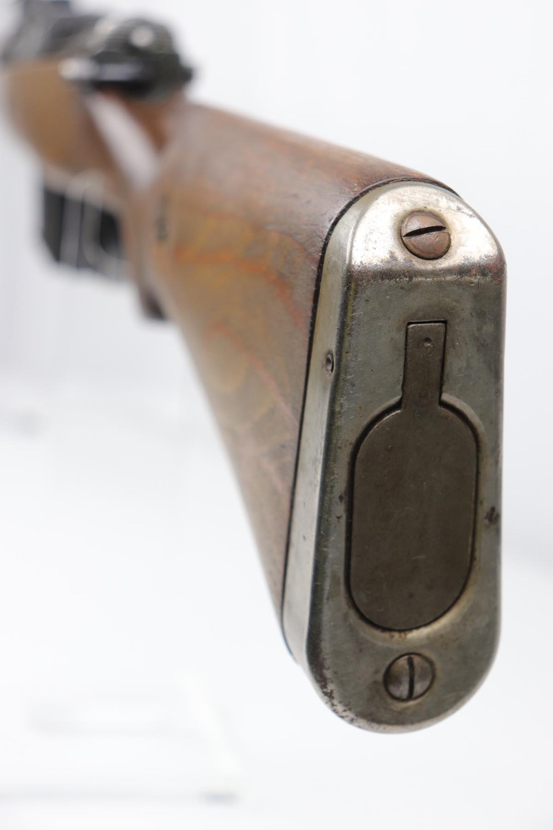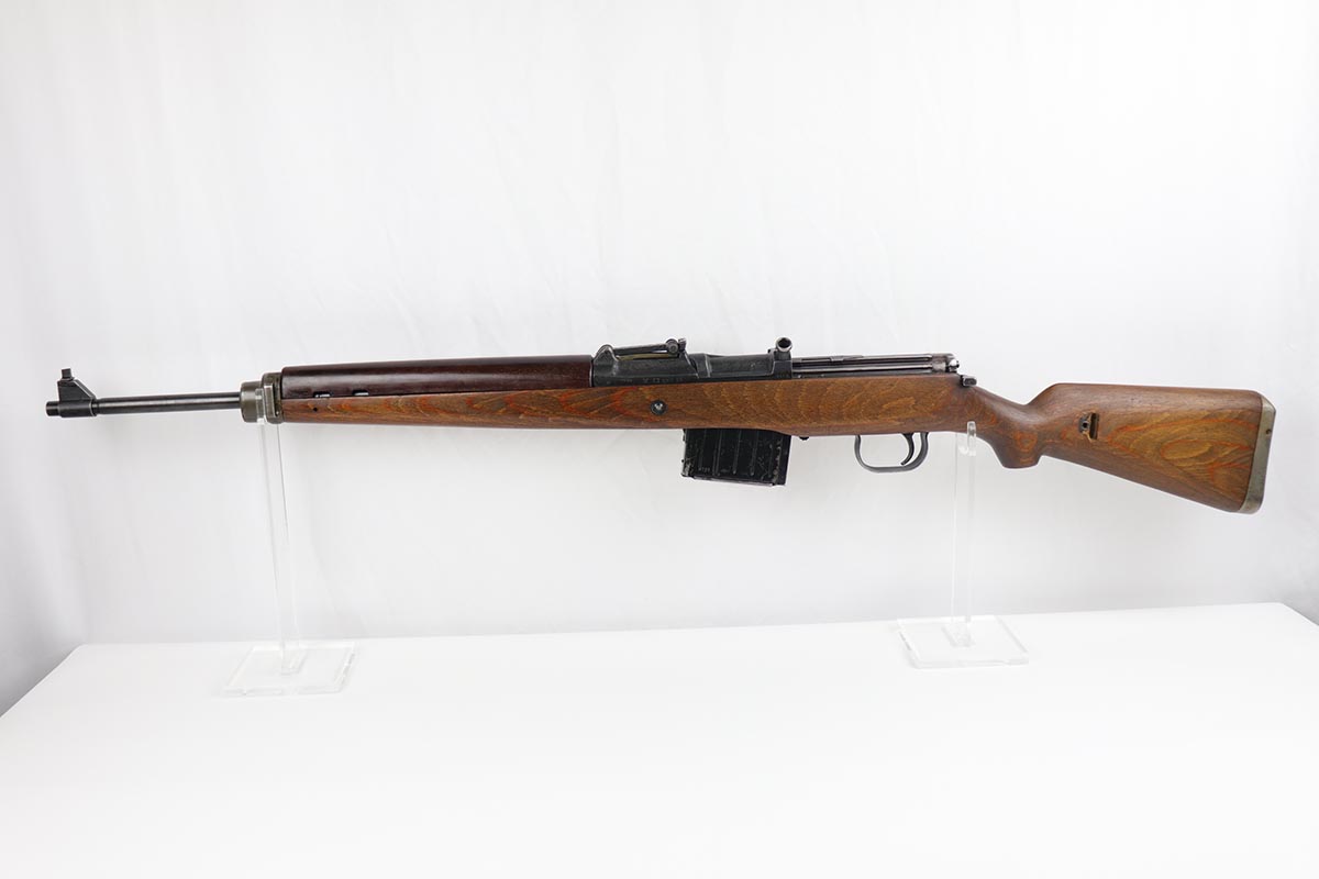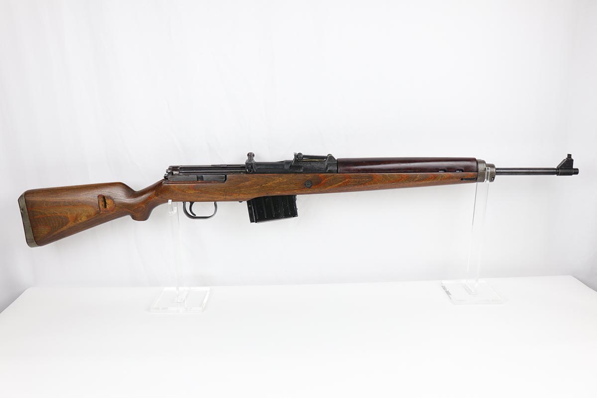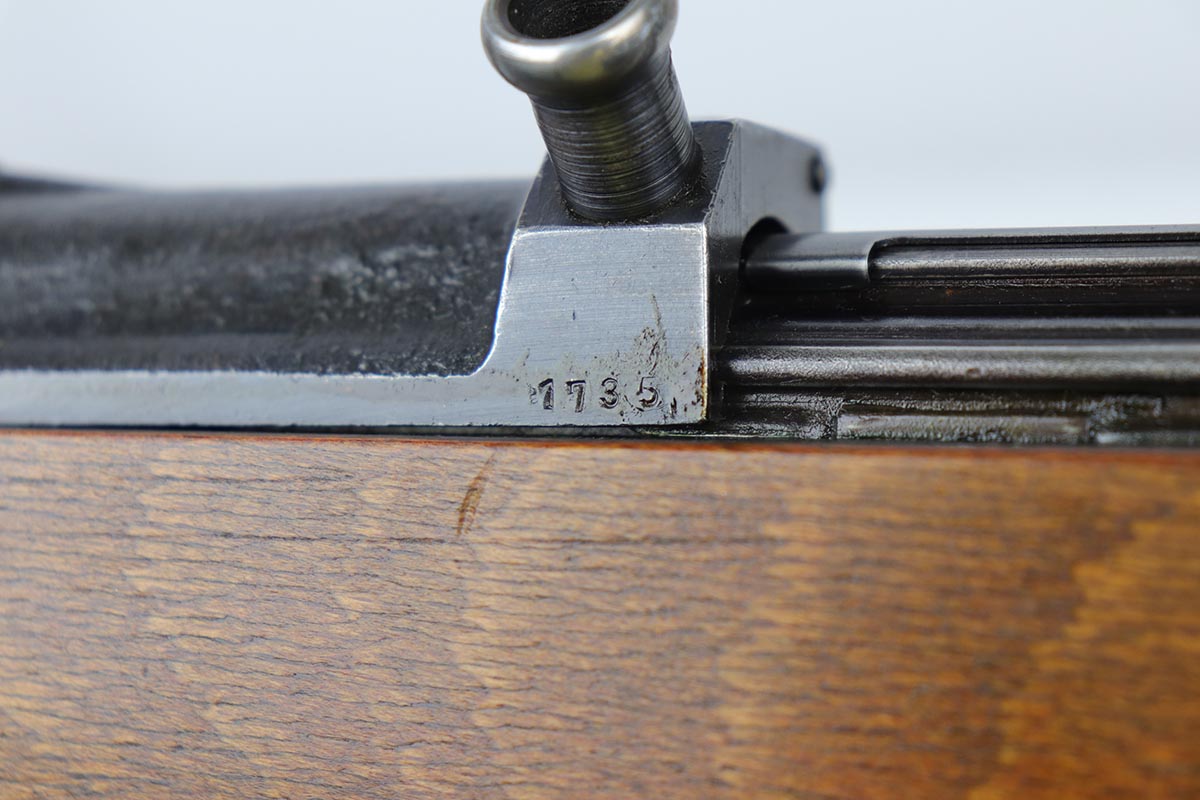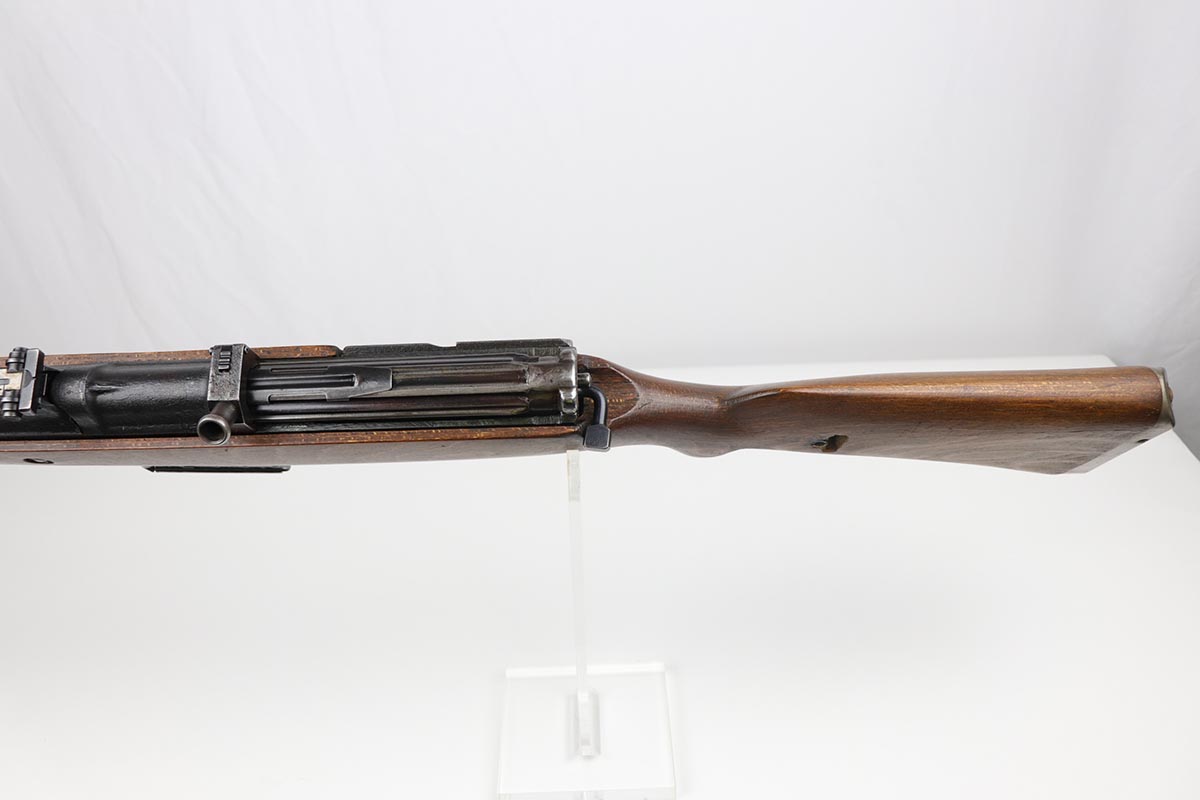7/3/19 – This is the most uncommon variation of the German G43(K43) rifle, made in the final months of the war, around February-March of 1945. It was made at the Berliner Lubecker factory, which was assigned a ‘qve’ code in 1945 instead of the previous ‘bcd’ code. With a total of about 60,000 rifles made, this variation is one of the least encountered by the collectors and exhibits the late war rough machining and bluing. The gun is all original and matching, including the receiver, bolt and the buttstock. The stock has been lightly sanded, so the waffenamts are no longer visible and the first and last digit of the serial are no longer visible due to how they were applied around the edge. The serial number is a rare “no suffix” serial. The blue is nearly all present and is a typical late war thin blue. Later production style handguard, which is made of a dark red/brown phenolic resin that is like a plastic. There are no cracks in the stock or the hand guard. Bore has strong rifling but frost throughout. Magazine is ‘K43’ marked and ‘aye’ maker marked.