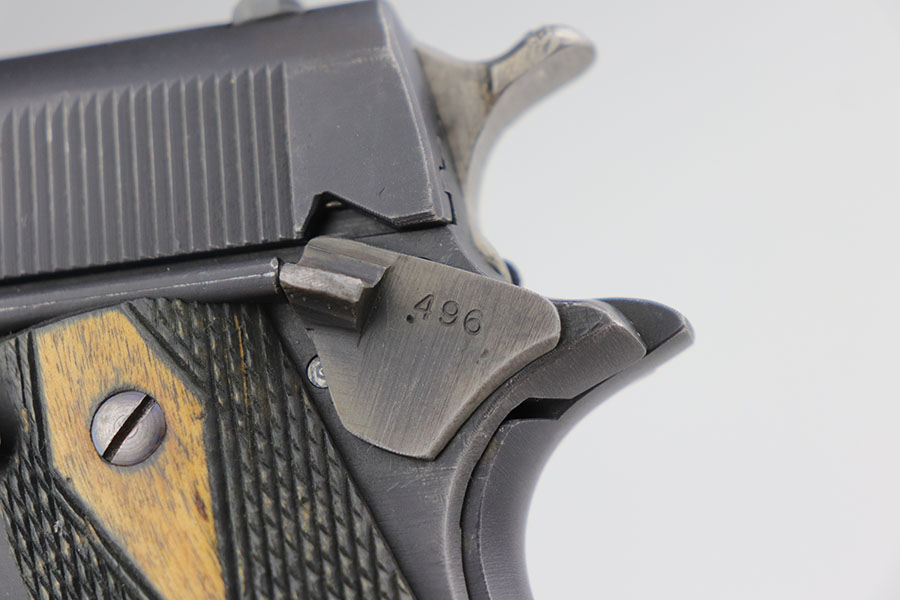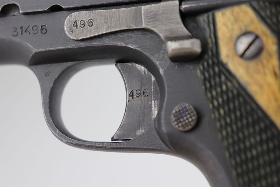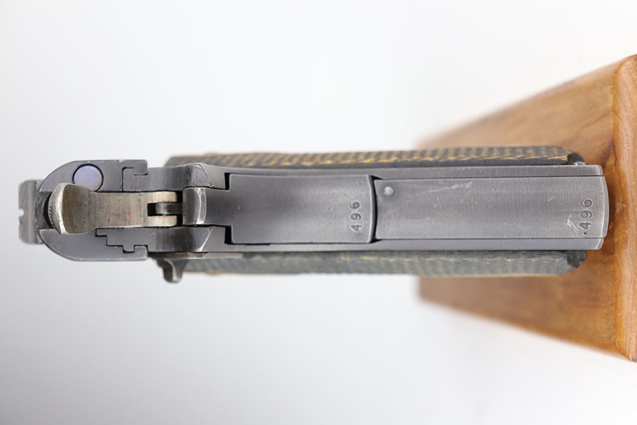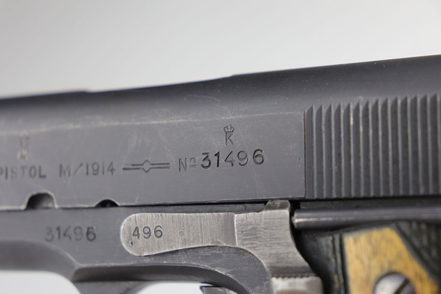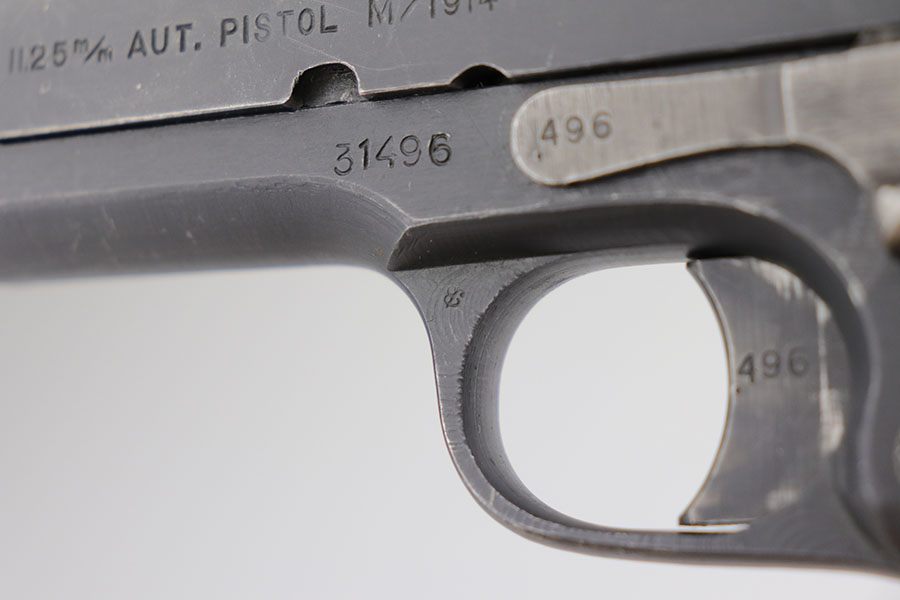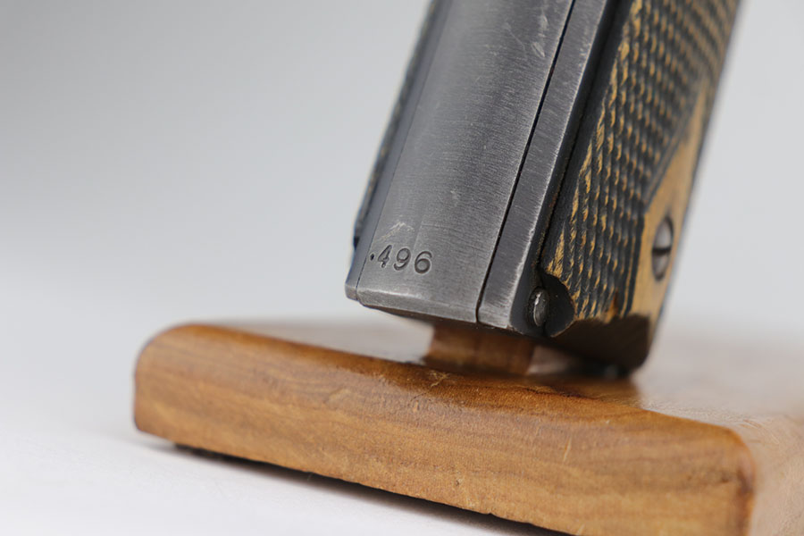 1/19/21 – This is a fairly rare Kongsberg Model 1914 that was manufactured in 1945, following the defeat and removal of the German forces. There were only about 2,300 pistols completed after the war, all from remaining parts, so it’s very common to see partial overstamps on serial numbers from guns completed after the Nazi occupation. This gun is one such example, all matching and original. The finish rates at about 95-97% with most of the wear on the front strap, and only minor scuffing elsewhere. Original grips and magazine. Bore is shiny but does have a little frost/freckling.