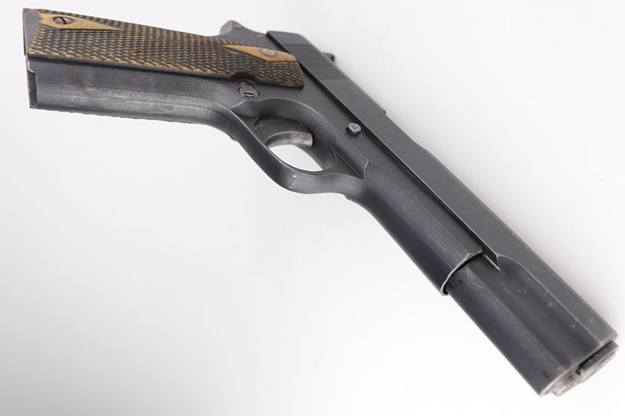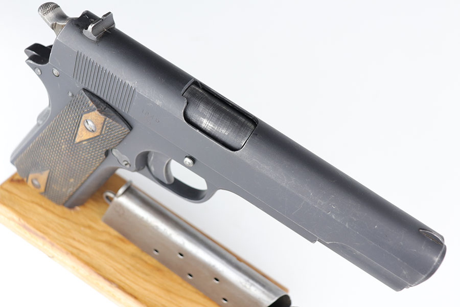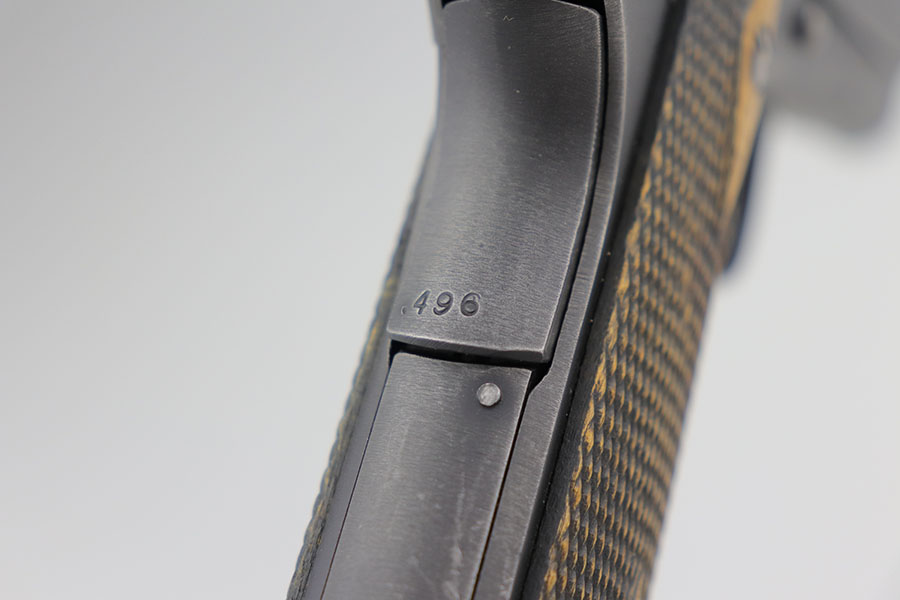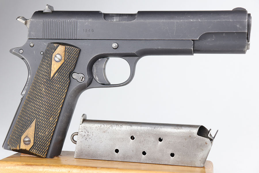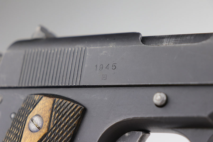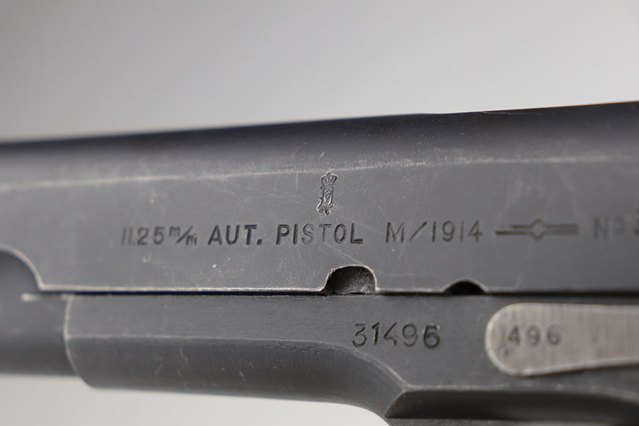1/19/21 – This is a fairly rare Kongsberg Model 1914 that was manufactured in 1945, following the defeat and removal of the German forces. There were only about 2,300 pistols completed after the war, all from remaining parts, so it’s very common to see partial overstamps on serial numbers from guns completed after the Nazi occupation. This gun is one such example, all matching and original. The finish rates at about 95-97% with most of the wear on the front strap, and only minor scuffing elsewhere. Original grips and magazine. Bore is shiny but does have a little frost/freckling.