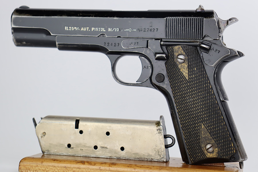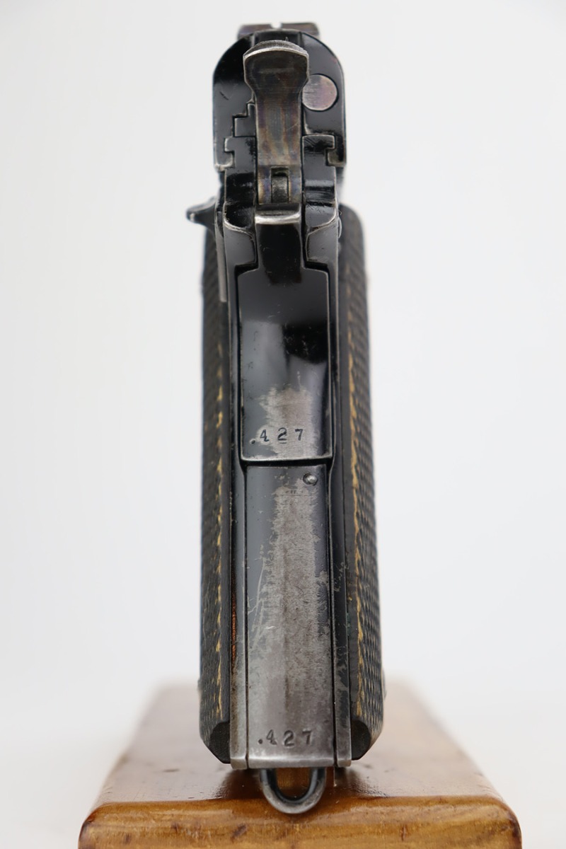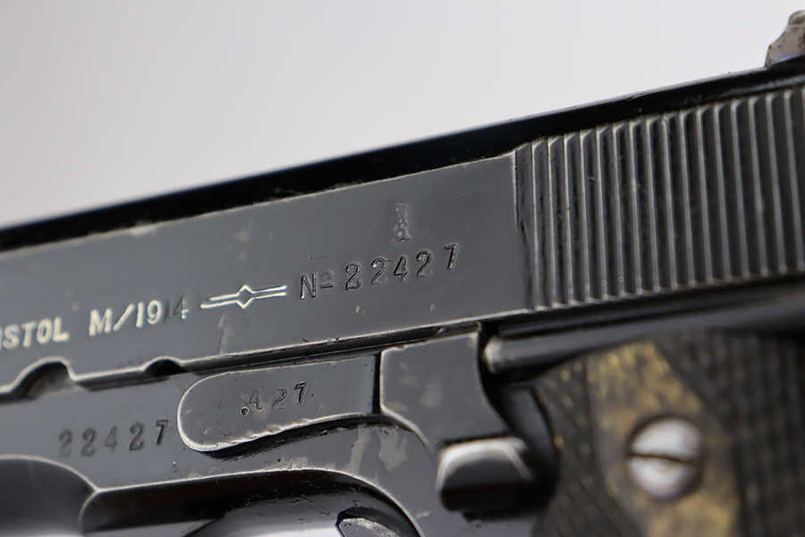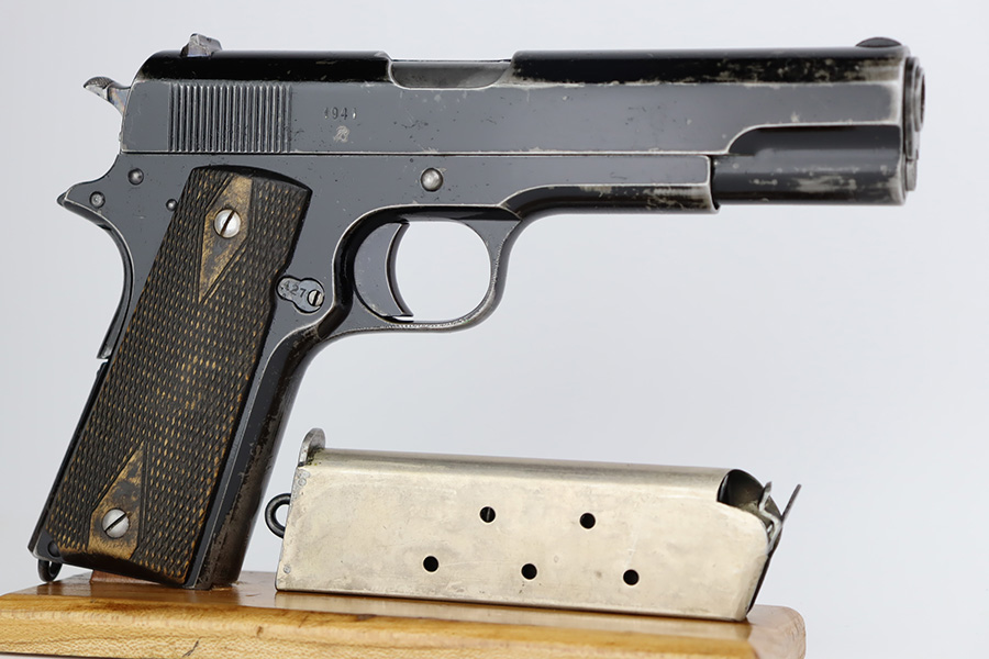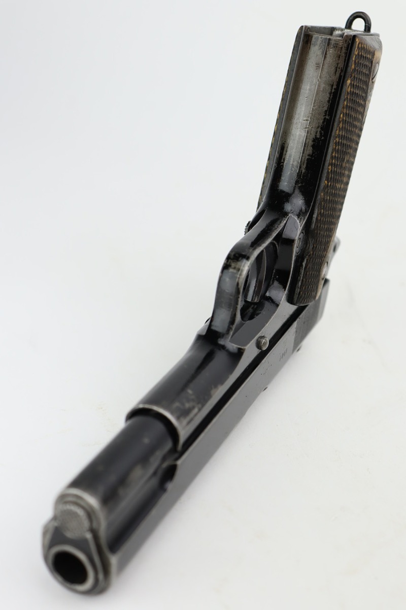10/3/23 – In 1914, Norway began producing a copy of the Colt 1911 to be the standard military sidearm, and named it the M1914. From 1940 to 1945, its output fell into the hands of Germans and led to production of these pistols that saw use in the various German military and police branches. Unlike the later waffen-marked variants, the earlier pistols likely saw actual use during the war. This particular pistol was made in 1941 for use by the Germans and is one of only about 8,200 produced under German occupation. It is fully matching (including the barrel) and has retained roughly 80% of its original black enamel finish. The majority of the wear is on the front strap, but there is high edge wear in general, and tiny chips and scratches in the finish throughout. Fitted with wood grips with correct black wash. Comes with a proper magazine with the lanyard loop. Excellent bore. Slide sits slightly forward of frame at rear.