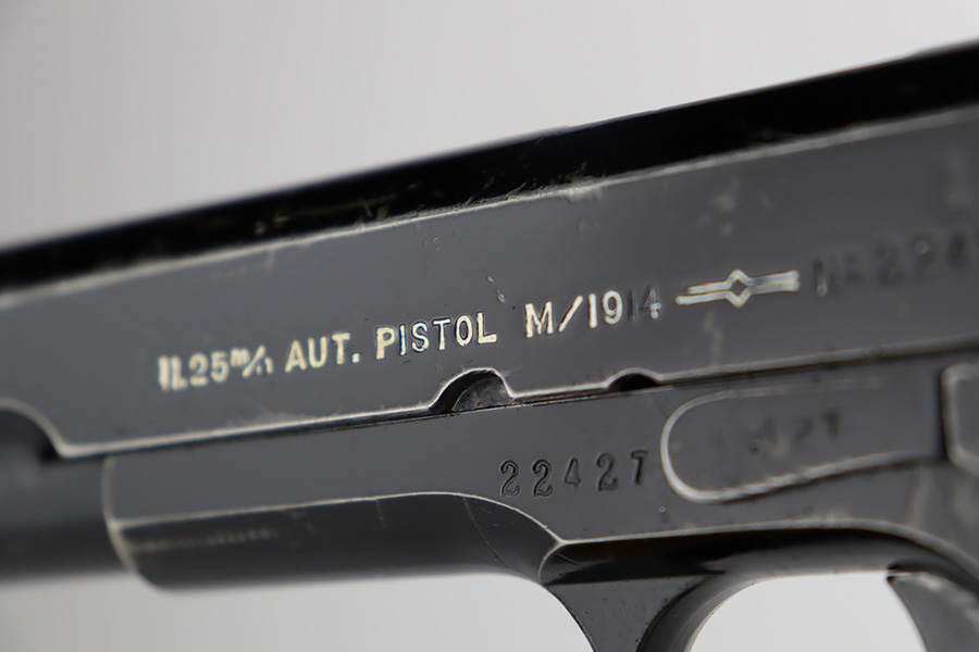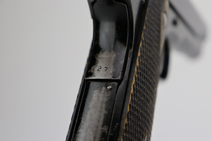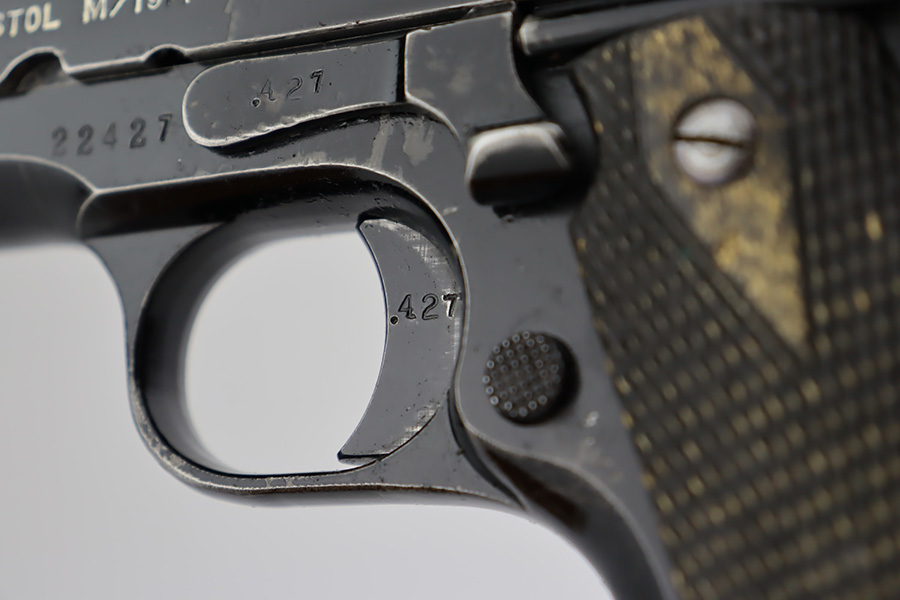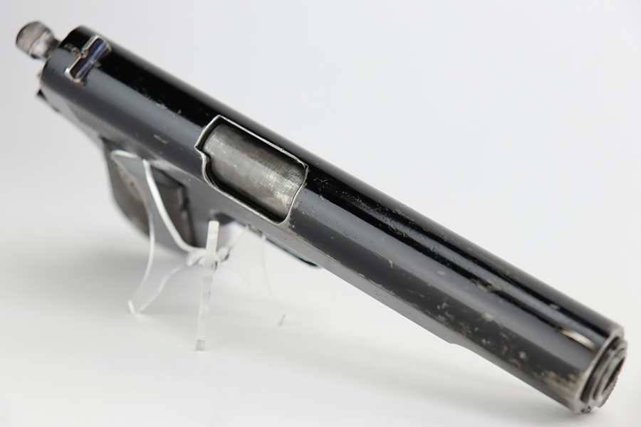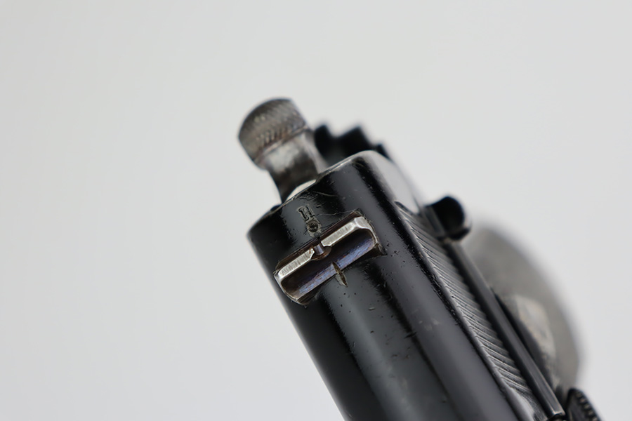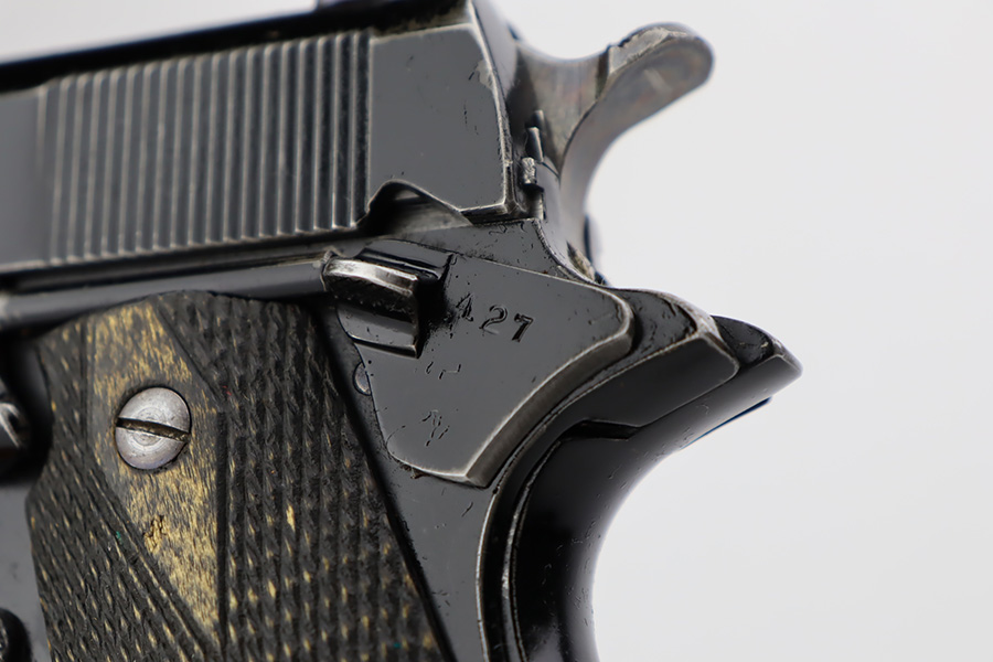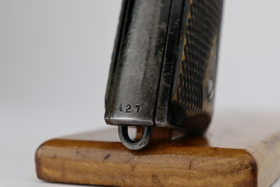 10/3/23 – In 1914, Norway began producing a copy of the Colt 1911 to be the standard military sidearm, and named it the M1914. From 1940 to 1945, its output fell into the hands of Germans and led to production of these pistols that saw use in the various German military and police branches. Unlike the later waffen-marked variants, the earlier pistols likely saw actual use during the war. This particular pistol was made in 1941 for use by the Germans and is one of only about 8,200 produced under German occupation. It is fully matching (including the barrel) and has retained roughly 80% of its original black enamel finish. The majority of the wear is on the front strap, but there is high edge wear in general, and tiny chips and scratches in the finish throughout. Fitted with wood grips with correct black wash. Comes with a proper magazine with the lanyard loop. Excellent bore. Slide sits slightly forward of frame at rear.