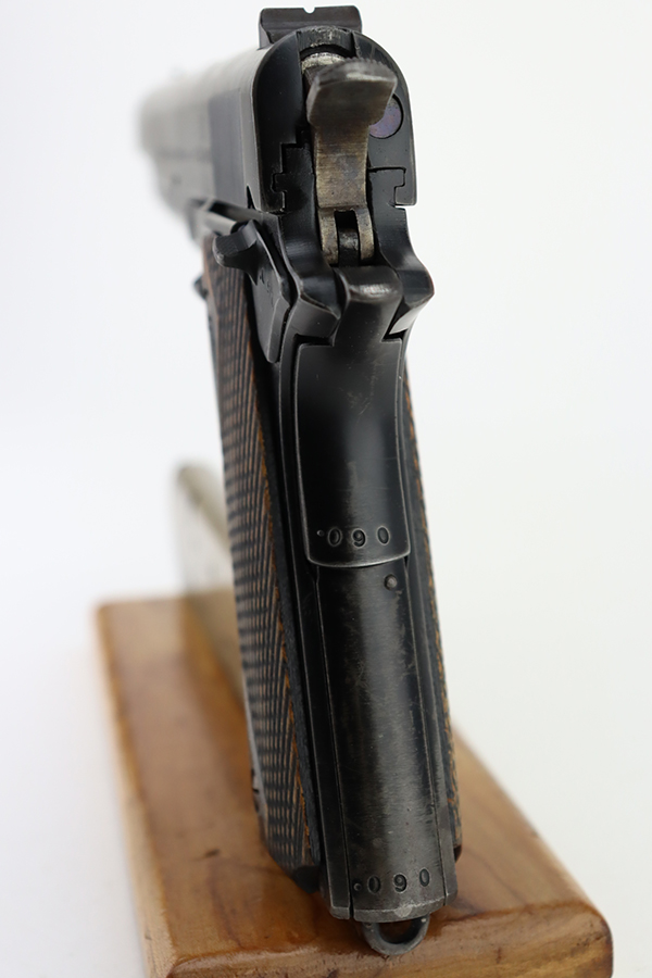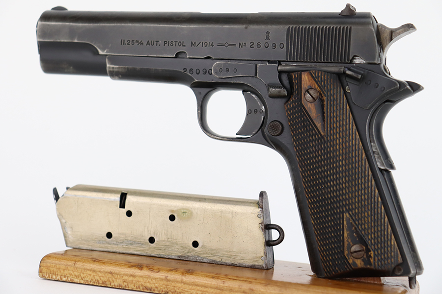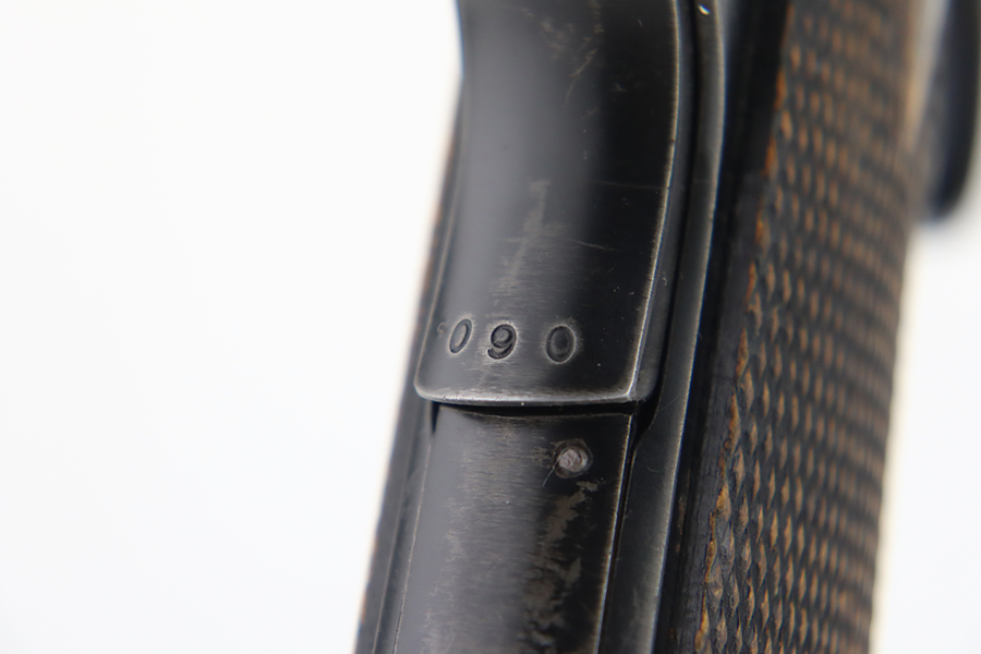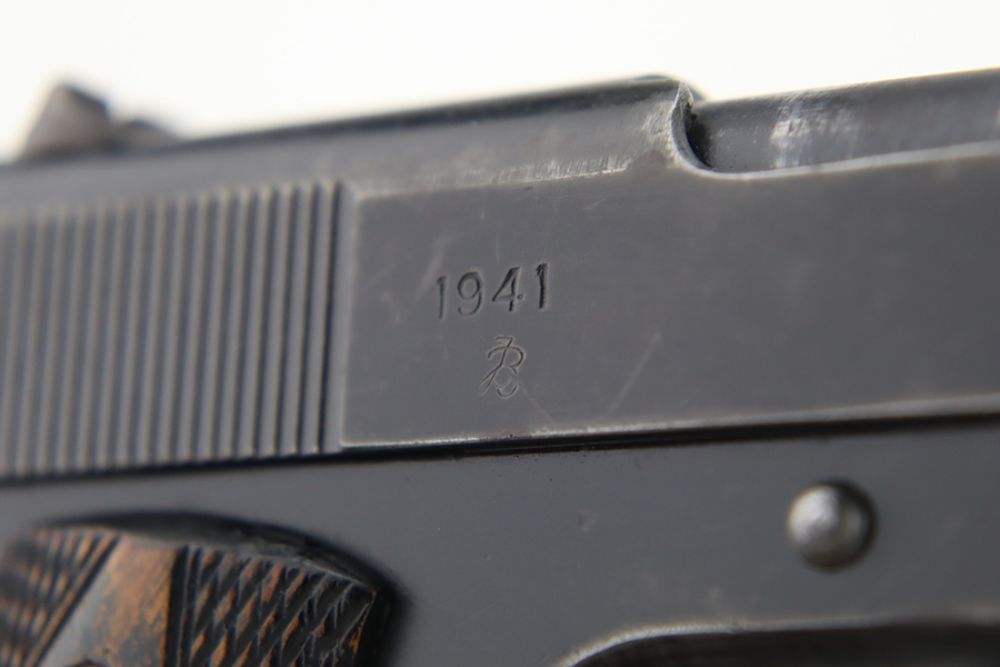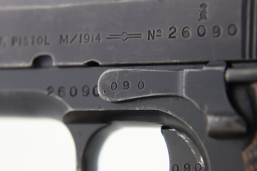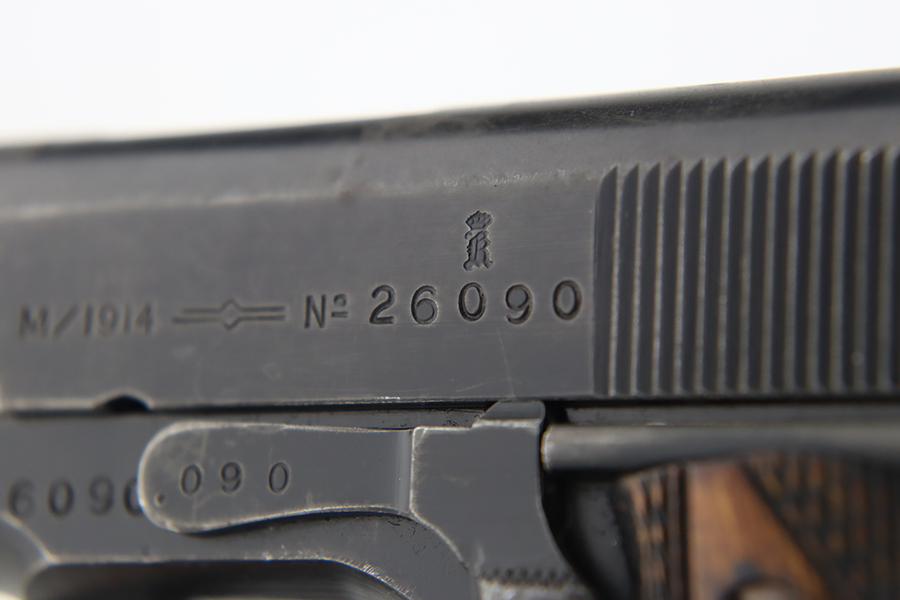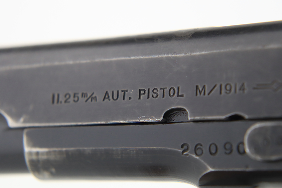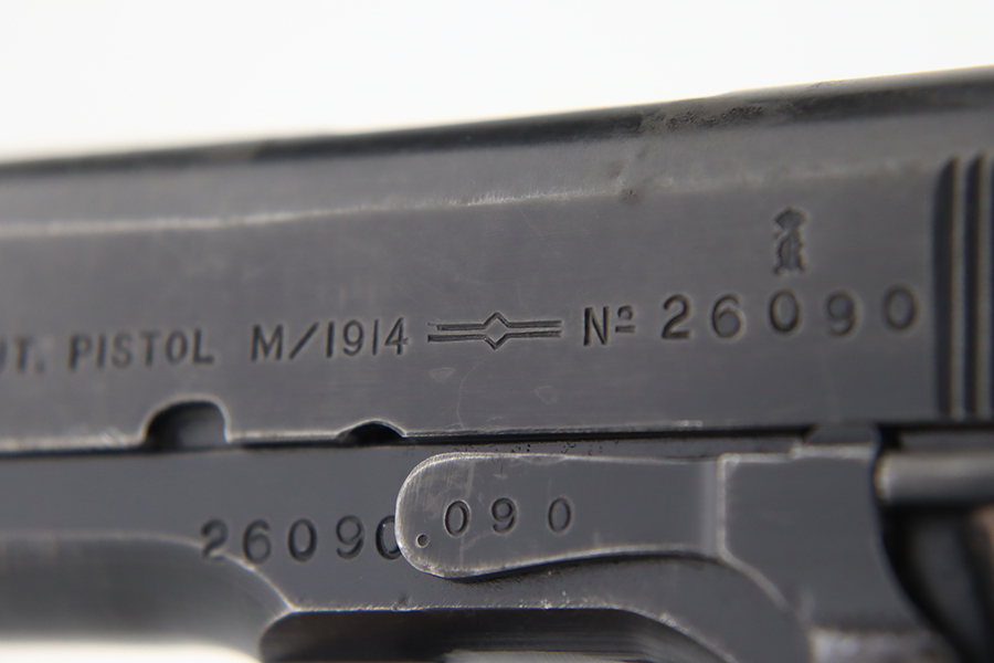 1/31/24 – In 1914, Norway began producing a copy of the Colt 1911 to be the standard military sidearm, and named it the M1914. From 1940 to 1945, its output fell into the hands of Germans and led to production of these pistols that saw use in the various German military and police branches. Unlike the later waffen-marked variants, the earlier pistols likely saw actual use during the war. This particular pistol was made in 1941 for use by the Germans and is one of only about 8,200 produced under German occupation. It is fully matching (including the barrel) and has retained roughly 75-80% of its original black enamel finish. There is general high edge wear, thinning on the straps, and some spotty discoloration along the top of the slide. Fitted with wood grips with correct black wash. Comes with a proper magazine with the lanyard loop. Very nice bore.