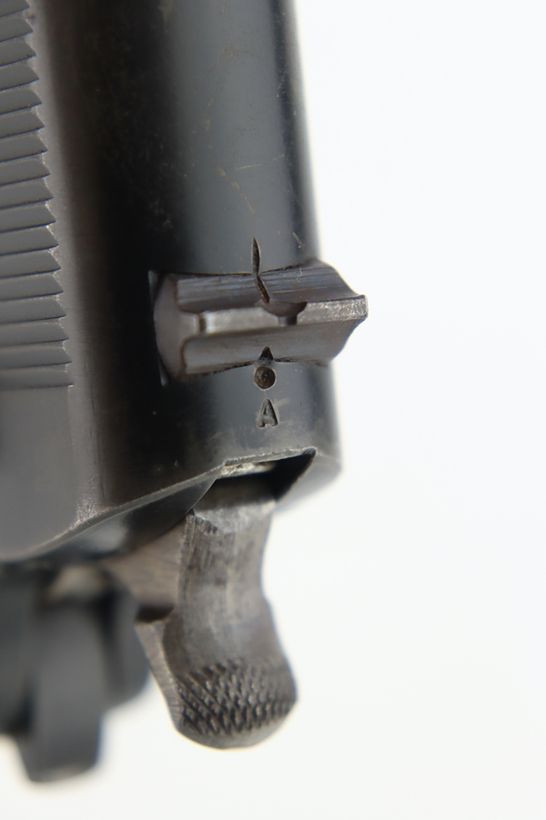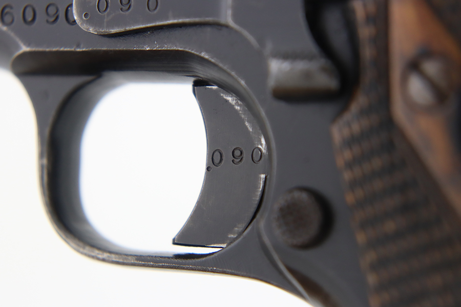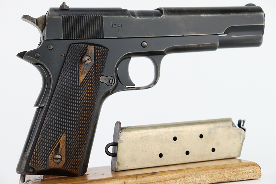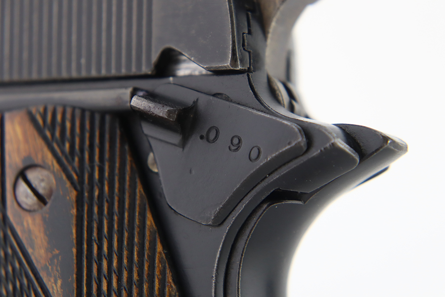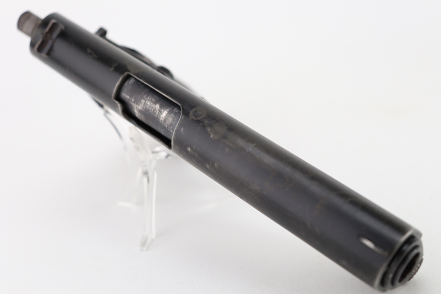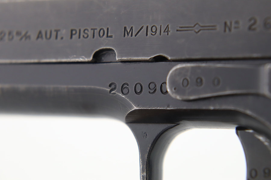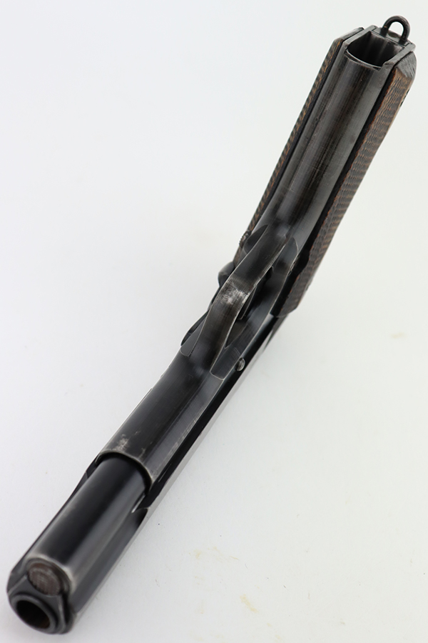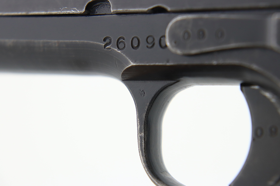 1/31/24 – In 1914, Norway began producing a copy of the Colt 1911 to be the standard military sidearm, and named it the M1914. From 1940 to 1945, its output fell into the hands of Germans and led to production of these pistols that saw use in the various German military and police branches. Unlike the later waffen-marked variants, the earlier pistols likely saw actual use during the war. This particular pistol was made in 1941 for use by the Germans and is one of only about 8,200 produced under German occupation. It is fully matching (including the barrel) and has retained roughly 75-80% of its original black enamel finish. There is general high edge wear, thinning on the straps, and some spotty discoloration along the top of the slide. Fitted with wood grips with correct black wash. Comes with a proper magazine with the lanyard loop. Very nice bore.