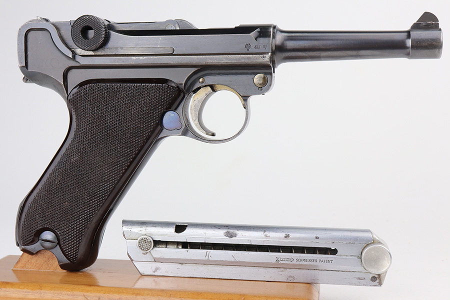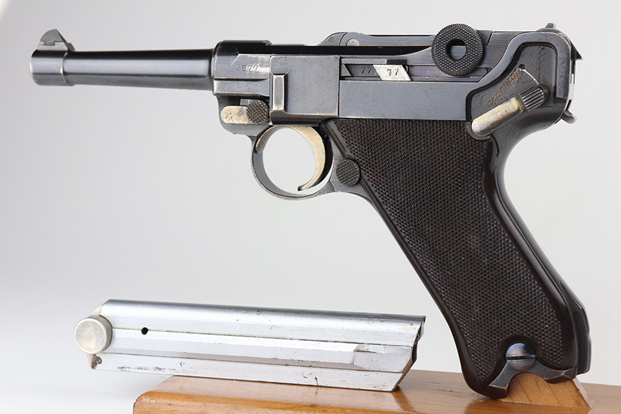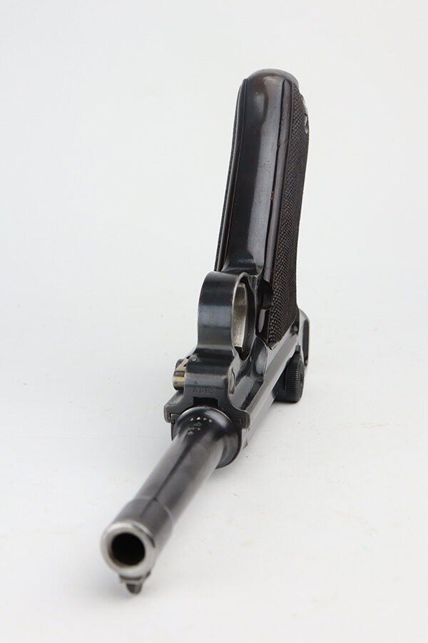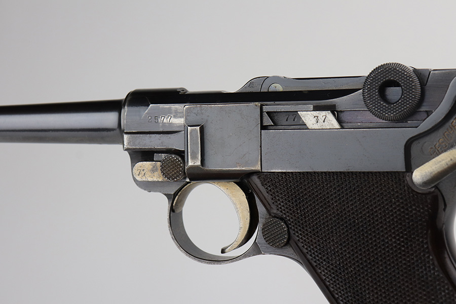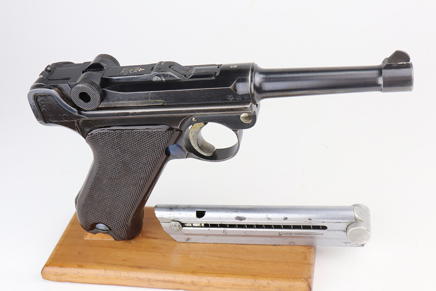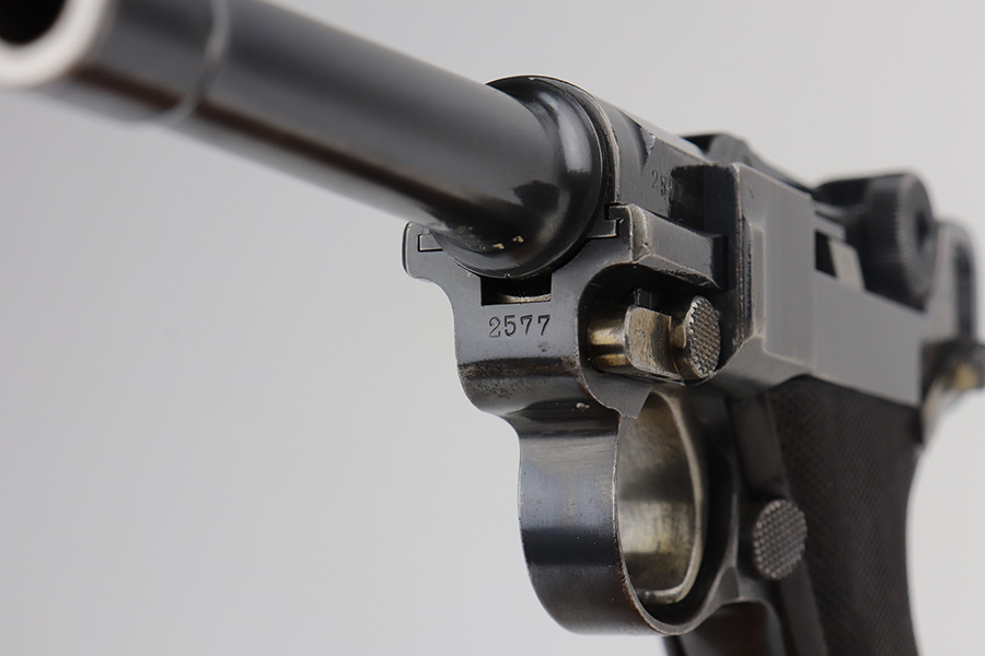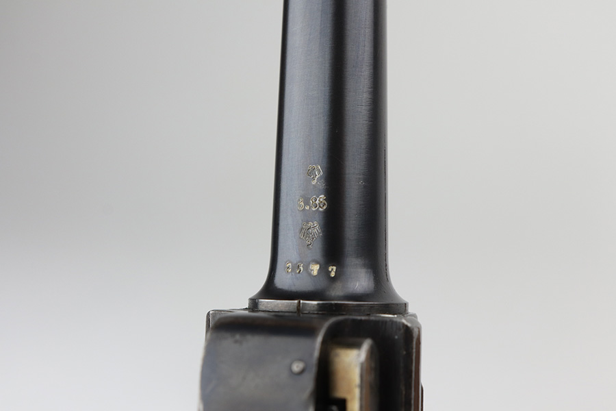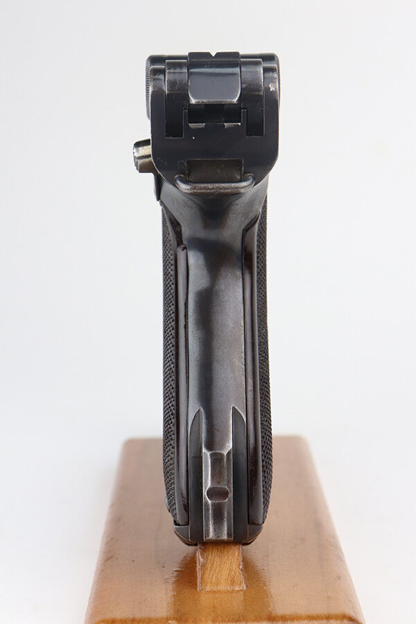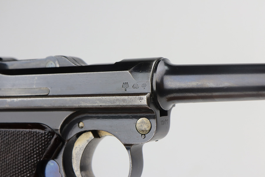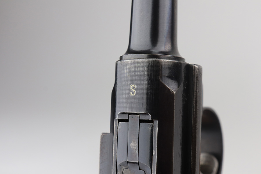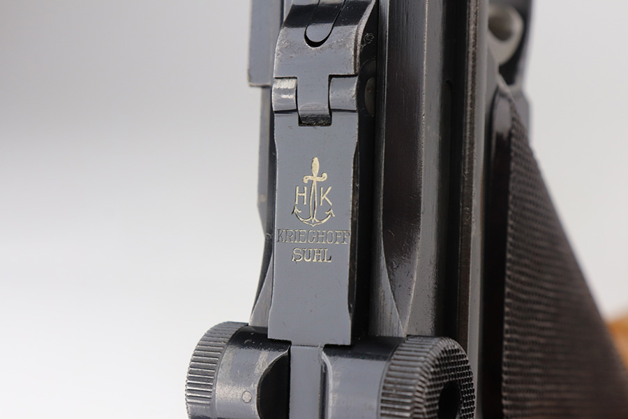 6/11/21 – This is an early (made in 1936) S Code Krieghoff with all matching numbers, including the magazine though the numbering is not factory original (only on the magazine). The original finish is in the 85-90% range with the straw color small parts showing about 70% of the original finish. Most of the wear is found on the right side rail, sideplate and front strap. Also some oxidation on the back strap. It comes with the early, fine checkered Ritz grips. The serial indicates that it was made right at the transition from Ritz grips to the courser reddish grips. The mechanics are very good and bore is mint. The gun was part of a Luftwaffe contract with many of these guns going to pilots and paratroopers. The production numbers were very low for each year they were made. Only about 1,500 of the S Code Krieghoffs were issued. This gun has correct Luftwaffe Eagle L/2 proofs on the frame, barrel, toggle, magazine as well as many small parts such as the hold open, the firing pin and then rear toggle pin. The gun is all correct and original with the exception of the magazine.