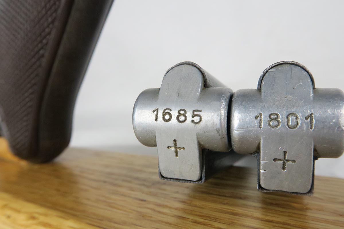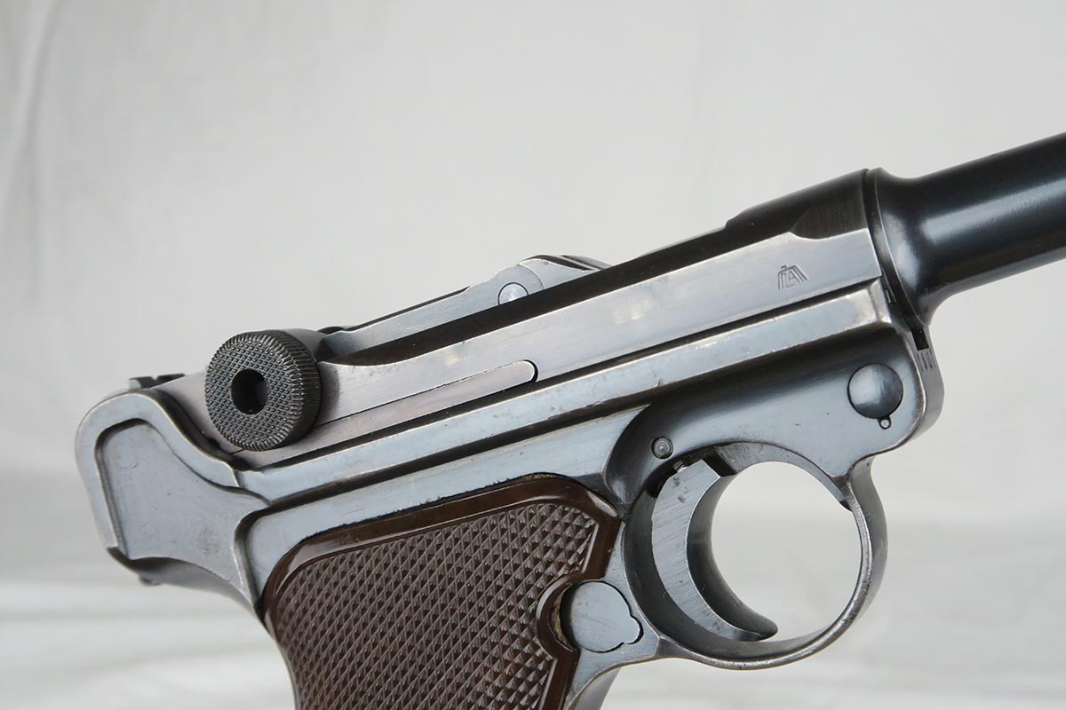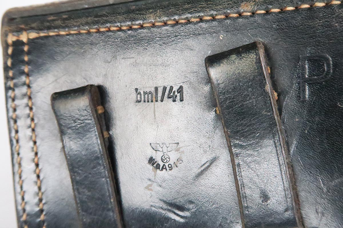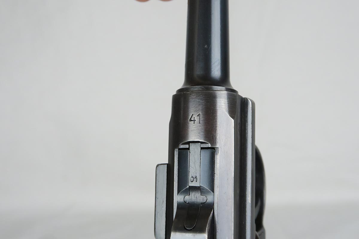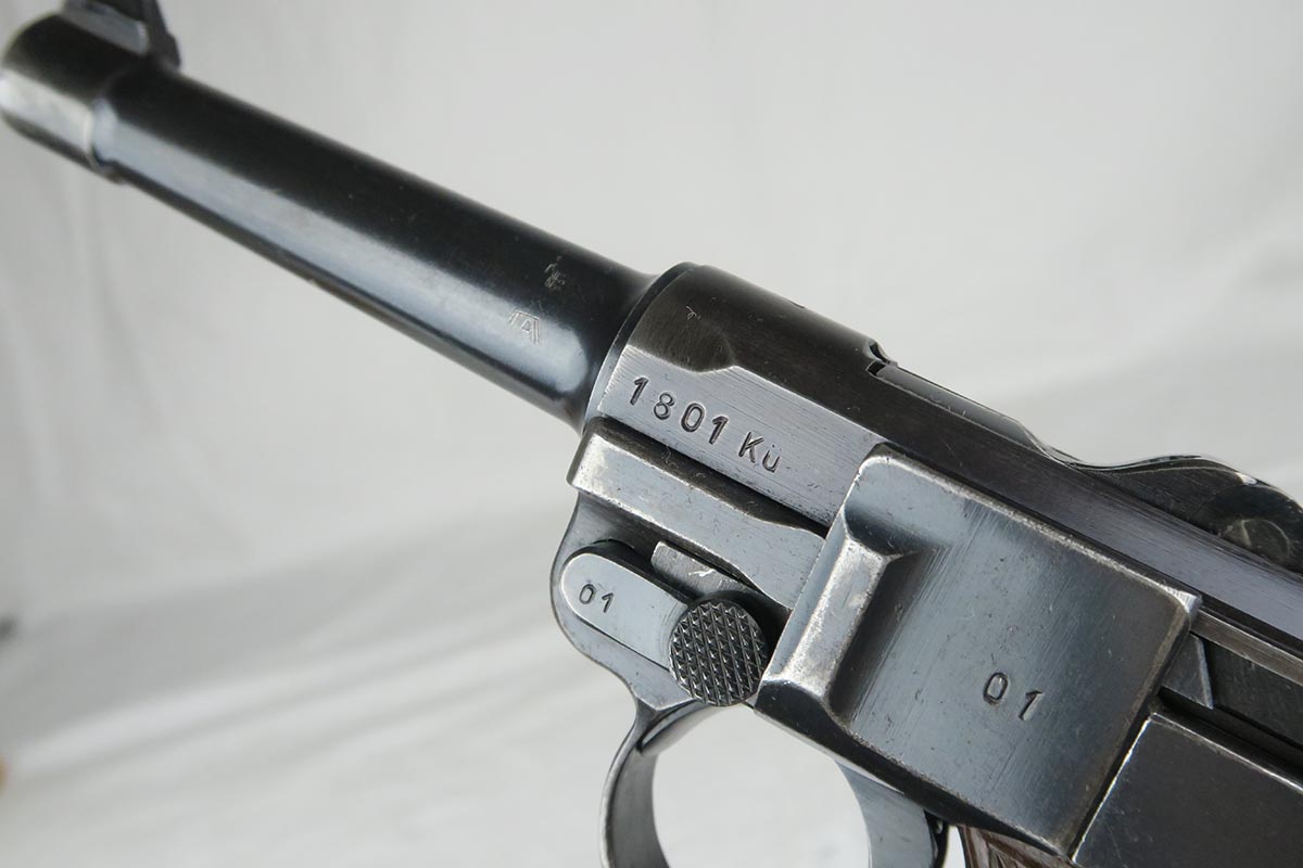 12/11/17 – Listed here is a nice example of the very well known and highly sought after Luftwaffe Inspected Ku marked Luger.  This is one of the approx 5,000 that were produced with the Ku suffix.  The pistol is completely matching to include the rare numbered aluminum bottom fxo coded magazine.  The frame and toggle are byf 41 marked and the barrel is 655 coded.  The finish on the gun rates at 85-90%, with notable thinning/browning on the straps.  If not for the thinning on the straps though this would be a nice, 97% gun.  The bore is excellent.  Three Luftwaffe inspection stamps and the use of replacement parts and a blue finish that was not as well done as Mauser production are all the classic signs of the Ku luger.  There has been more speculation about the origin and circumstances surrounding these Lugers than any other WW2 Variant Luger.  The prevailing theory is that they were assembled in very early 1943 for the Luftwaffe out of leftover Mauser parts by an unknown contractor that the code Ku stands for.  This has been assumed to be the firm of  Adolph Kurschner – Metalwaffenfabrik in Bavaria, but this may never be definitively verified.  Comes with an excellent 1941 dated holster and a spare (correct) Ku magazine.
