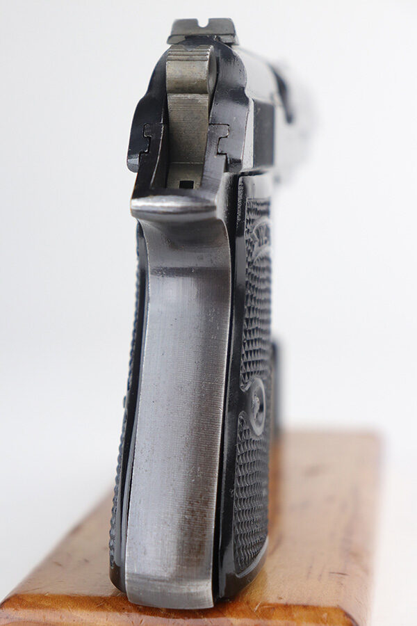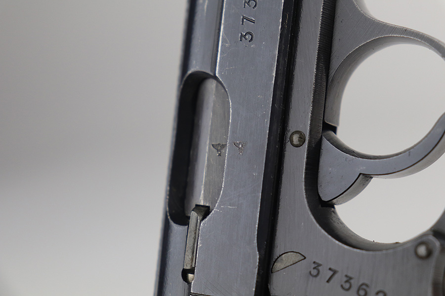11/19/21 – This is an excellent example of a scarce, late-war Walther PP issued to the Nazi police force in 1945. The gun is all, matching, has an “ac” Walther factory code on the right side of the slide, no slide legend, and has a Nazi police “Eagle F” marking on the left side of the frame. Only about 5,000 guns were made in this configuration. This gun has retained about 96% of its original late-war bluing. Generally, there is very minor wear on the high edges of the slide and around the muzzle. Some very light handling marks/scratches along the slide. There is very minor thinning and just a hint of brown patina on both grip straps. Comes with excellent period-correct black bakelite grips and a rare, late-war, “w”-marked, phosphate magazine. The bore is near-mint – shiny with very strong rifling.