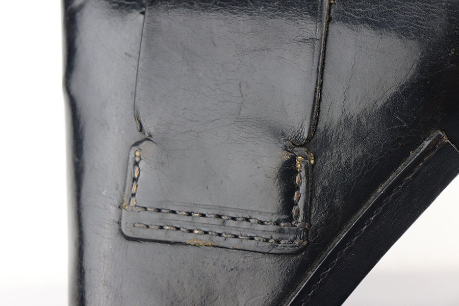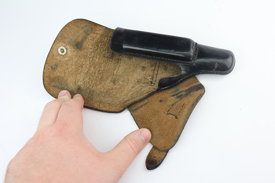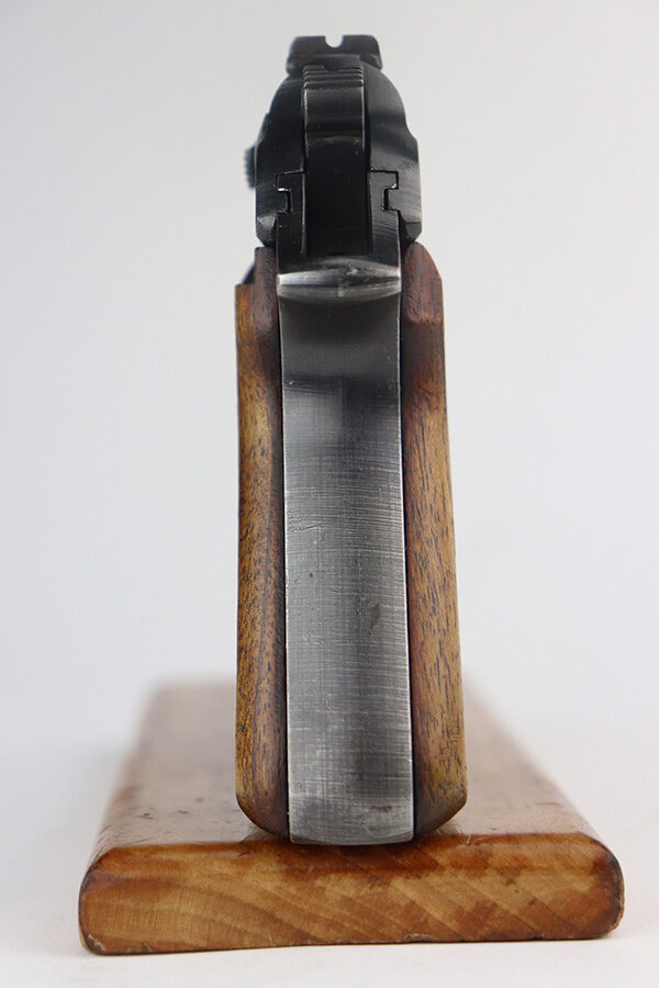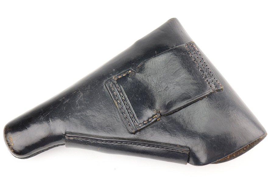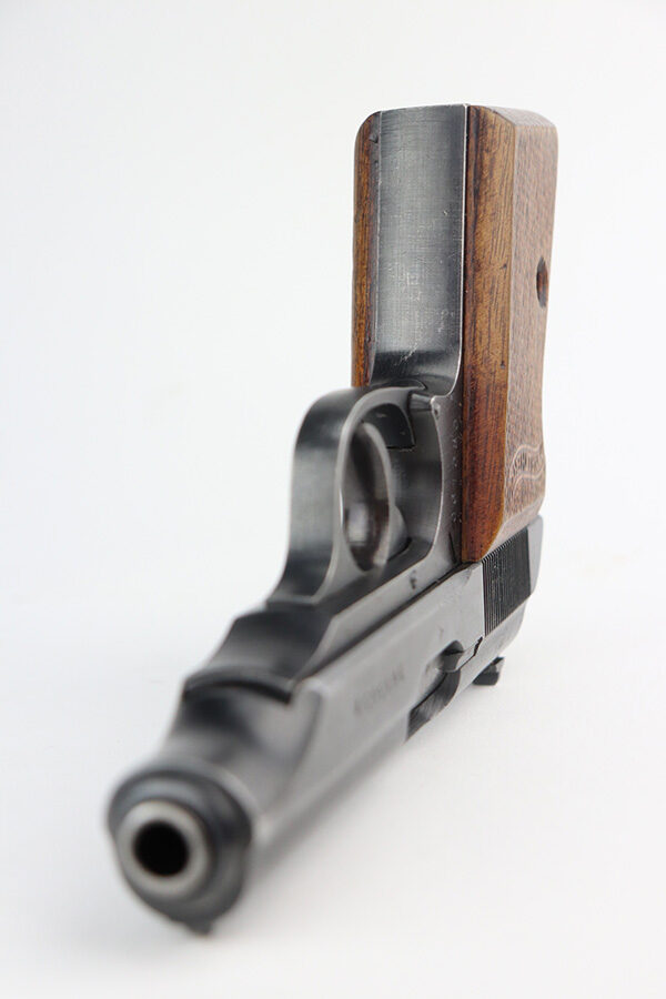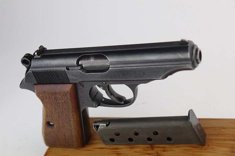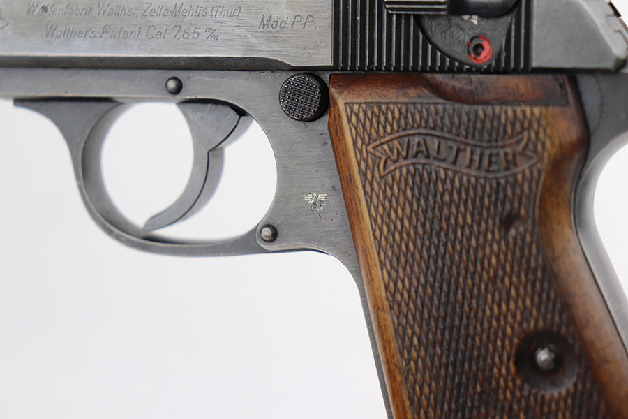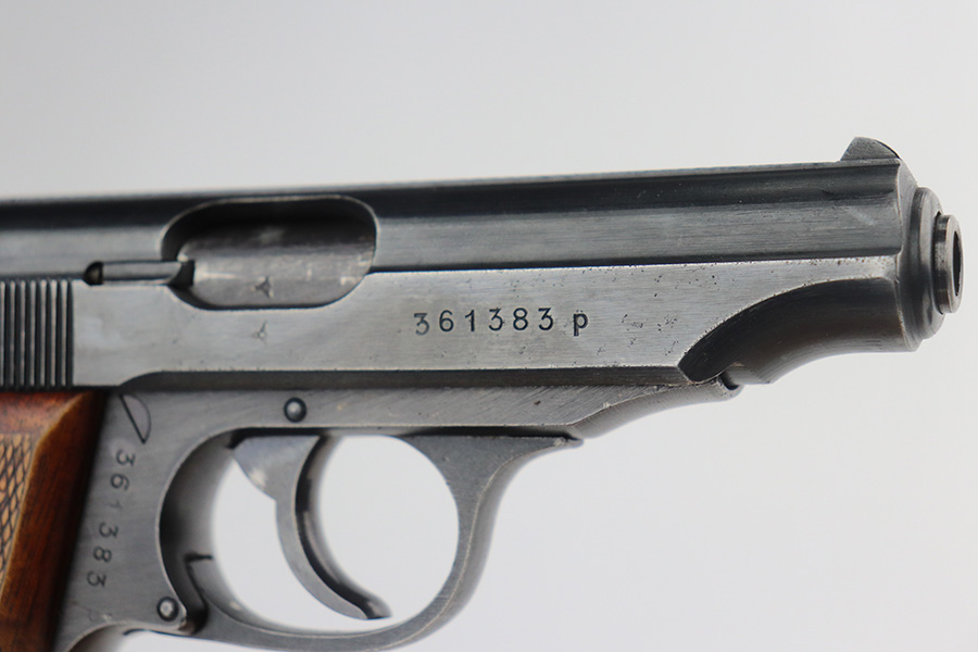 6/22/21 – This is an excellent example of a scarce late-war Walther PP rig issued to the Nazi police in 1944. It is all matching and has the proper police “Eagle F” proof. This police “Eagle F” variation is scarce as only about 5,000 were made. The rig comes with an earlier Akah PP holster with a brass closure knob and two proper magazines. One of the magazines is a rare late-war “w” marked magazine. The gun has retained about 94-95% of its original finish. There is thinning on the back strap, scratchy wear on the front strap, and minor wear around the muzzle. A couple of very minor handling marks on the top of the slide and one tiny casting flaw on the left side of the slide. Comes with excellent late-war wood grips. Minty bore.