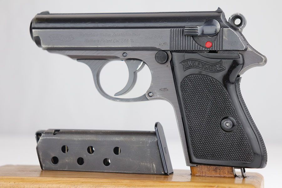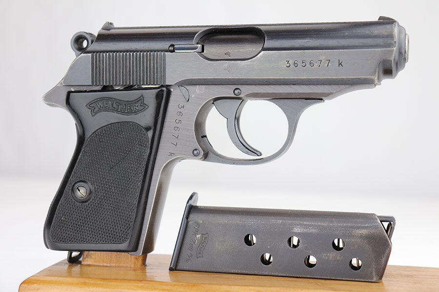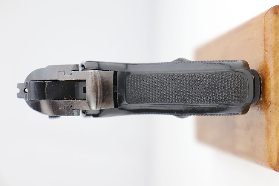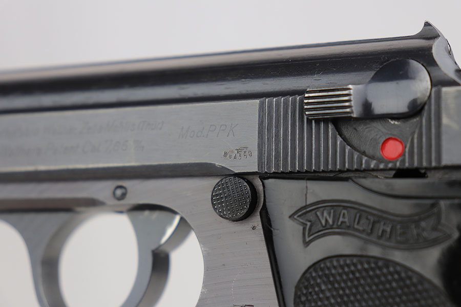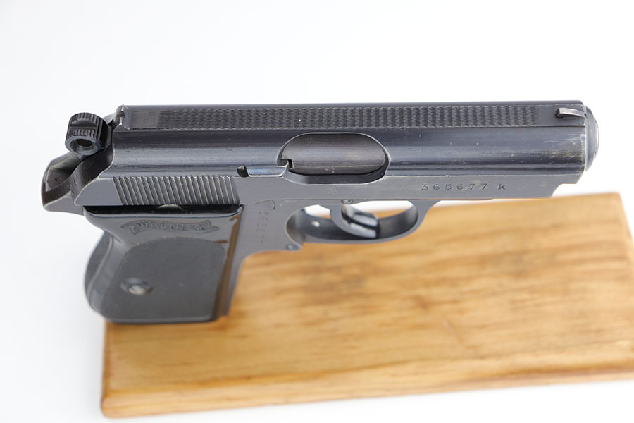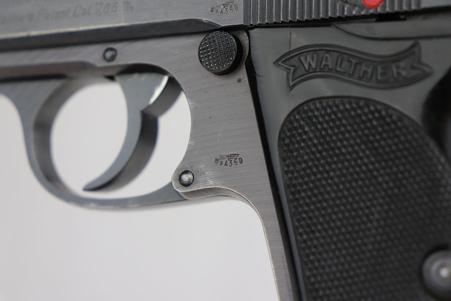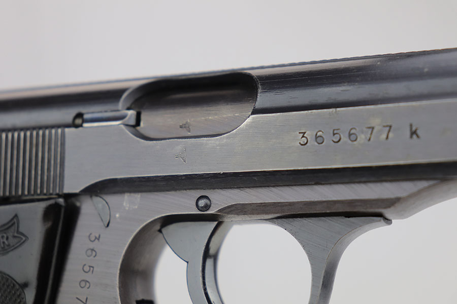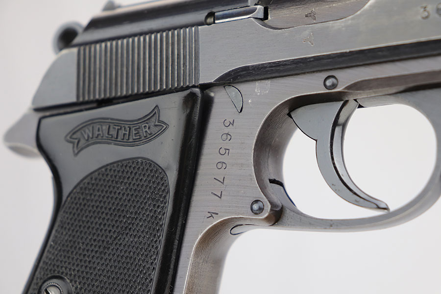 6/27/23 – This is a scarce and desirable variation late war nazi army proofed Walther PPk. The left side of the slide and frame are waffen proofed. There were only 12,500 of this late-war variation produced, all of which should have gray or black grips. This particular pistol is very late, and has an appealing slight tint of plumb in the frame. The gun rates around 93-95% and is difficult to grade due to the late war finish. The front strap is thinned throughout and there is some light muzzle / slide edge wear. The right side of the slide has a few small areas around the serial number stamp where there’s light pitting. The bore is excellent with minimal wear. Fully functional and comes with a nice grip that has a small surface crack on the left side.