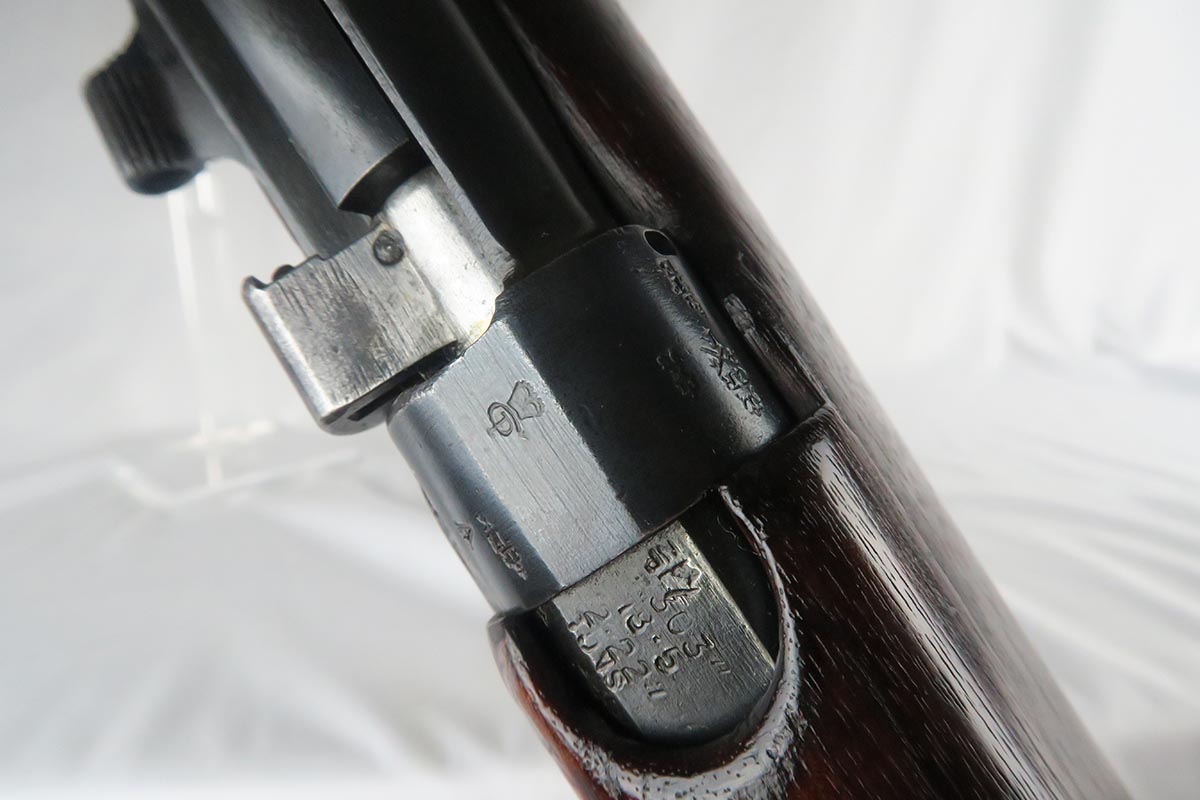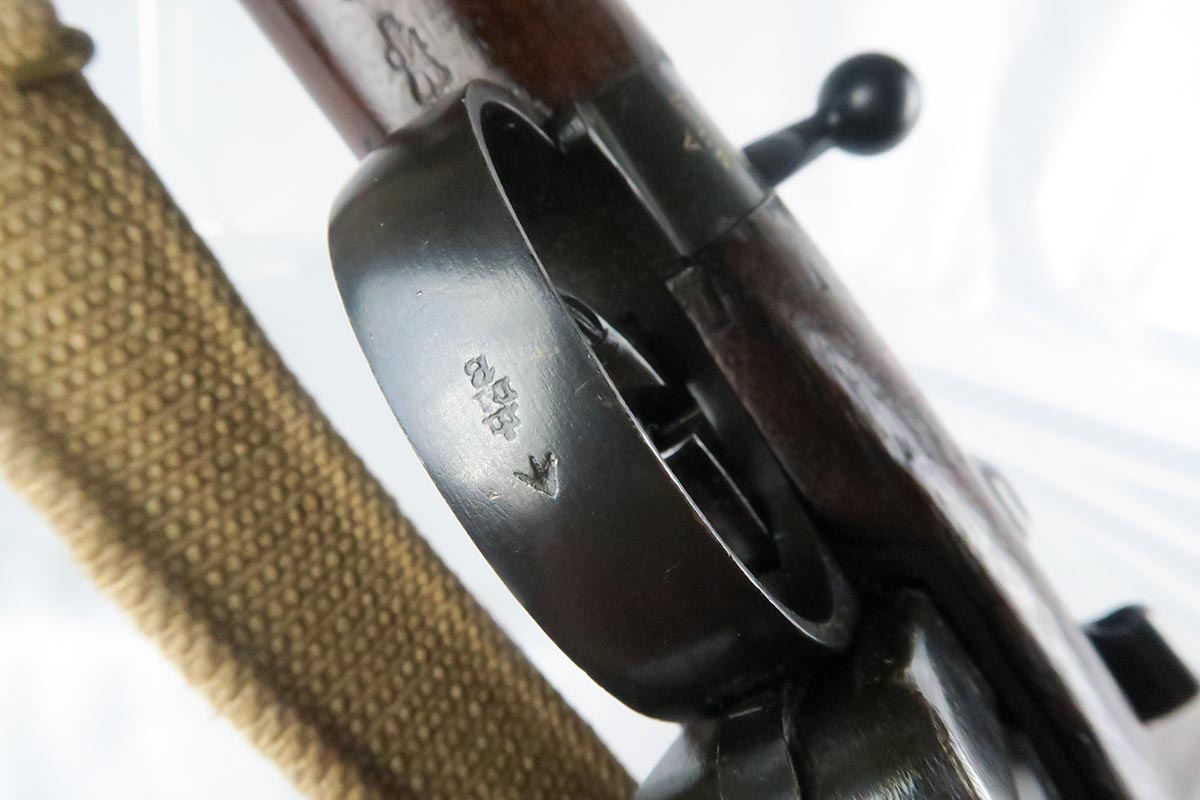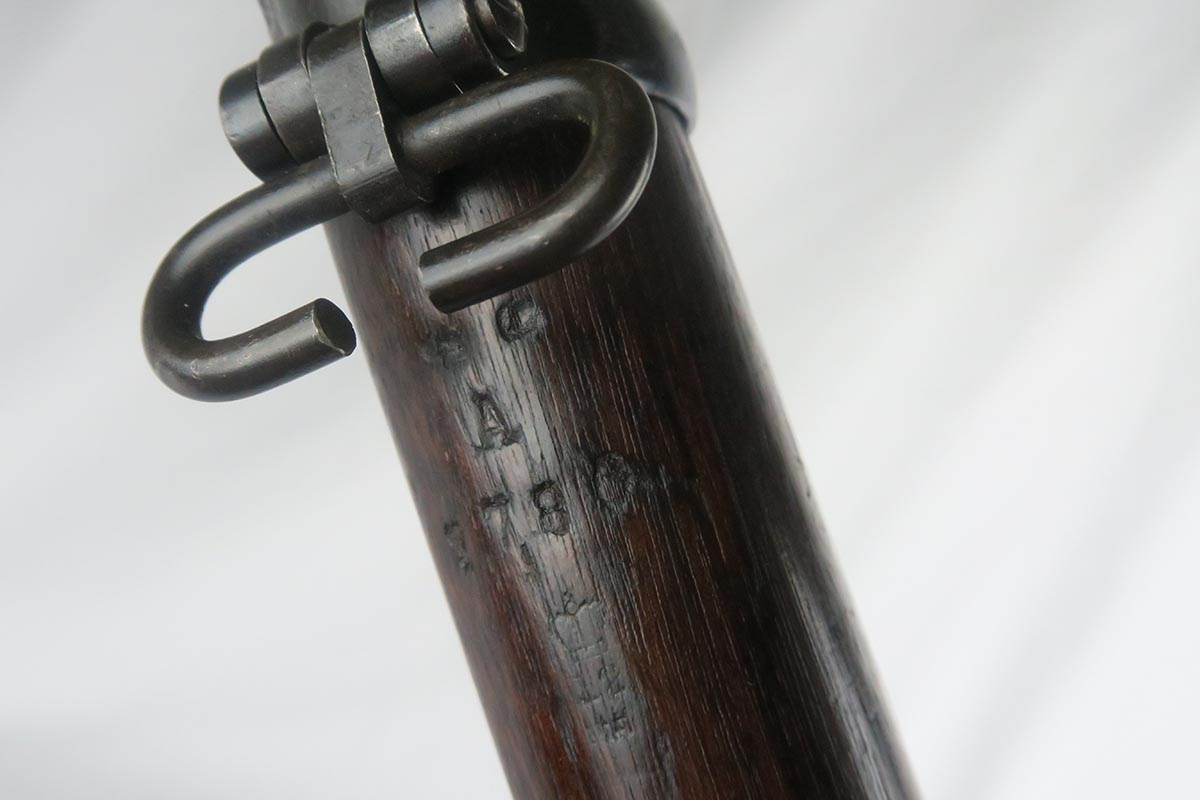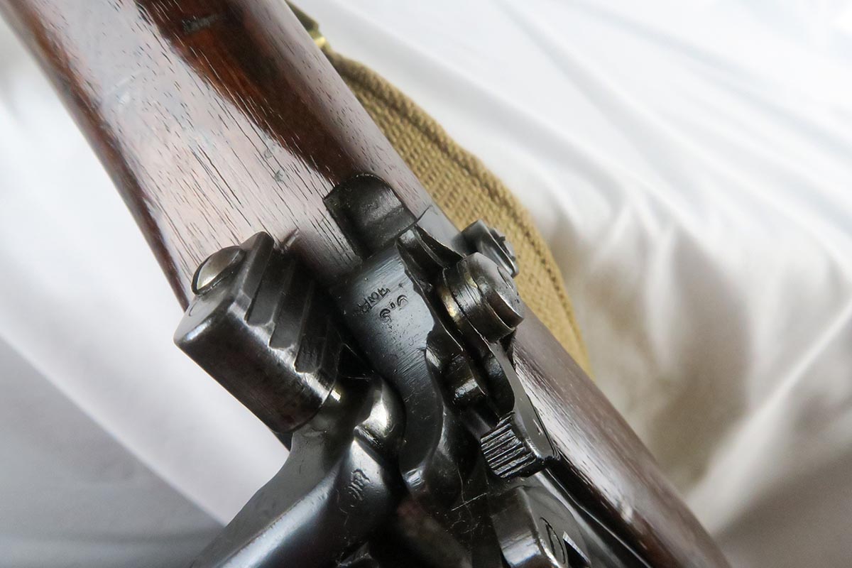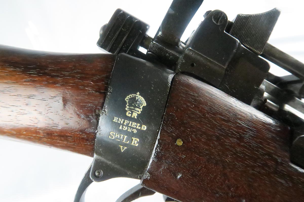 11/2/17 – This is an all original and matching Lee-Enfield No 1 Mk V from 1924.  This rifle is in very good to excellent condition with minor dings in the wood but no chips or cracks, and excellent bluing on the receiver.  All numbered parts appear to be matching.  The No. 1 Mk V has one primary distinguishing feature – the rear aperture sight.  Like the No. 1 Mk III* it lacked a volley sight and had the wire loop in place of the sling swivel at the front of magazine well along with the simplified cocking piece. The Mk V did retain a magazine cut-off, but without a spotting hole, the piling swivel was kept attached to a forward barrel band, which was wrapped over and attached to the rear of the nose cap to reinforce the rifle for use with the standard Pattern 1907 bayonet. Other distinctive features include a nose cap screw was slotted for the width of a coin for easy removal, a safety lever on the left side of the receiver was slightly modified with a unique angular groove pattern, and the two-piece hand guard being extended from the nose cap to the receiver, omitting the barrel mounted leaf sight. No. 1 Mk V rifles were manufactured solely by R.S.A.F. Enfield from 1922–1924, with a total production of roughly 20,000 rifles, all of which marked with a “V”.  This one includes a swing that appears period correct but I don’t know much about these slings.  The rifle has a mint bore – looks like it’s barely been used.