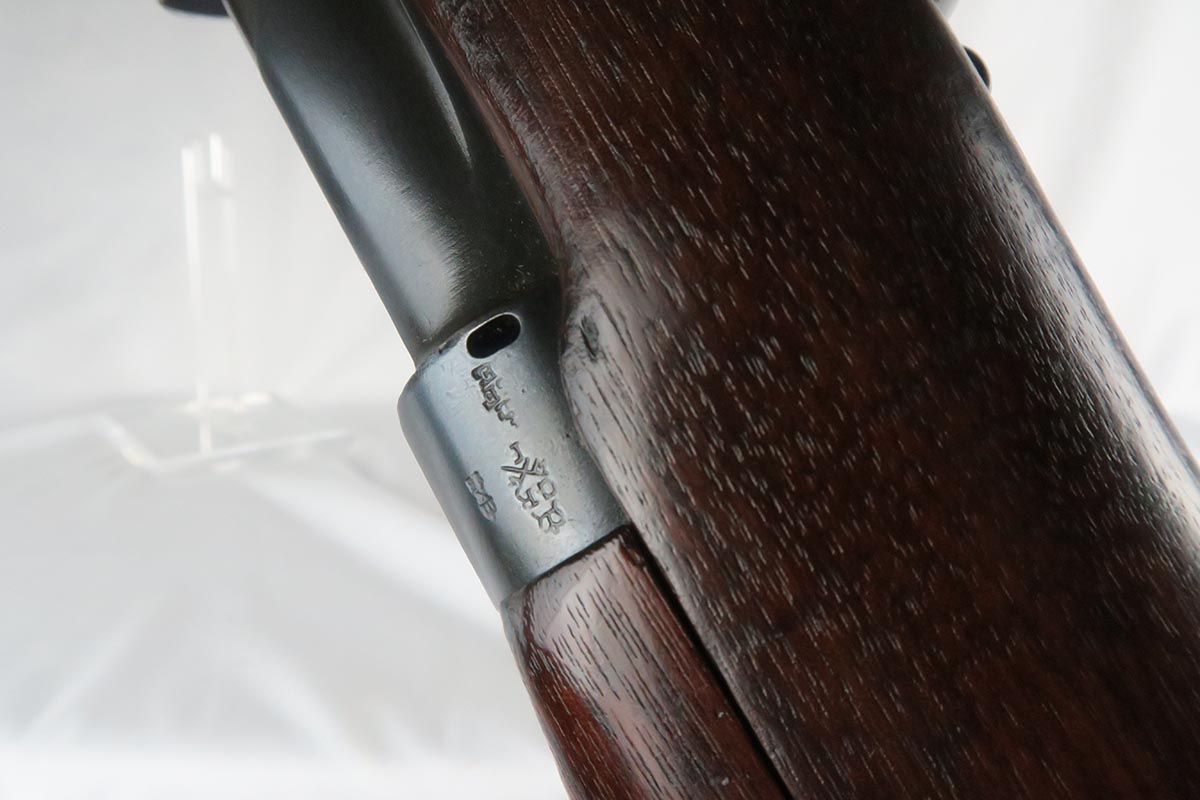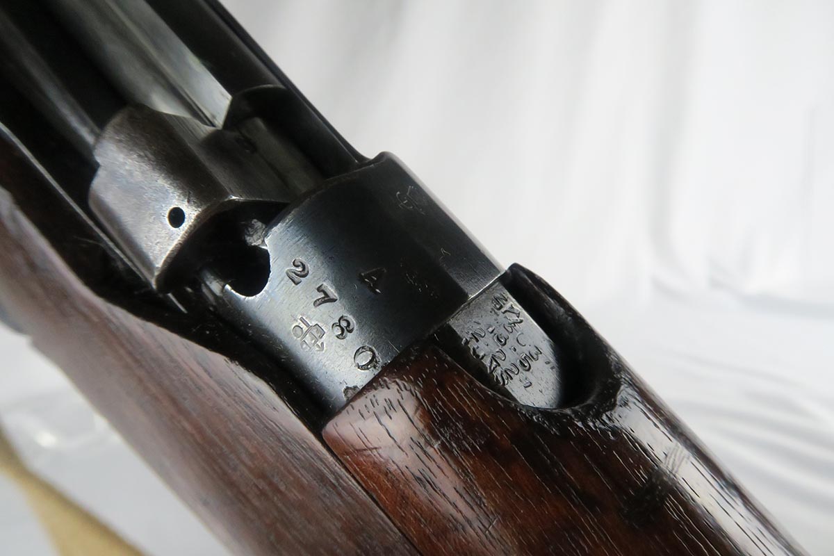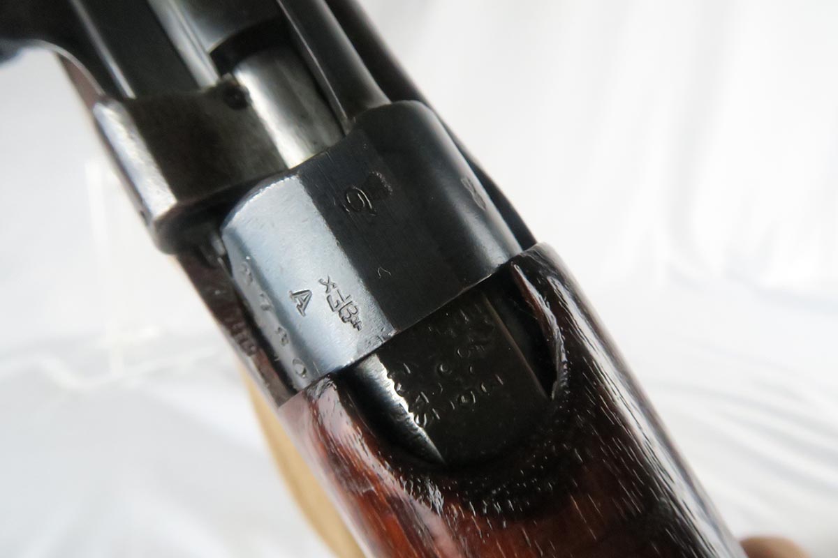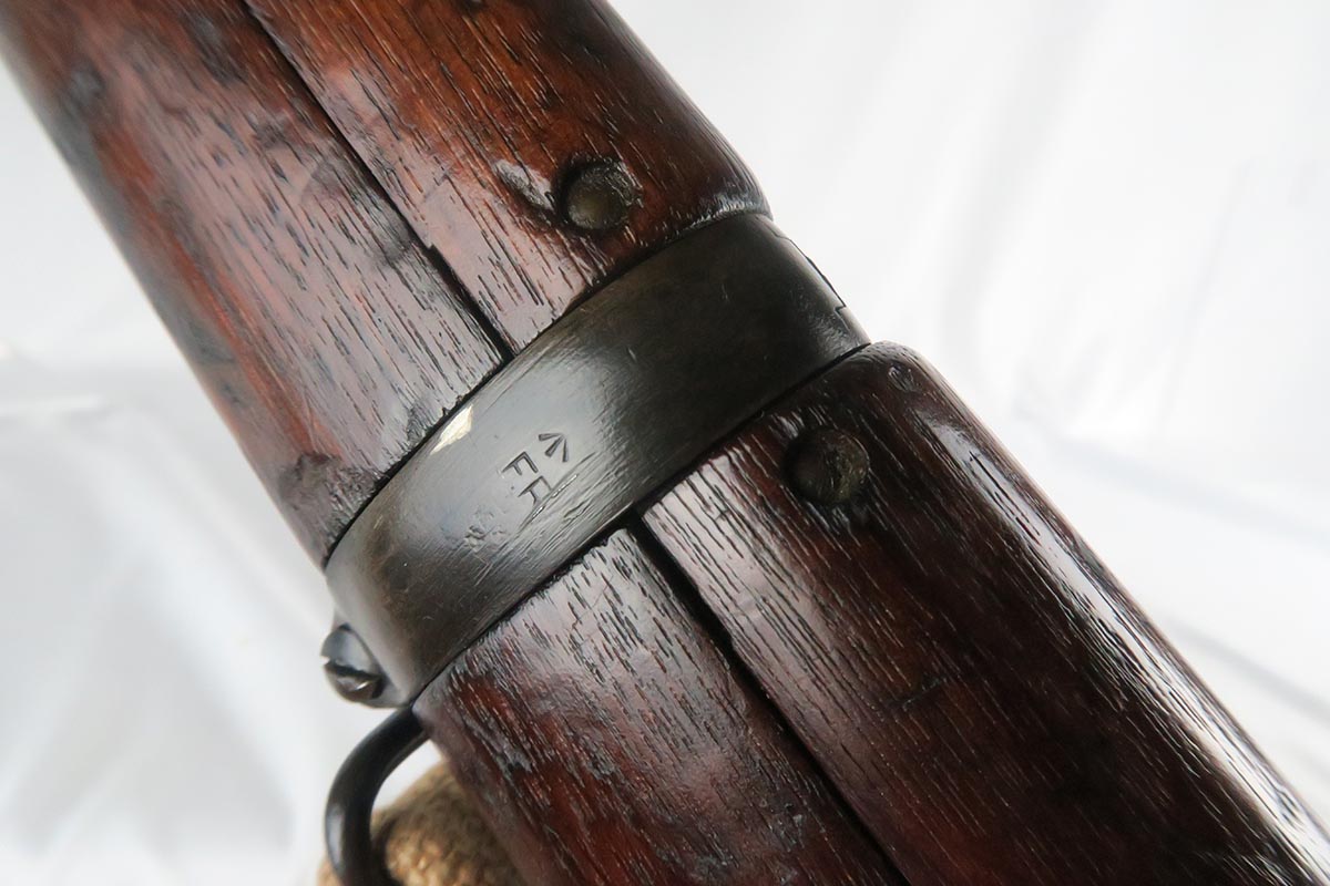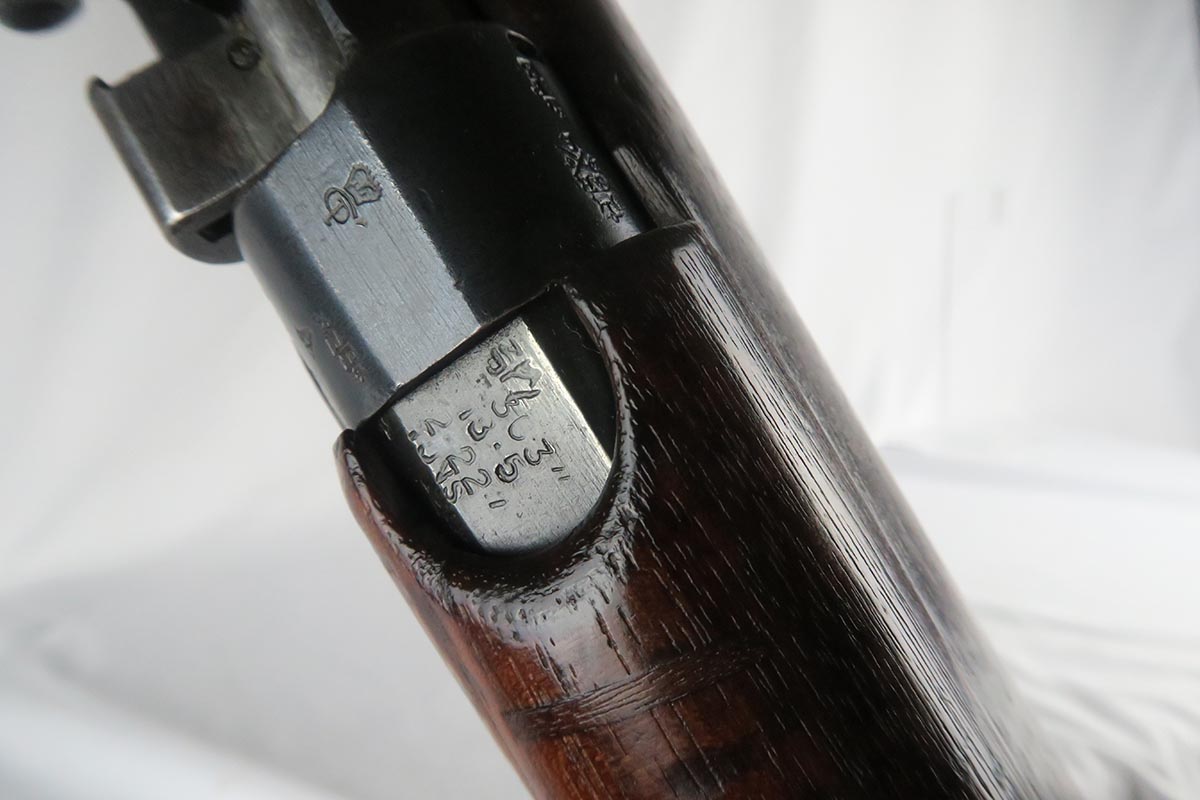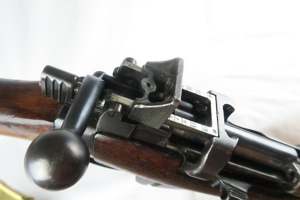 11/2/17 – This is an all original and matching Lee-Enfield No 1 Mk V from 1924.  This rifle is in very good to excellent condition with minor dings in the wood but no chips or cracks, and excellent bluing on the receiver.  All numbered parts appear to be matching.  The No. 1 Mk V has one primary distinguishing feature – the rear aperture sight.  Like the No. 1 Mk III* it lacked a volley sight and had the wire loop in place of the sling swivel at the front of magazine well along with the simplified cocking piece. The Mk V did retain a magazine cut-off, but without a spotting hole, the piling swivel was kept attached to a forward barrel band, which was wrapped over and attached to the rear of the nose cap to reinforce the rifle for use with the standard Pattern 1907 bayonet. Other distinctive features include a nose cap screw was slotted for the width of a coin for easy removal, a safety lever on the left side of the receiver was slightly modified with a unique angular groove pattern, and the two-piece hand guard being extended from the nose cap to the receiver, omitting the barrel mounted leaf sight. No. 1 Mk V rifles were manufactured solely by R.S.A.F. Enfield from 1922–1924, with a total production of roughly 20,000 rifles, all of which marked with a “V”.  This one includes a swing that appears period correct but I don’t know much about these slings.  The rifle has a mint bore – looks like it’s barely been used.