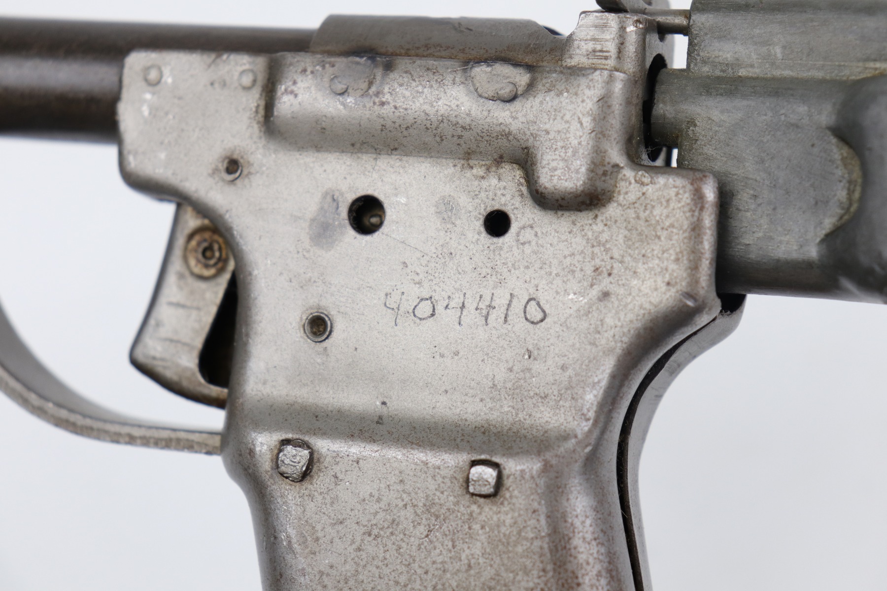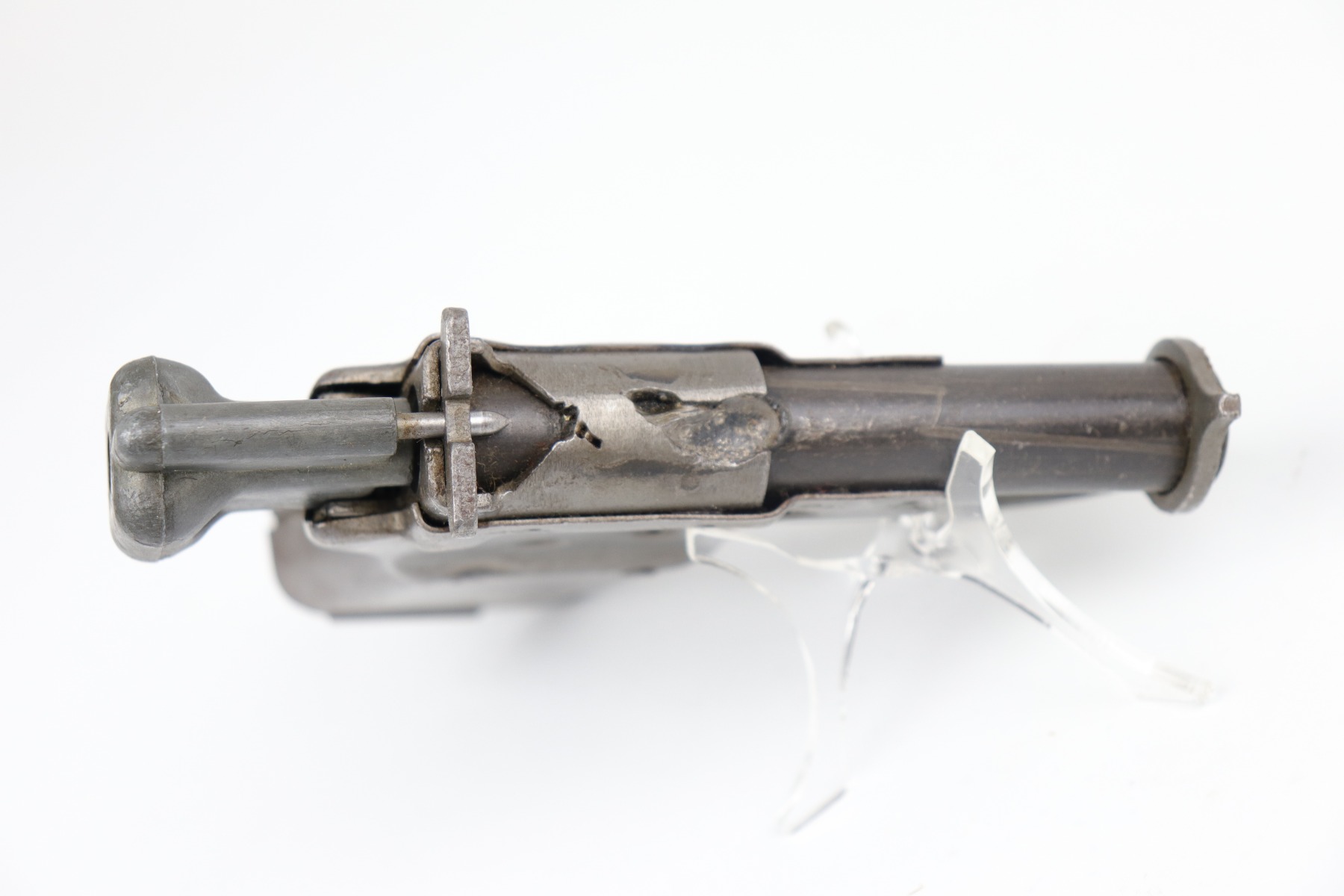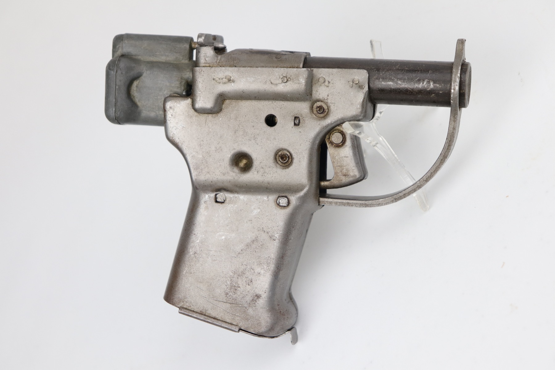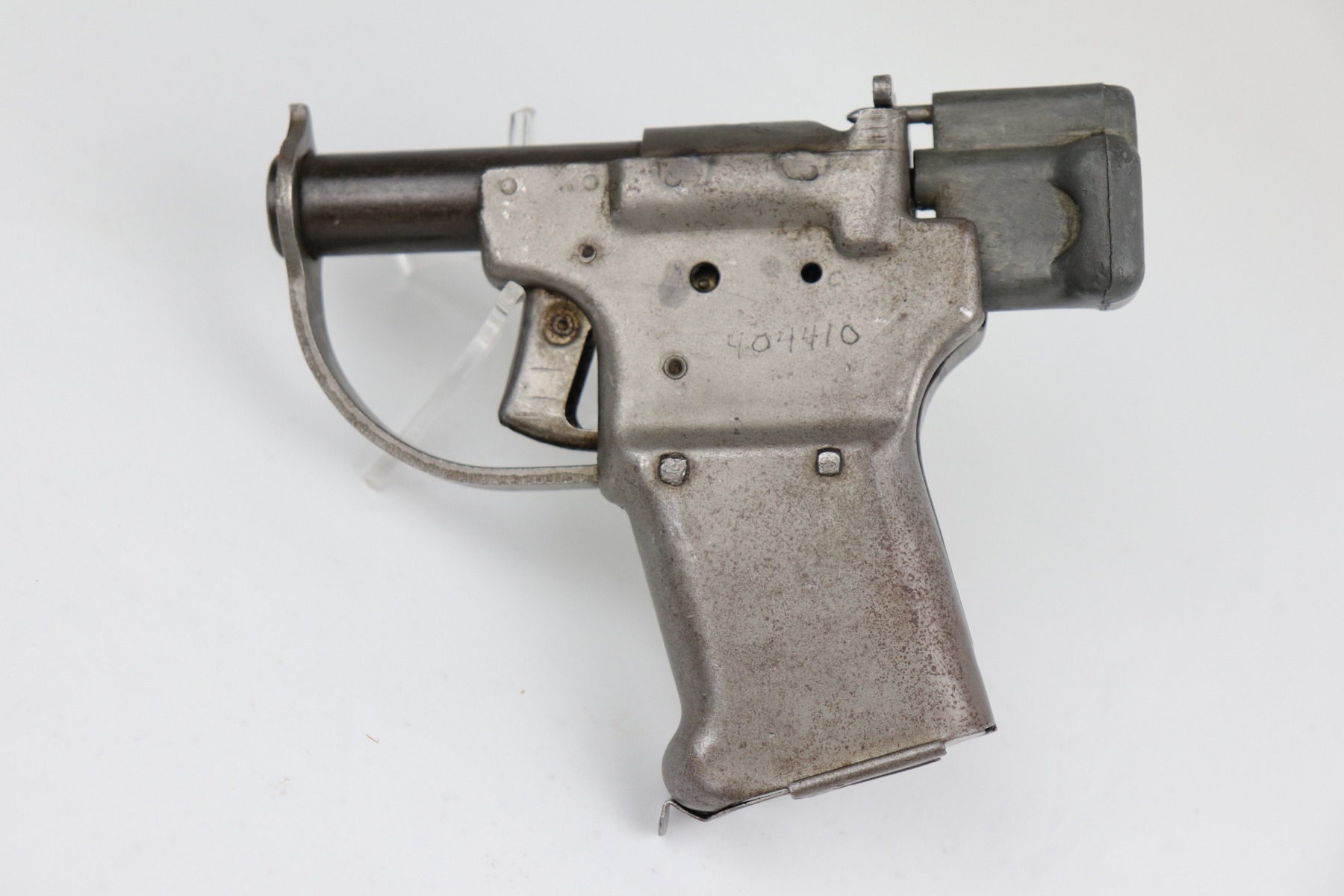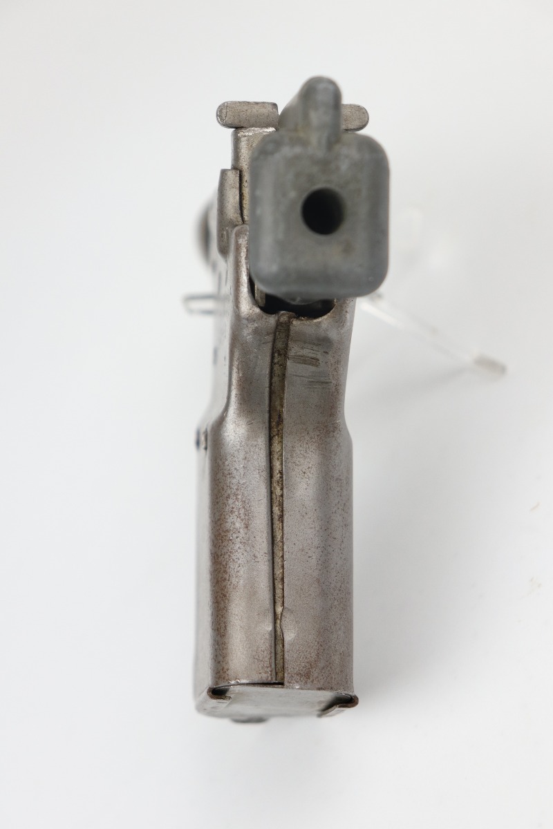 7/2/20 – The FP-45 Liberator was a pistol manufactured by the United States military during World War II for use by resistance forces in occupied territories. It was originally intended as an insurgency weapon to be mass dropped behind enemy lines to resistance fighters in occupied territory. A resistance fighter was to recover the weapon, sneak up on an Axis occupier, kill or incapacitate him, and retrieve his weapons. The pistol had its origins in the US Army Joint Psychological Committee and was designed for the United States Army in 1942 by the Inland Guide Lamp Manufacturing Division of the General Motors Corporation in Dayton, Ohio. The army designated the weapon the Flare Projector Caliber .45 hence the designation FP-45. This was done to disguise the fact that a pistol was being mass produced. The Liberator was shipped in a cardboard box with 10 rounds of .45 ACP ammunition, a wooden dowel to remove the empty cartridge case, and an instruction sheet in comic strip form showing how to load and fire the weapon, though this listing is for just the pistol. This particular example is in fair condition with obvious areas of surface corrosion. Small freckling throughout. There is a number scratched on the left side of the gun. Mechanically correct. Bore is frosted and freckling throughout but as it’s a smoothbore, likely not an issue.