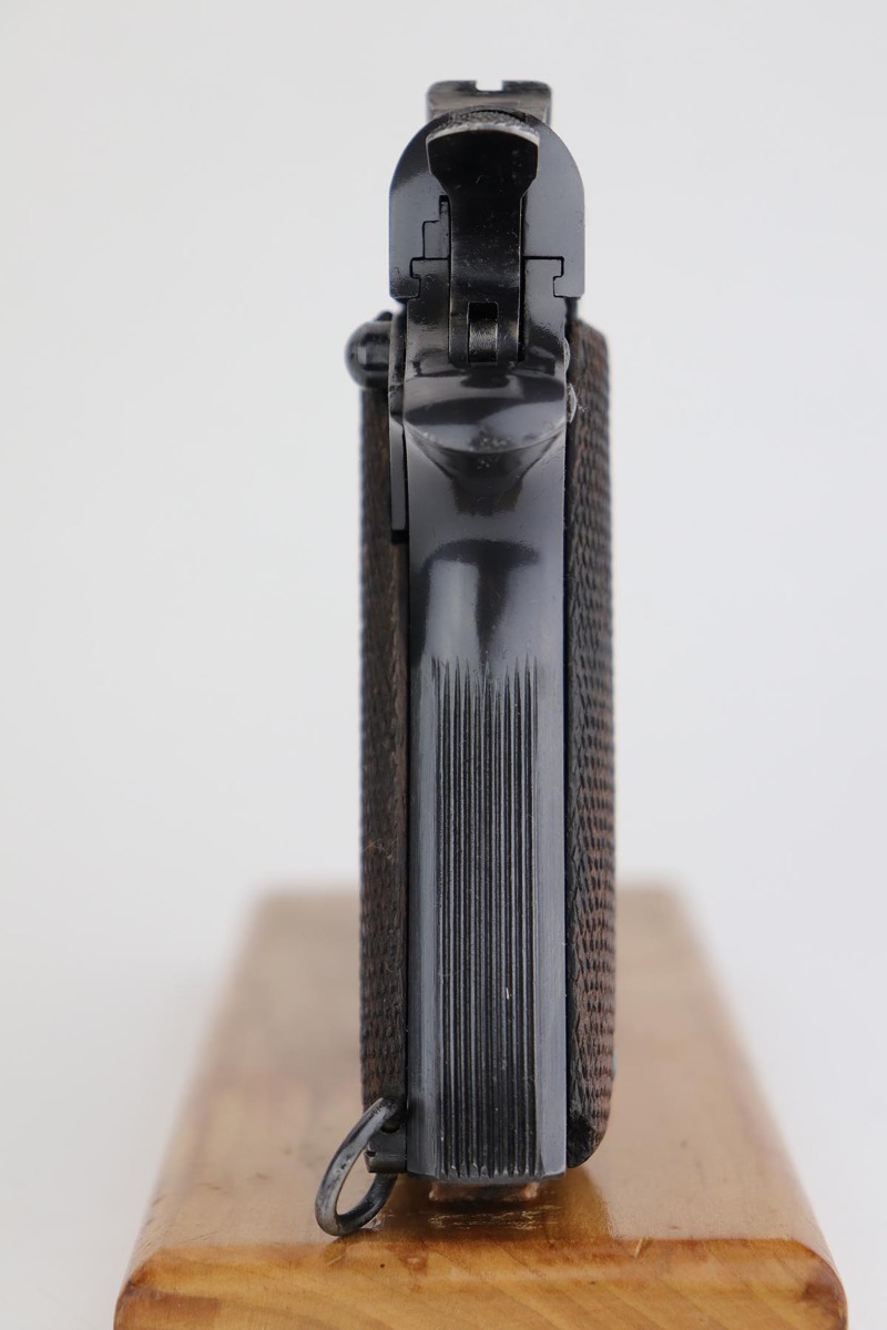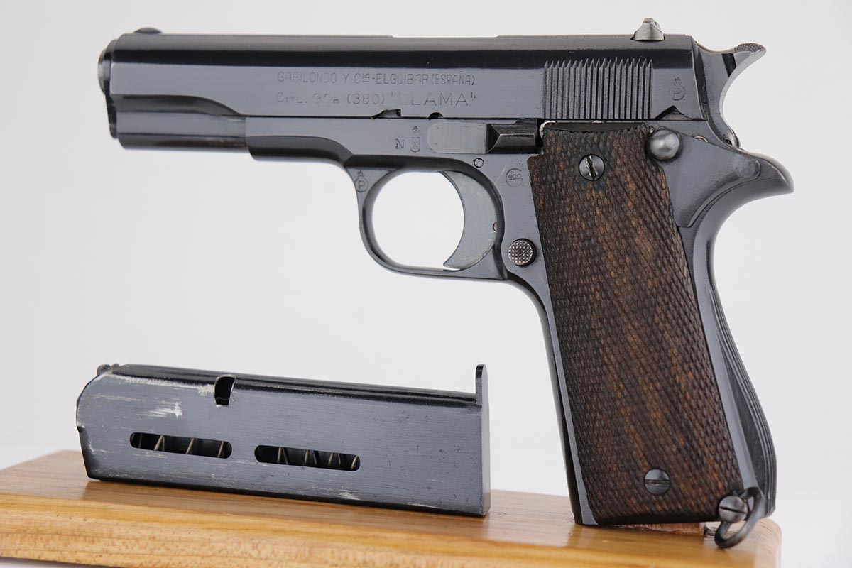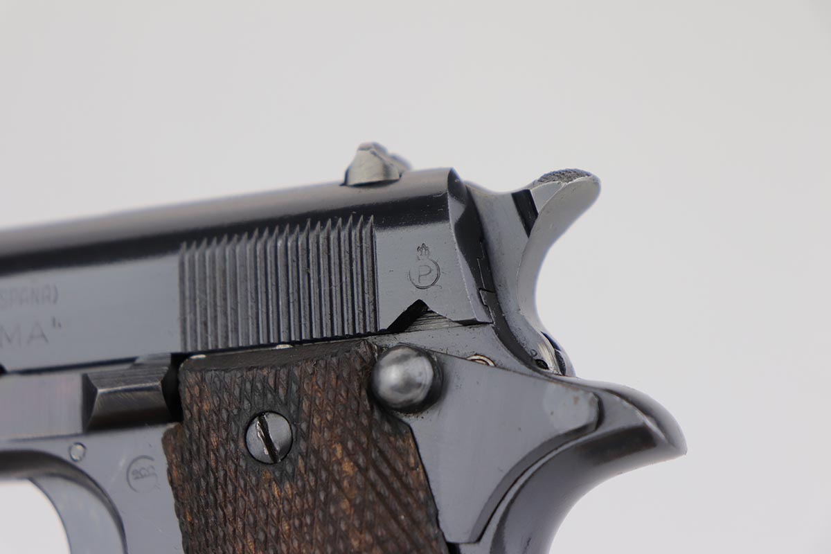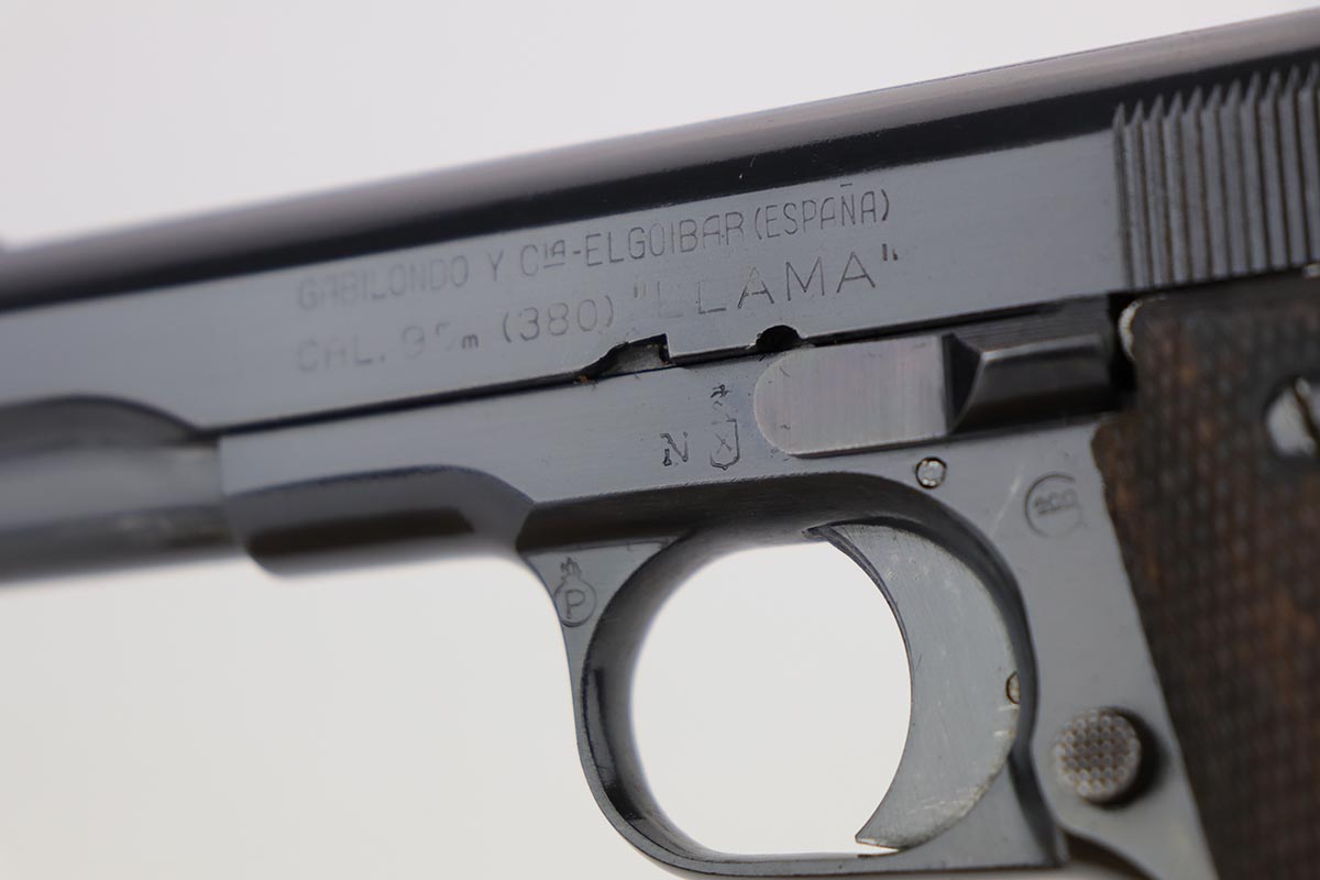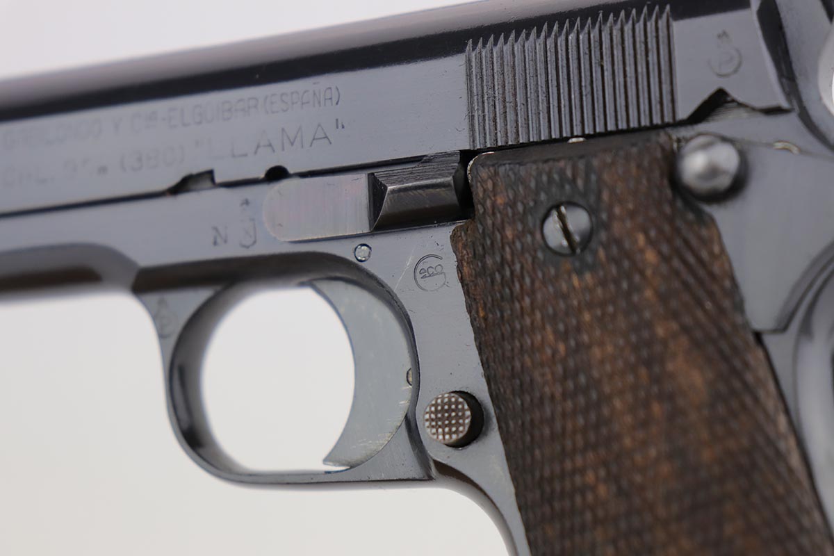 8/8/18 – This is a scarce Spanish Llama Model II pistol made in the early 1940s and later exported into Germany by Geco in 1942. The pistol is marked ‘GC’ for ‘Guardia Civil’, denoting it was original issued to Spain’s Civil Guard. It would’ve then been made available for import by the German retailer to be sold commercially to party and military officers in Germany, as evidenced by the Geco proof on the left side. It also features an ‘N’ marking on the left side frame, denoting it was imported in 1942. The pistol has a very early serial for the known range (one of the first thousand Geco examples). The pistol is in excellent condition overall with 99% bluing remaining, but we are not certain the finish is original. Some of the proofs appear faint at the edges, but if the finish was restored then it was done beautifully as the work is excellent. The bore is clean with good rifling. Excellent original brown wood grips and one original magazine included.