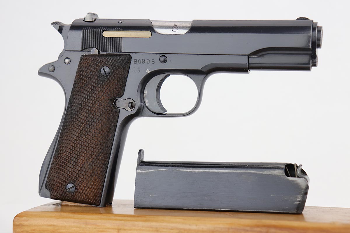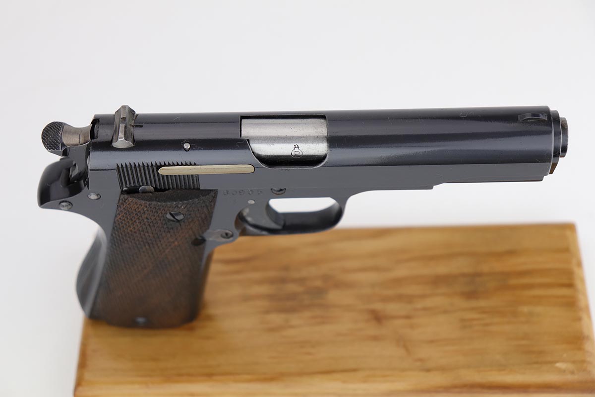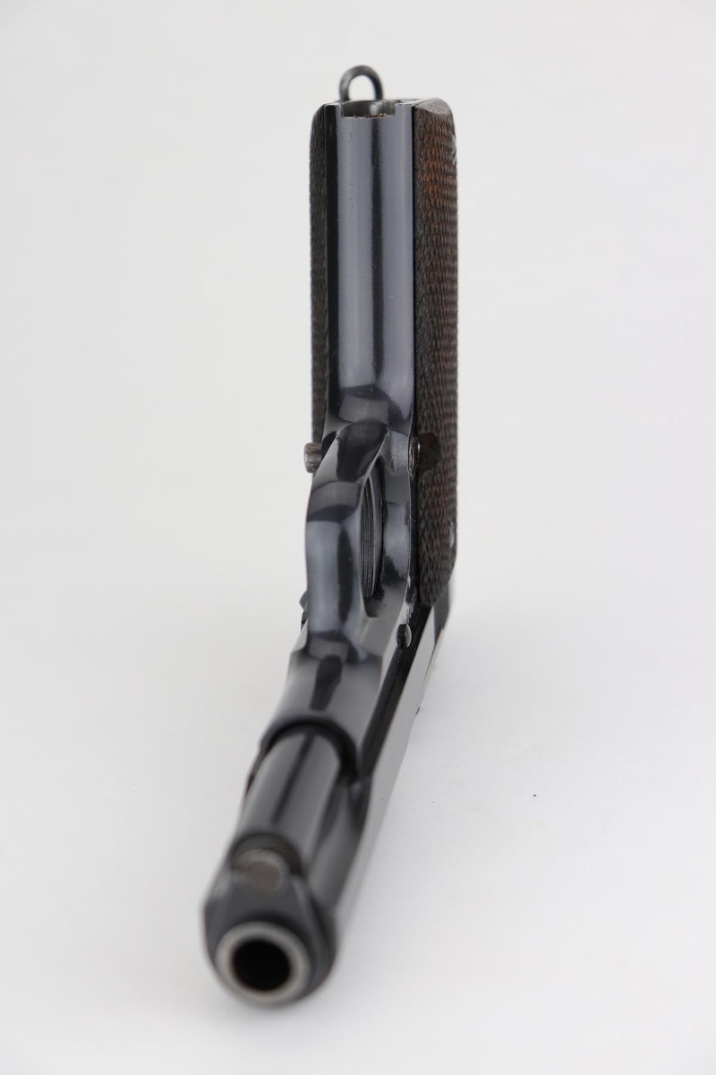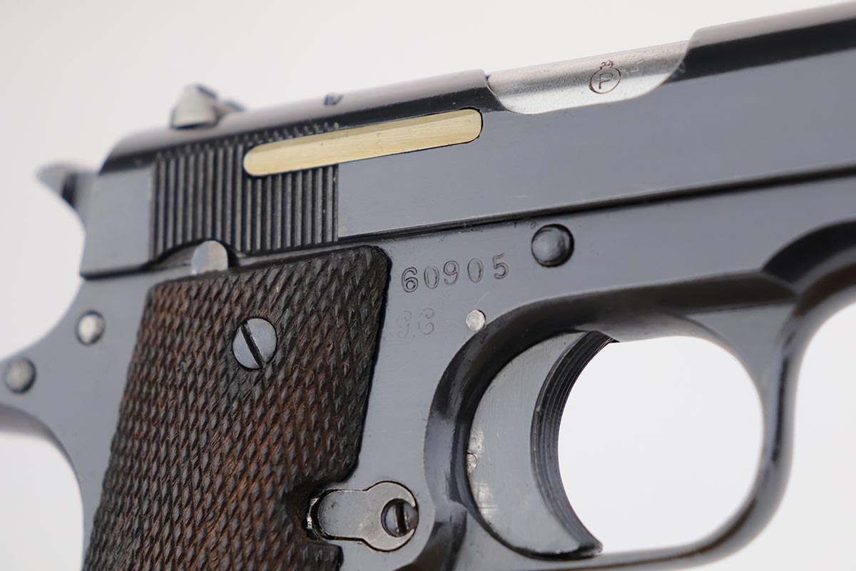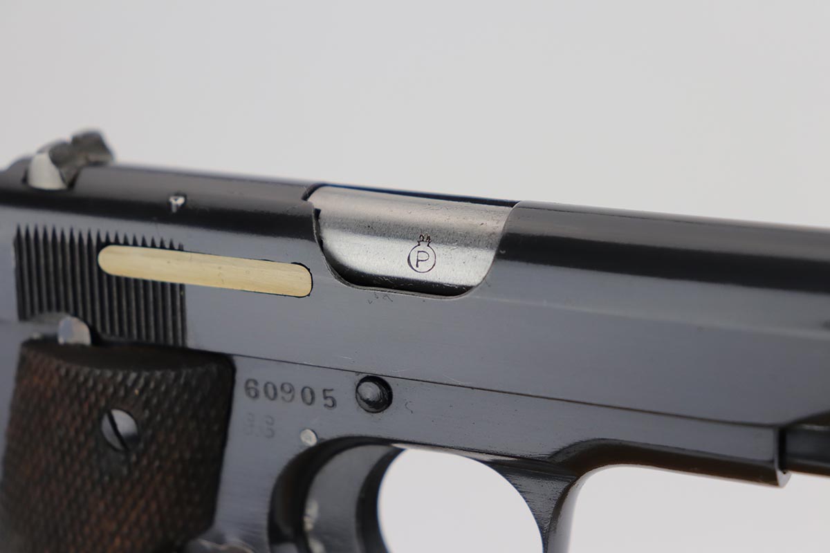 8/8/18 – This is a scarce Spanish Llama Model II pistol made in the early 1940s and later exported into Germany by Geco in 1942. The pistol is marked ‘GC’ for ‘Guardia Civil’, denoting it was original issued to Spain’s Civil Guard. It would’ve then been made available for import by the German retailer to be sold commercially to party and military officers in Germany, as evidenced by the Geco proof on the left side. It also features an ‘N’ marking on the left side frame, denoting it was imported in 1942. The pistol has a very early serial for the known range (one of the first thousand Geco examples). The pistol is in excellent condition overall with 99% bluing remaining, but we are not certain the finish is original. Some of the proofs appear faint at the edges, but if the finish was restored then it was done beautifully as the work is excellent. The bore is clean with good rifling. Excellent original brown wood grips and one original magazine included.