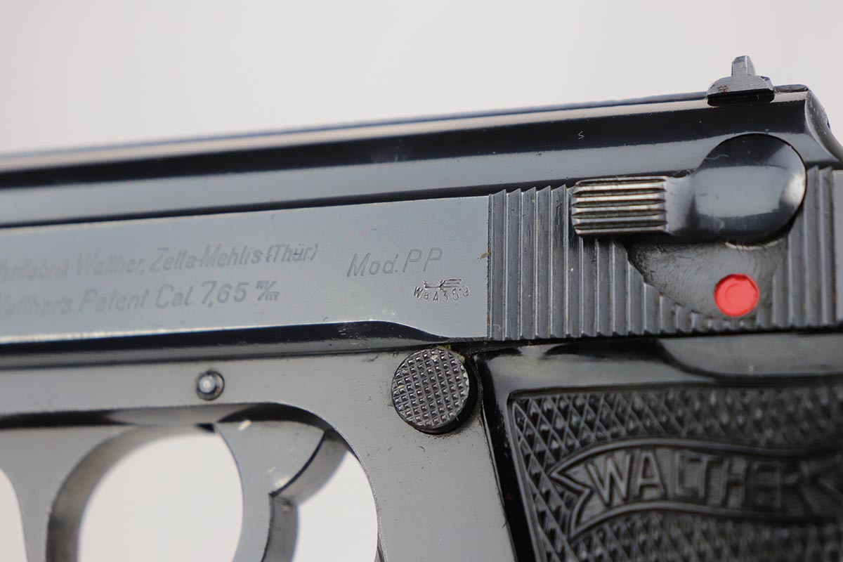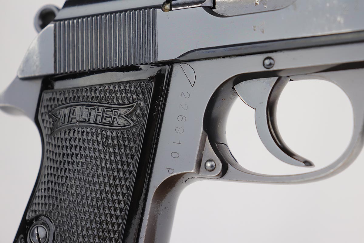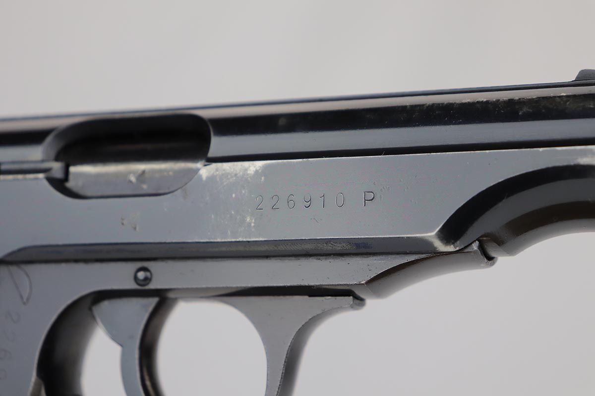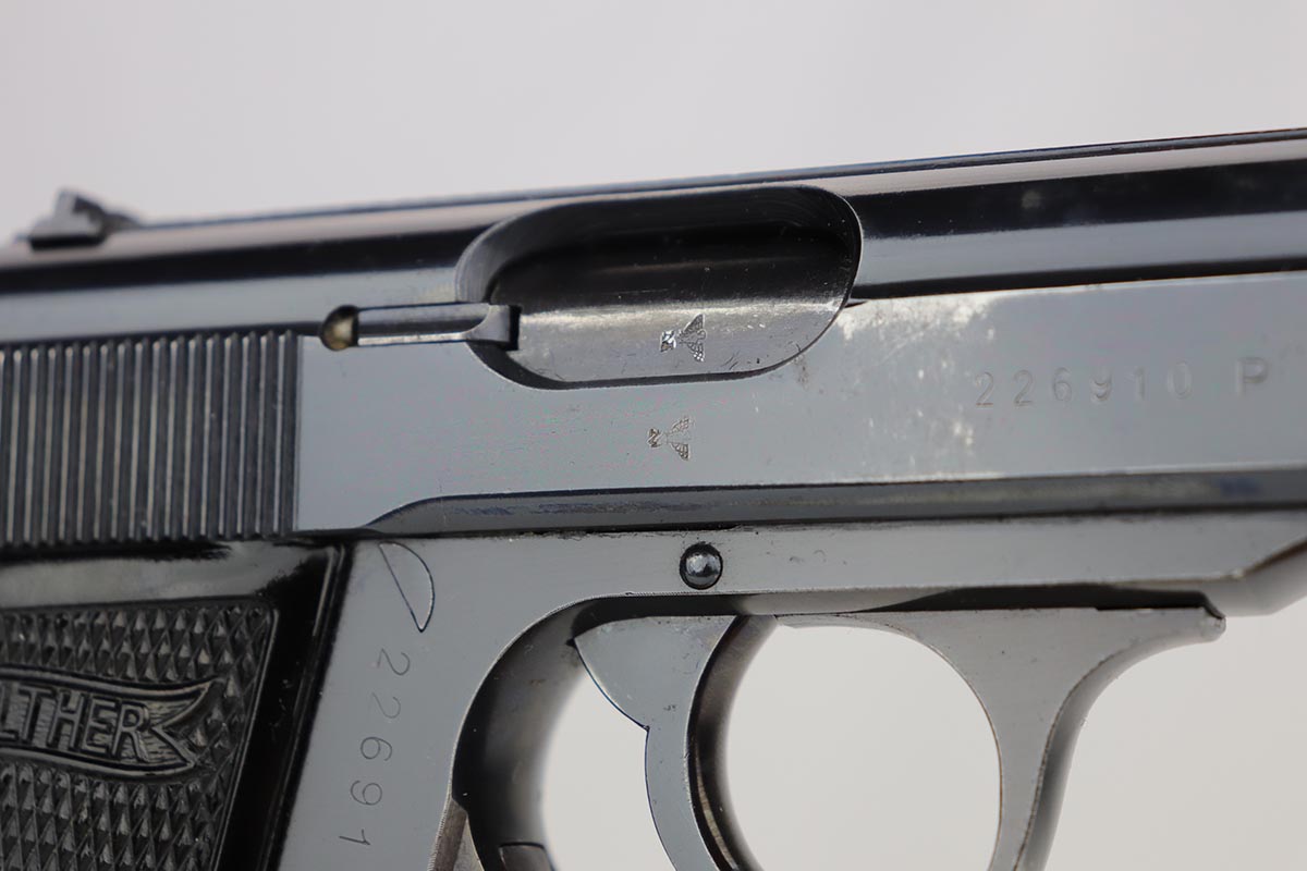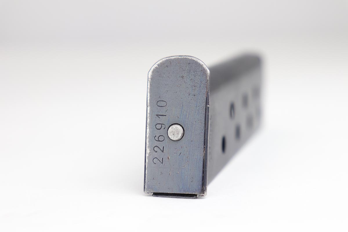 9/24/19 – This is a Luftwaffe contract Walther PP from 1940-41, with the original matching magazine. These are distinct in that they are in that they are waffen proofed on the slide and frame, feature high-polish blue and their magazines are numbered on the base plate. They were issued with two numbered magazines, but this one comes with one matching magazine. The original finish covers about 90% of the gun with a few separate areas of minor finish loss on all major areas. The gun has matching frame and slide with eagle/N proofs on the slide, barrel and ejection port. Minty bore. Excellent grips.