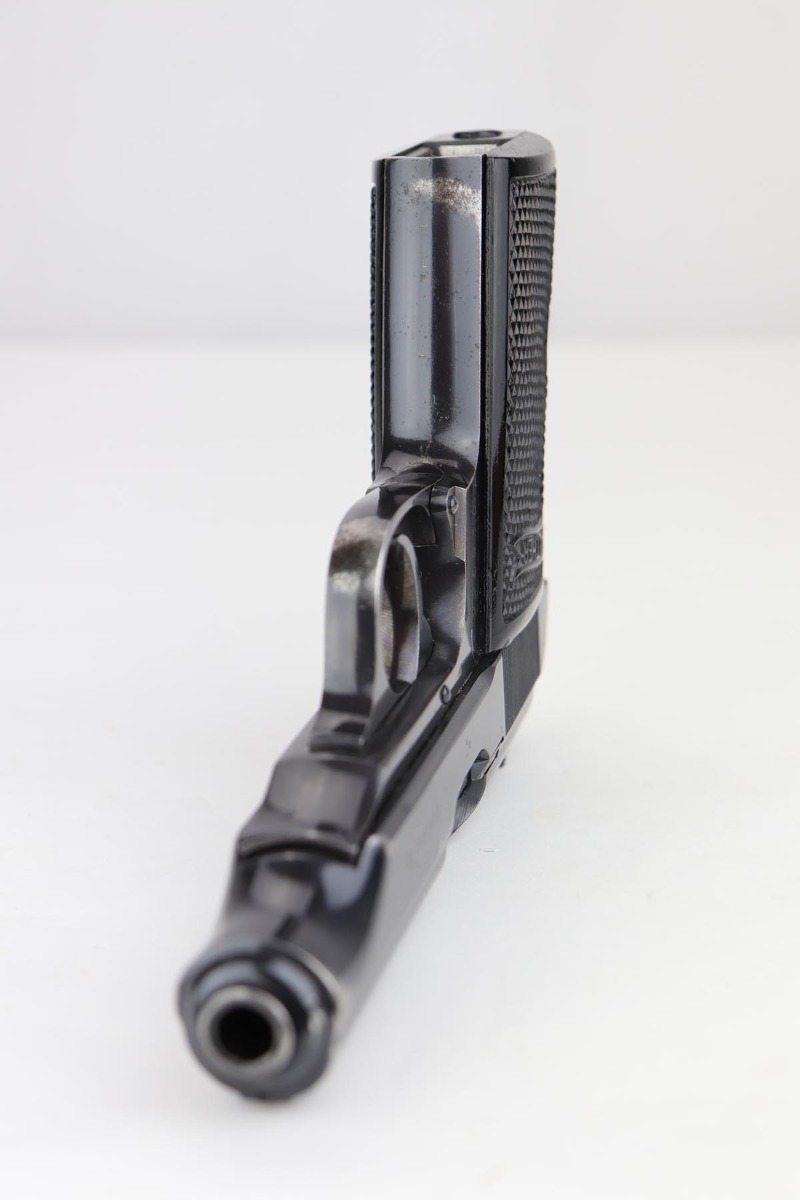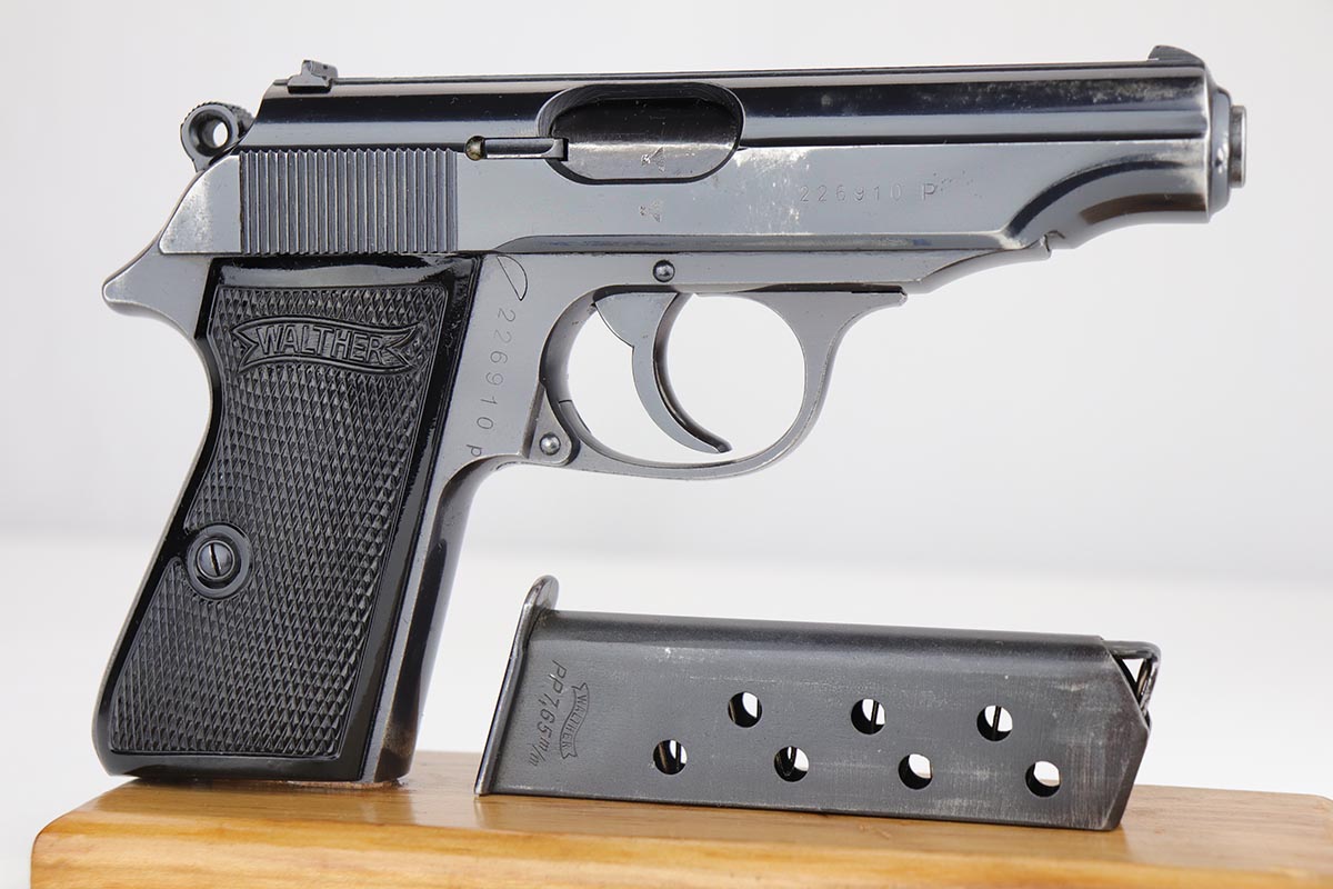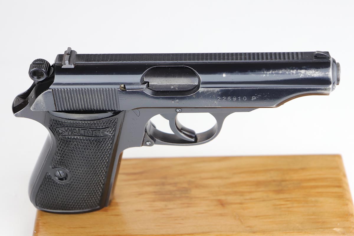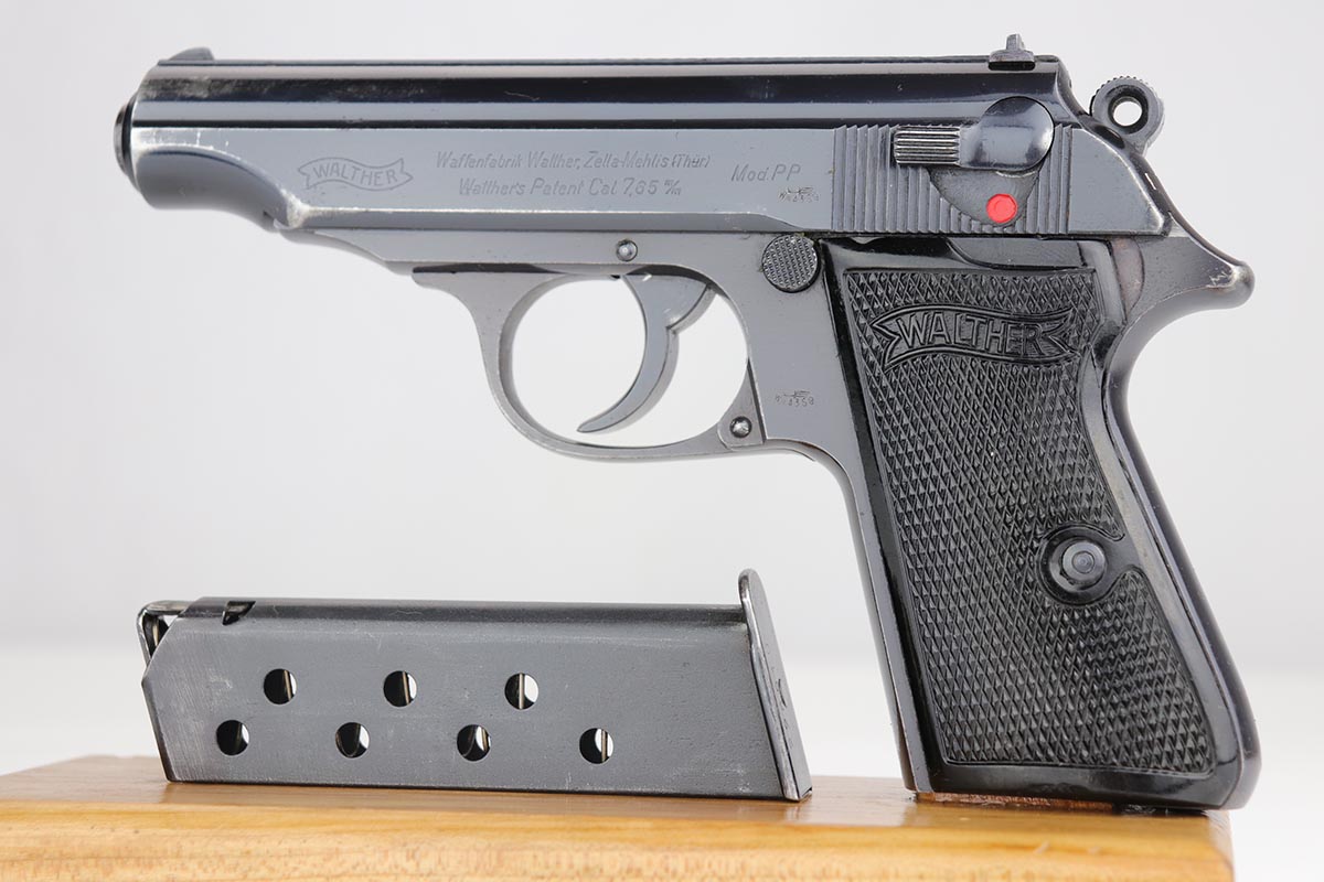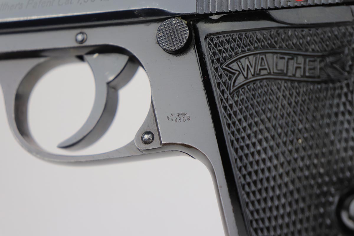 9/24/19 – This is a Luftwaffe contract Walther PP from 1940-41, with the original matching magazine. These are distinct in that they are in that they are waffen proofed on the slide and frame, feature high-polish blue and their magazines are numbered on the base plate. They were issued with two numbered magazines, but this one comes with one matching magazine. The original finish covers about 90% of the gun with a few separate areas of minor finish loss on all major areas. The gun has matching frame and slide with eagle/N proofs on the slide, barrel and ejection port. Minty bore. Excellent grips.